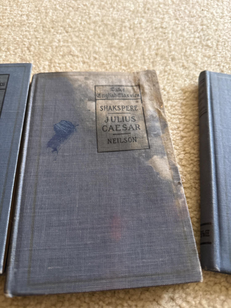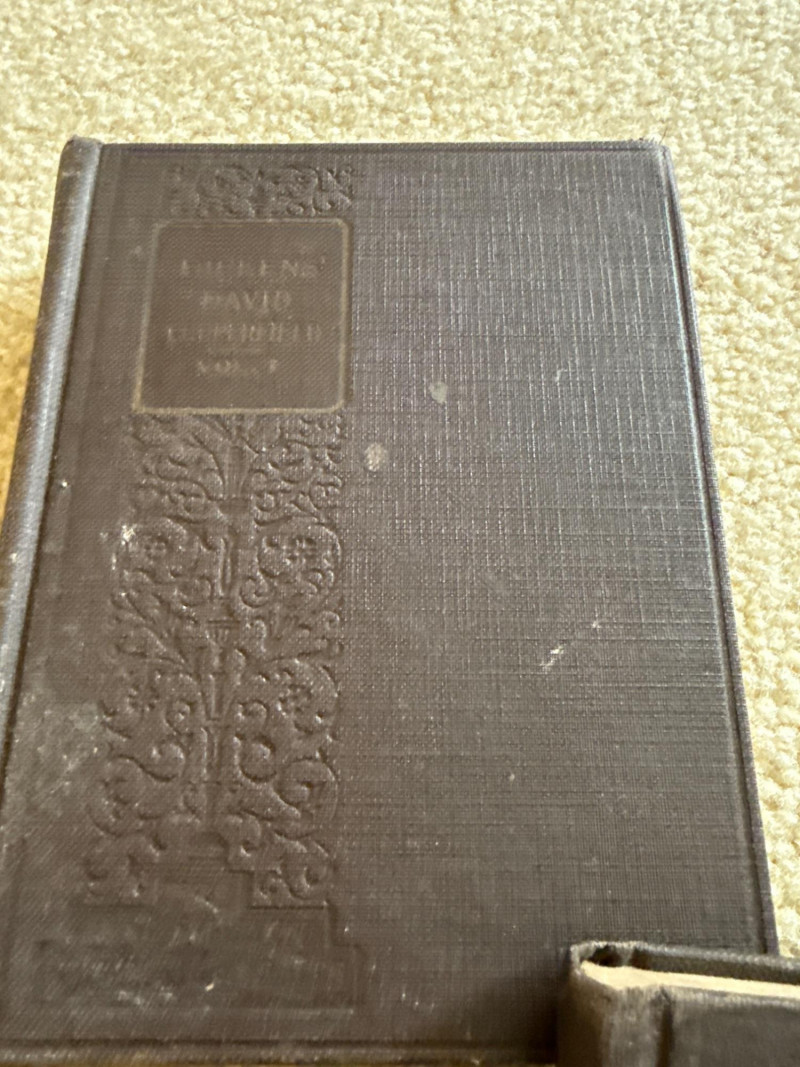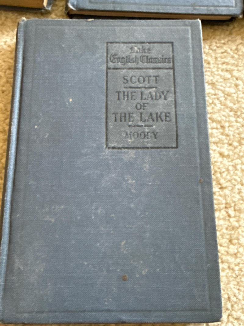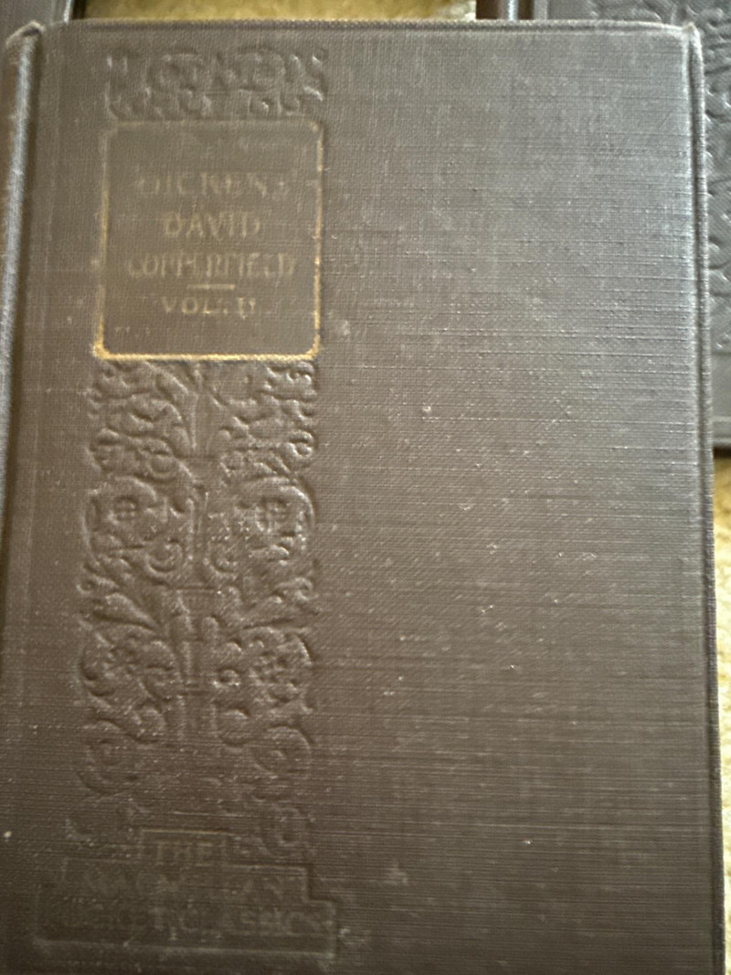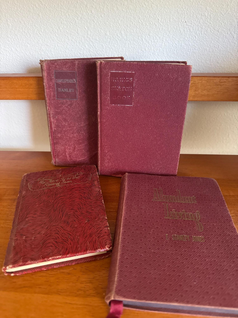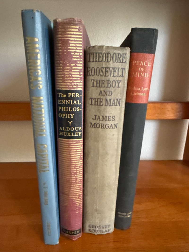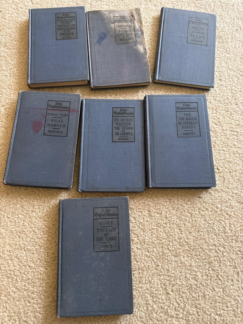 Collection of mixed antique and vintage books spanning literature, philosophy, biography, and classic English studies. Titles visible include: 7 Lake English Classics 4 Dickens Classics Peace of Mind The Perennial Philosophy Theodore Roosevelt: The Boy and The Man Additional assorted antique hardcovers
