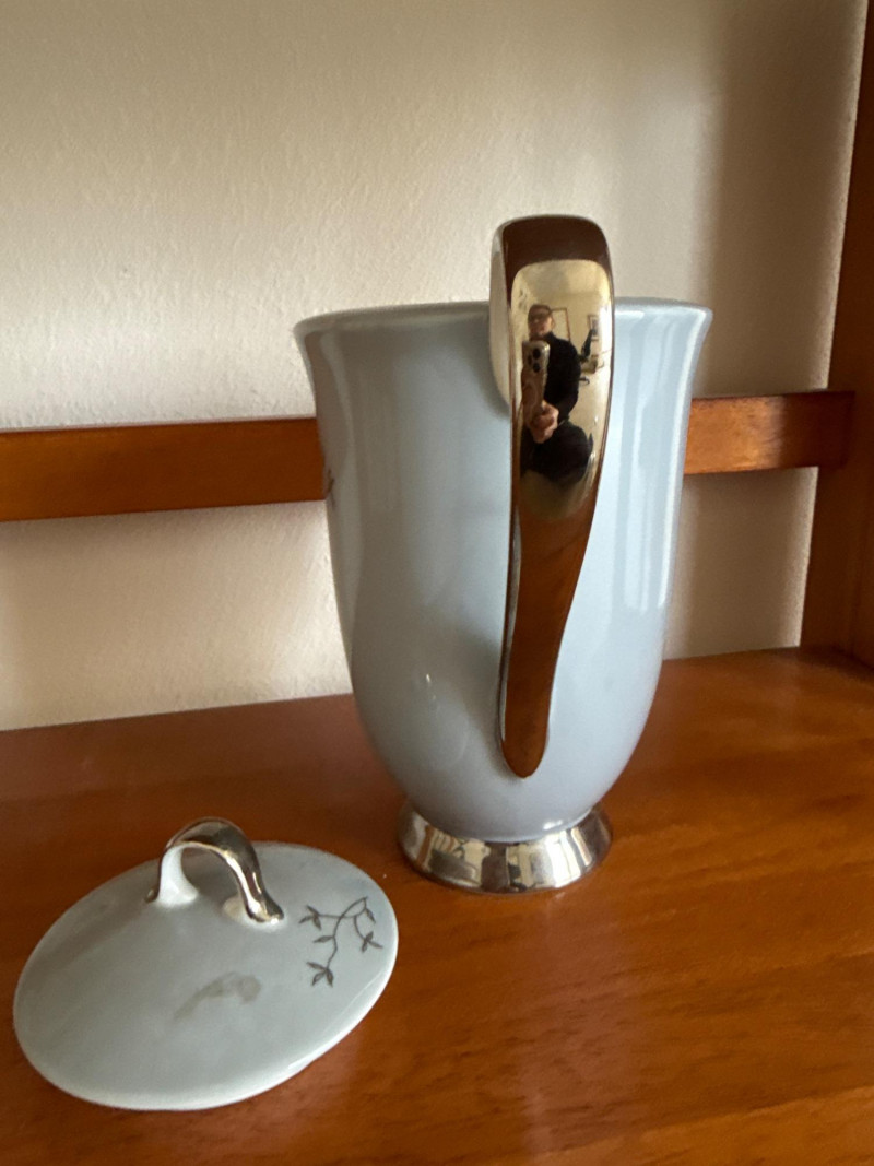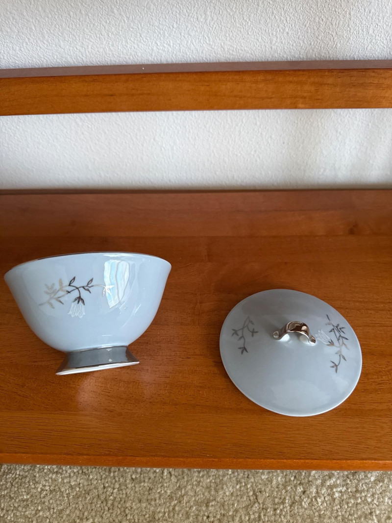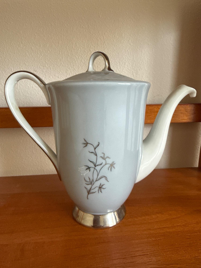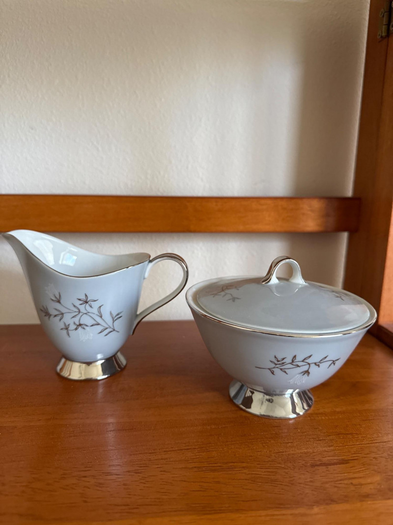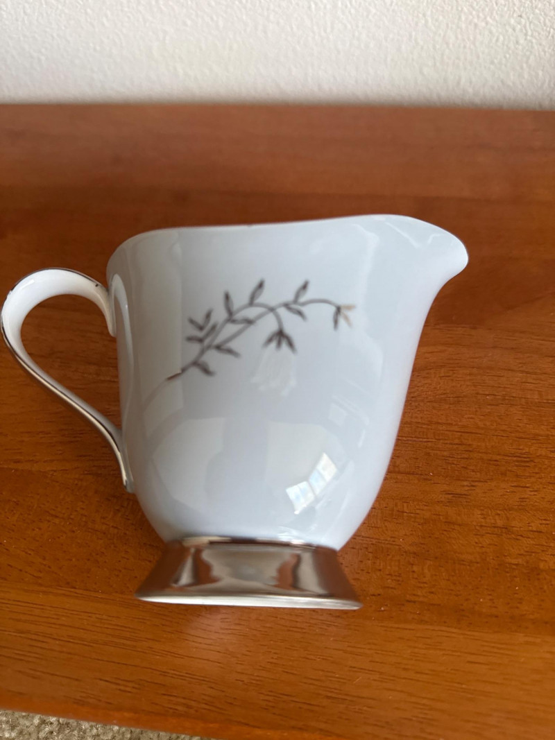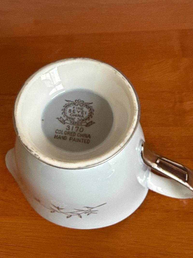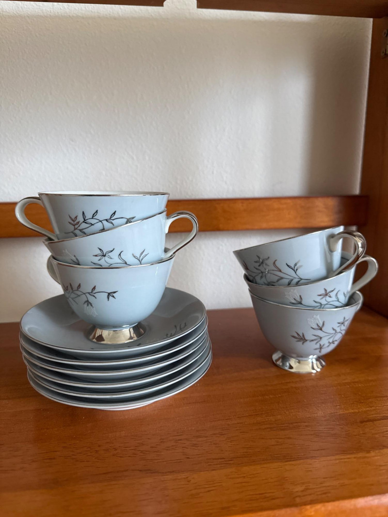 Elegant Seyei China tea set, pattern 3170, hand‑painted in soft blue with delicate branch and leaf detailing and silver‑tone bases. Set includes: Six Teacups and Saucers 1 creamer- 5 x 4 1 sugar Bowl- 4 x 2.5 1 Tea Kettle- 6.5 x 4.5