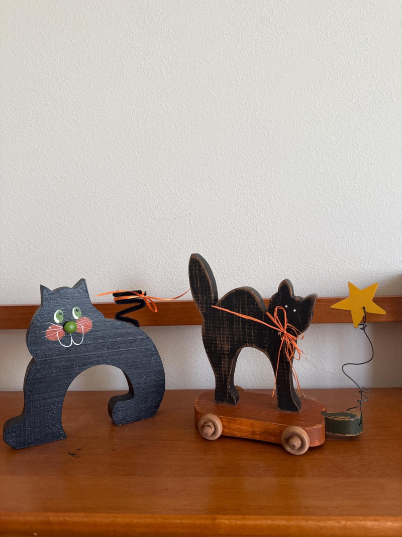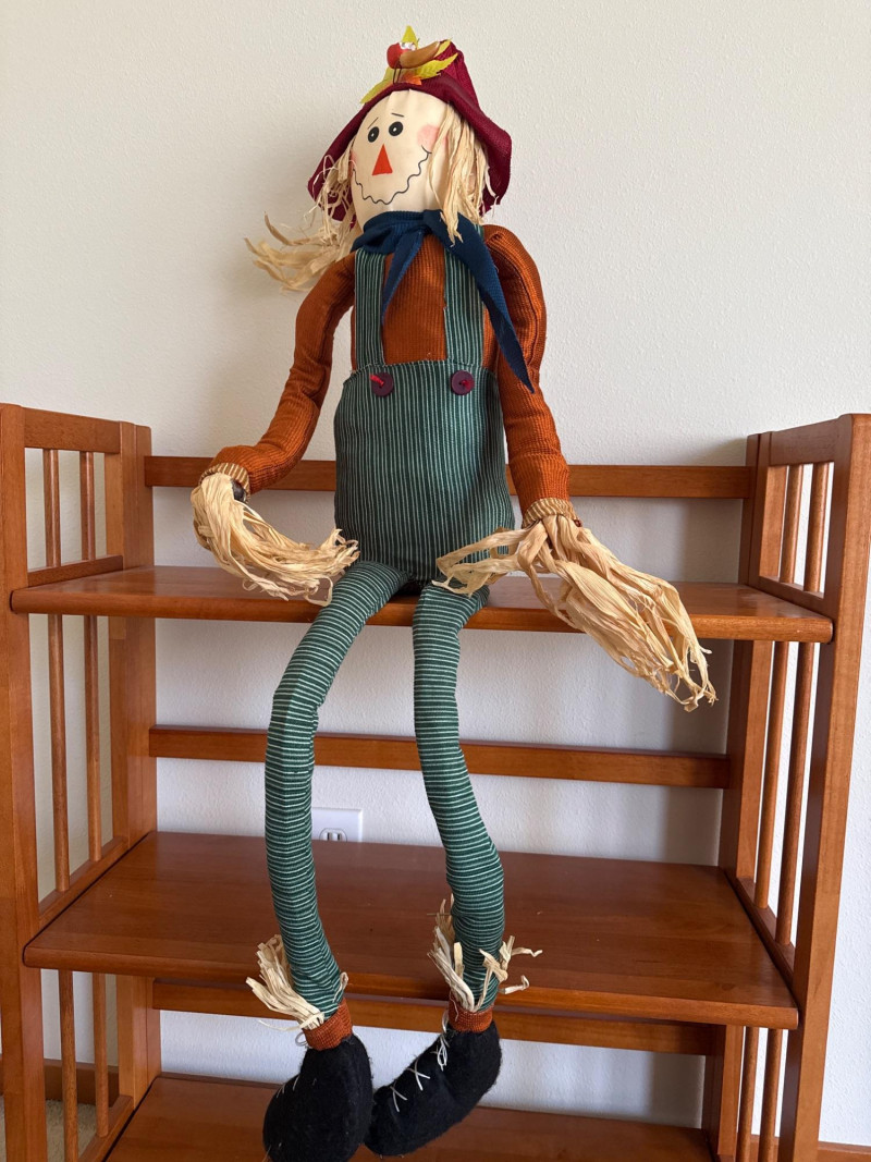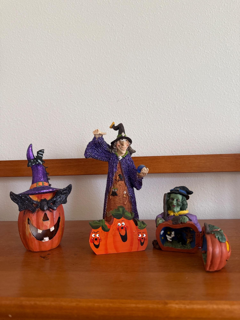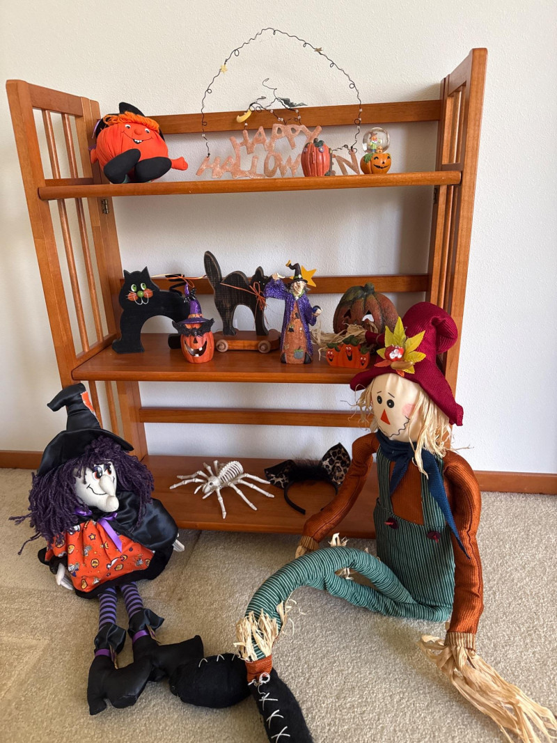 Large assortment of Halloween décor, including plush figures, tabletop decorations, and seasonal accents. Items include: Plush pumpkin character with witch hat Small pumpkin figurines and “Happy Halloween” sign with hanging ornaments Assorted black cat figures, witches, and pumpkin characters Two large floor‑display dolls: one witch and one scarecrow Skeleton spider, leopard‑print cat‑ear headband, and small plush black animal