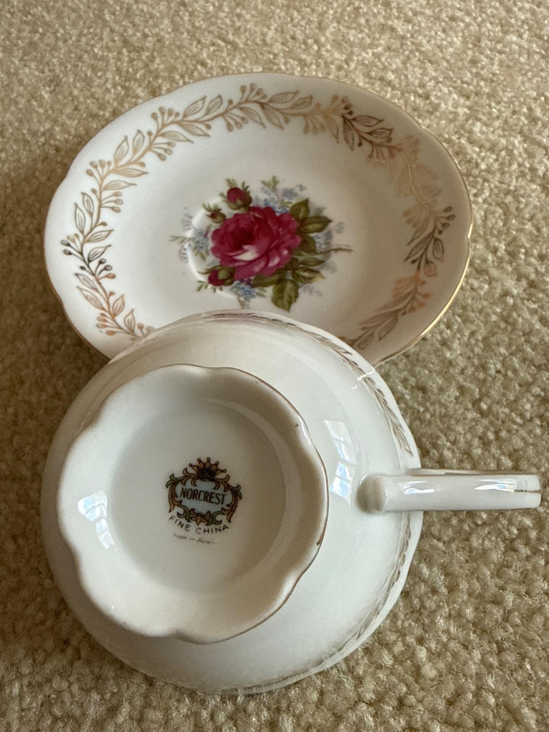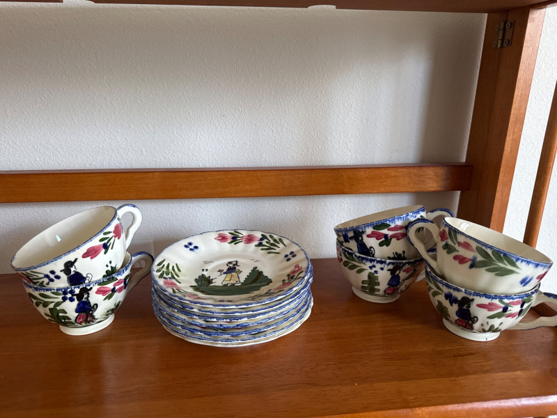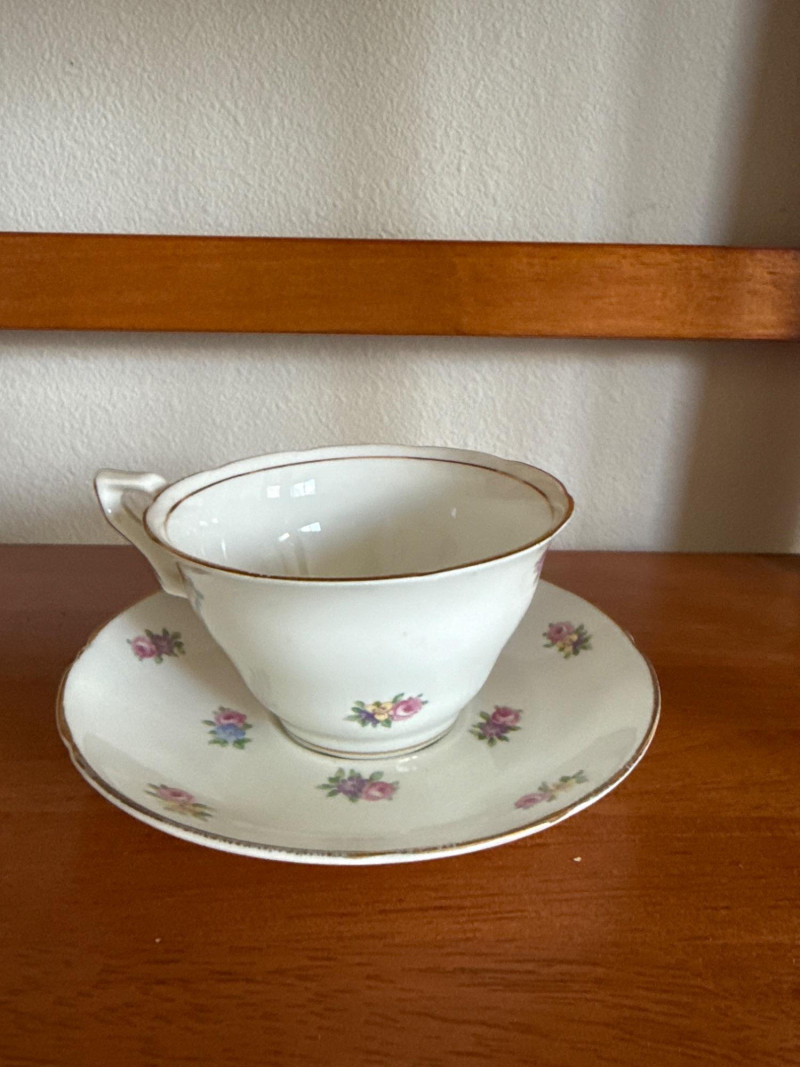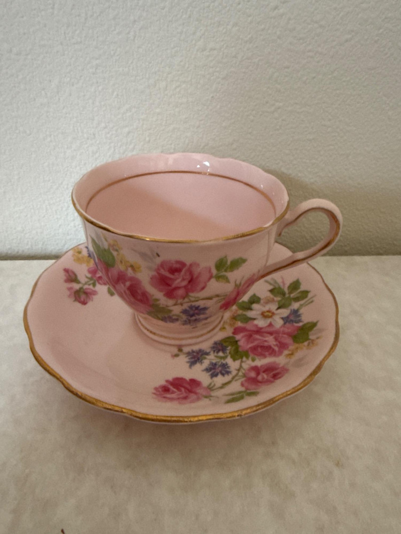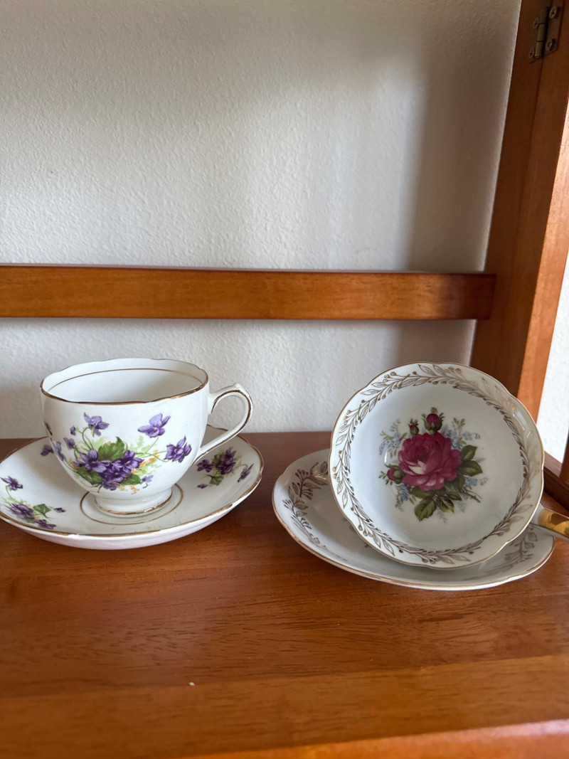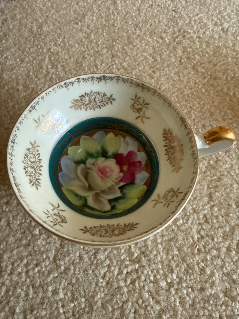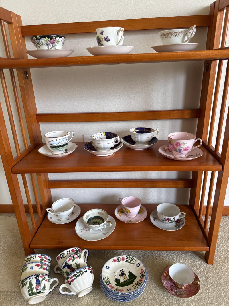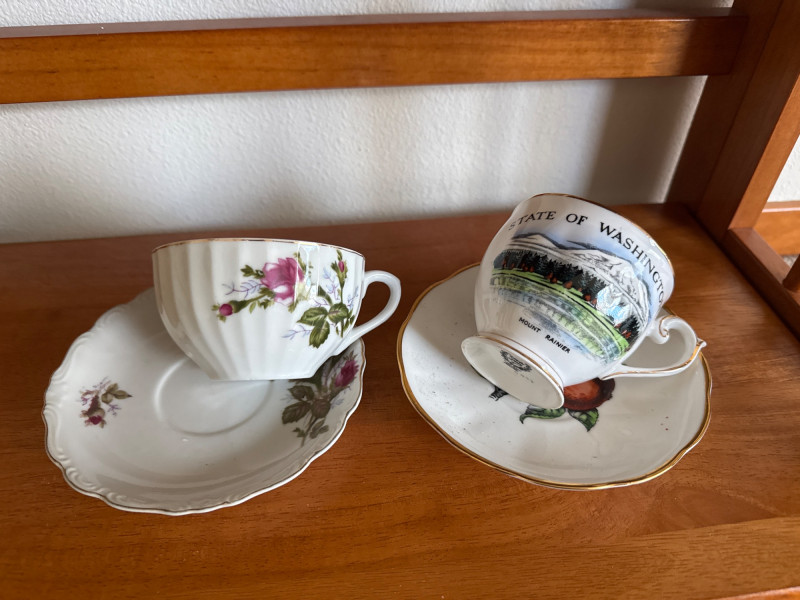 Charming assortment of 16 total vintage teacups and saucers, featuring a wide variety of floral, scenic, and decorative patterns. Collection includes: Multiple floral‑pattern teacups in pinks, blues, and mixed botanical designs State of Washington souvenir teacup Scenic and illustrated cups Folk‑art style cup and saucer set Additional mixed vintage and decorative teacups and saucers in various styles and colors