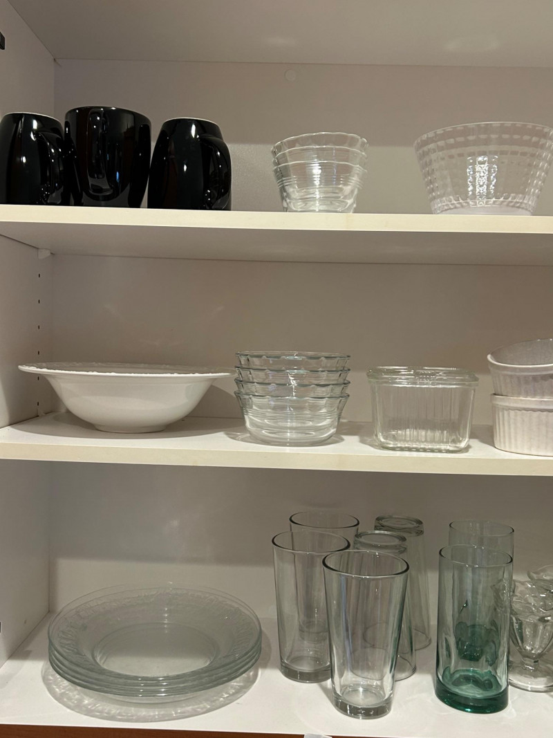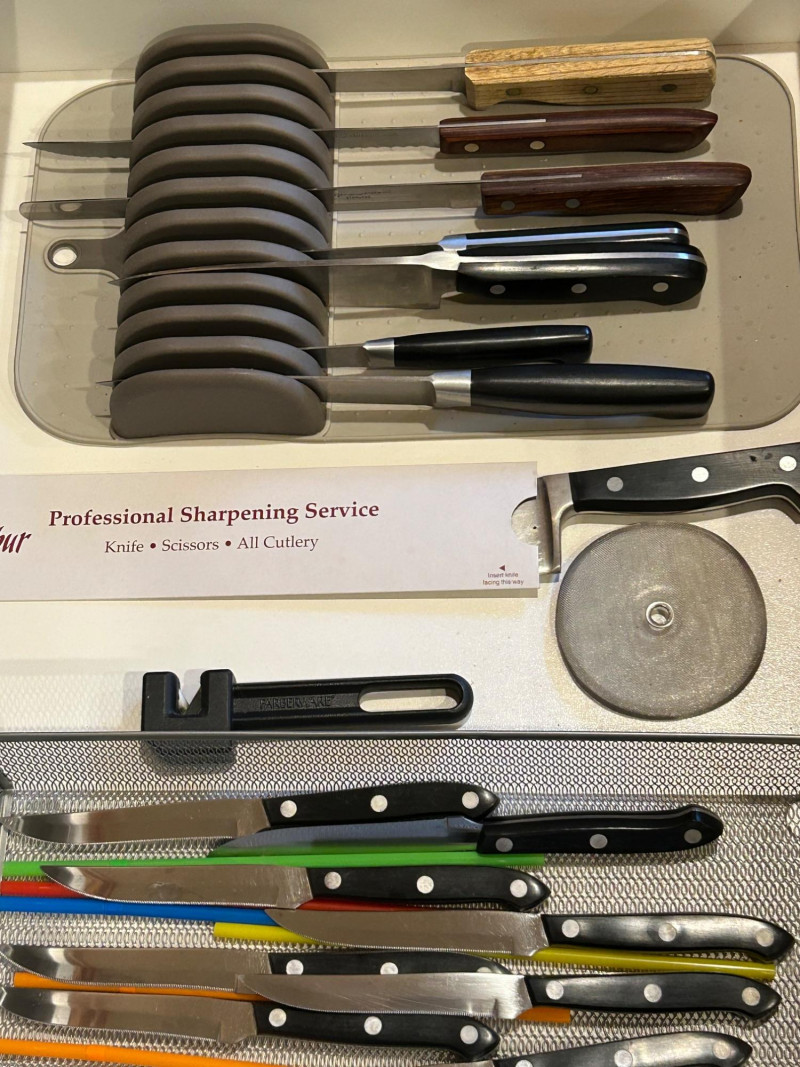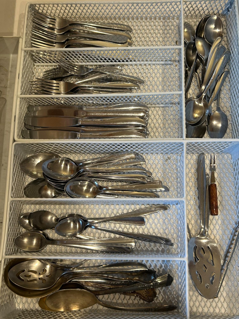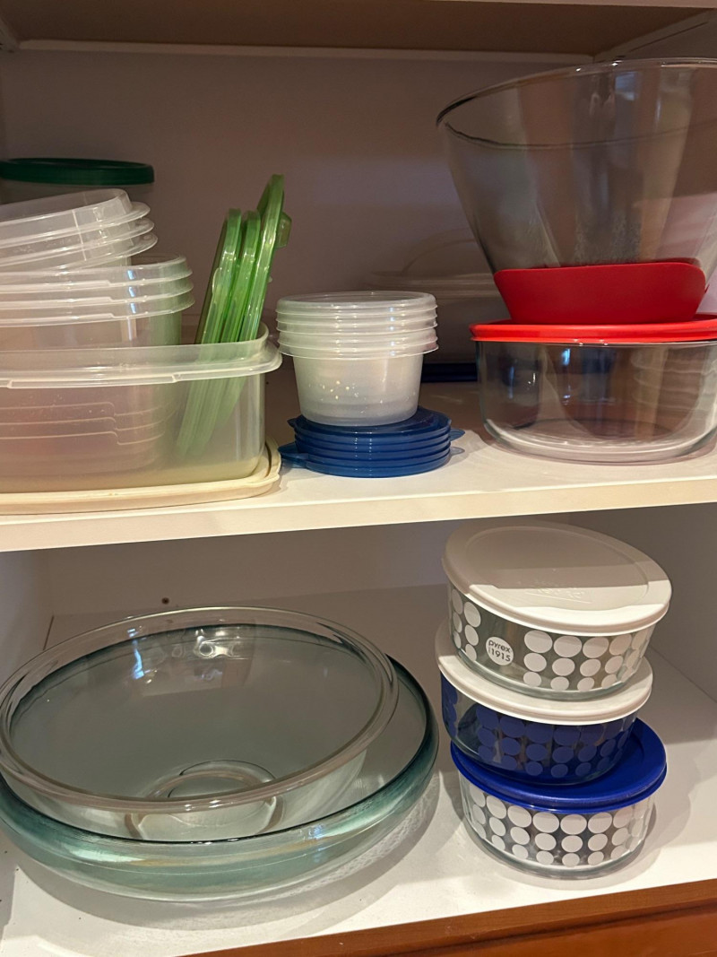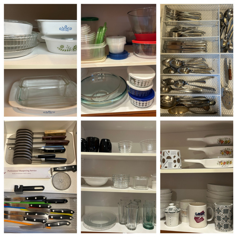 Food Storage & Prep Assorted plastic food‑storage containers with matching lids (various sizes, colors) Glass mixing bowls and patterned storage bowls Glass baking dishes and ceramic bakeware, including floral‑patterned pieces Knives & Utensils Multiple kitchen knives Knife block drawer inserts Pizza cutter, sharpening steel, and miscellaneous prep tools Silverware set neatly organized: forks, spoons, knives, and serving utensils Drinkware & Dinnerware Black mugs, clear glass bowls, and drinking glasses White ceramic plates, bowls, mugs, and serving pieces