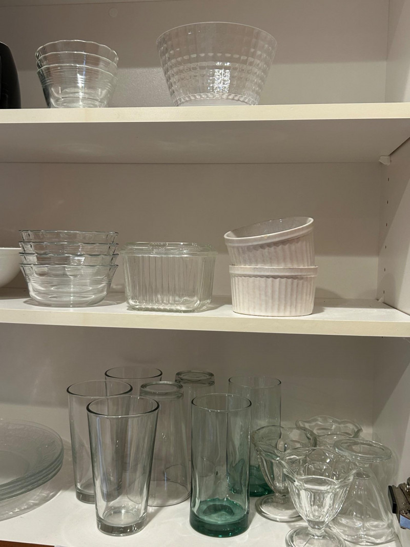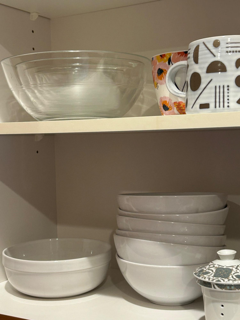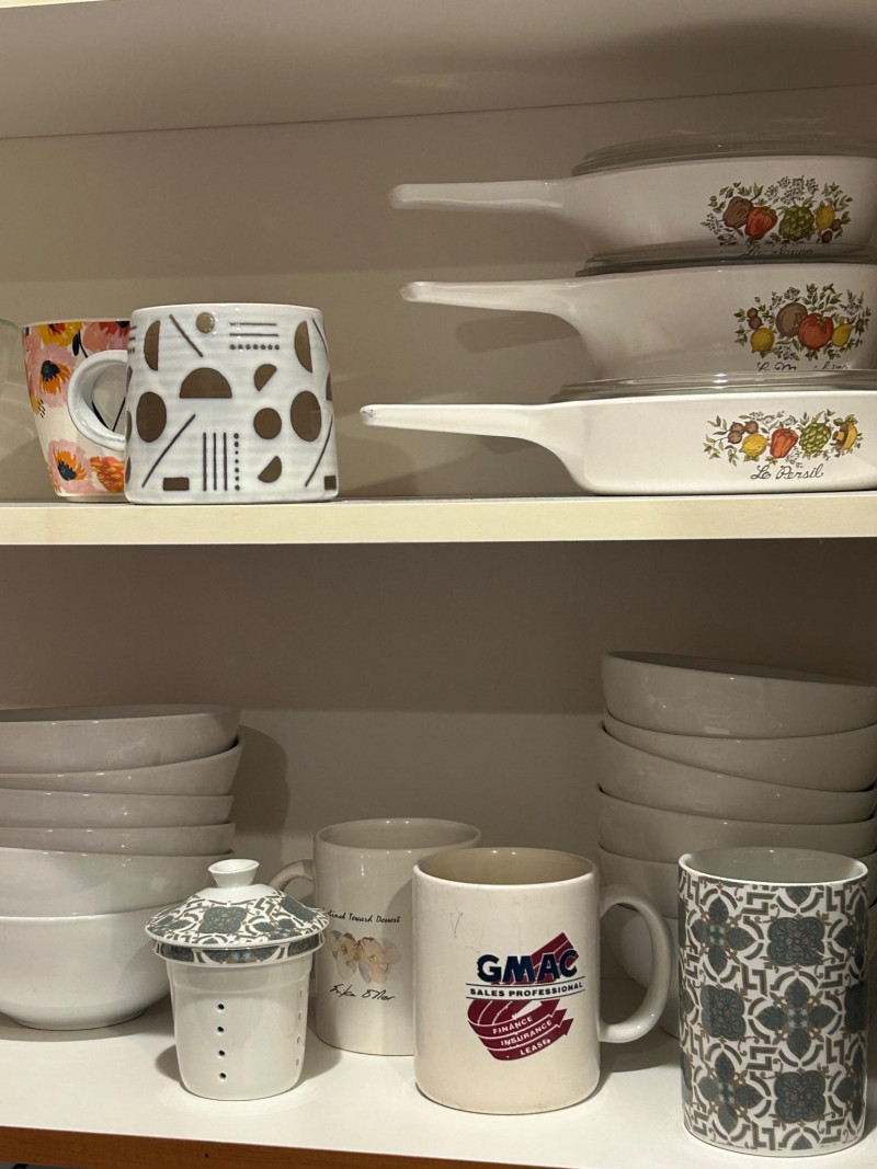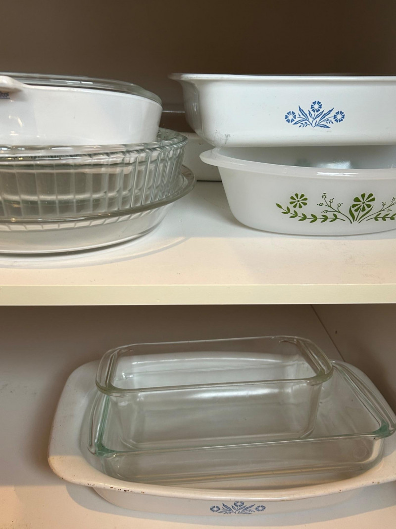Food Storage & Prep Assorted plastic food‑storage containers with matching lids (various sizes, colors) Glass mixing bowls and patterned storage bowls Glass baking dishes and ceramic bakeware, including floral‑patterned pieces Knives & Utensils Multiple kitchen knives Knife block drawer inserts Pizza cutter, sharpening steel, and miscellaneous prep tools Silverware set neatly organized: forks, spoons, knives, and serving utensils Drinkware & Dinnerware Black mugs, clear glass bowls, and drinking glasses White ceramic plates, bowls, mugs, and serving pieces