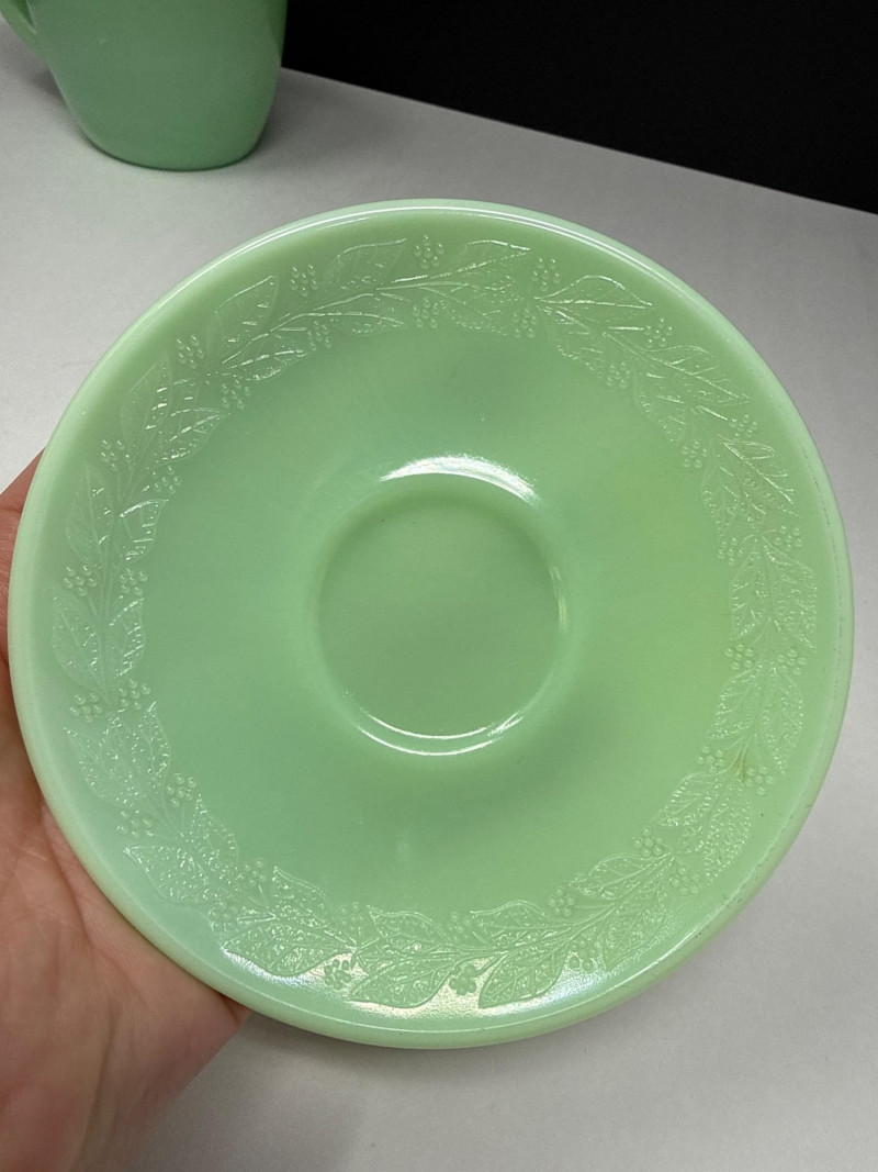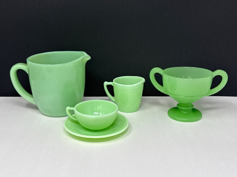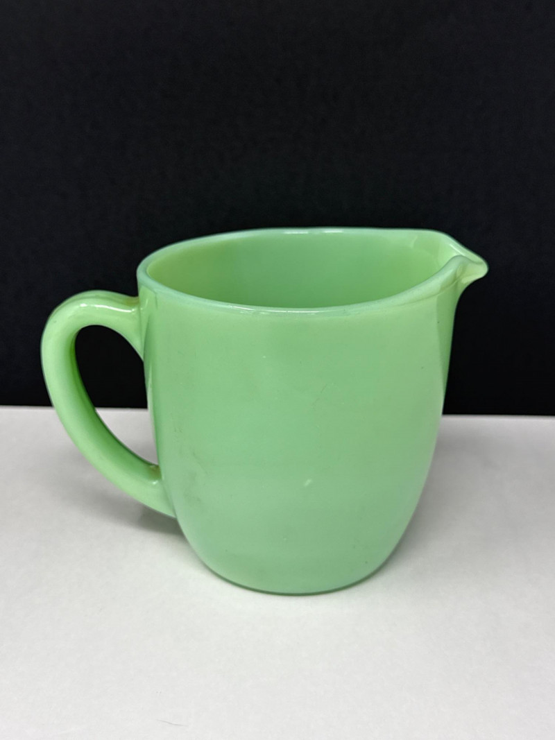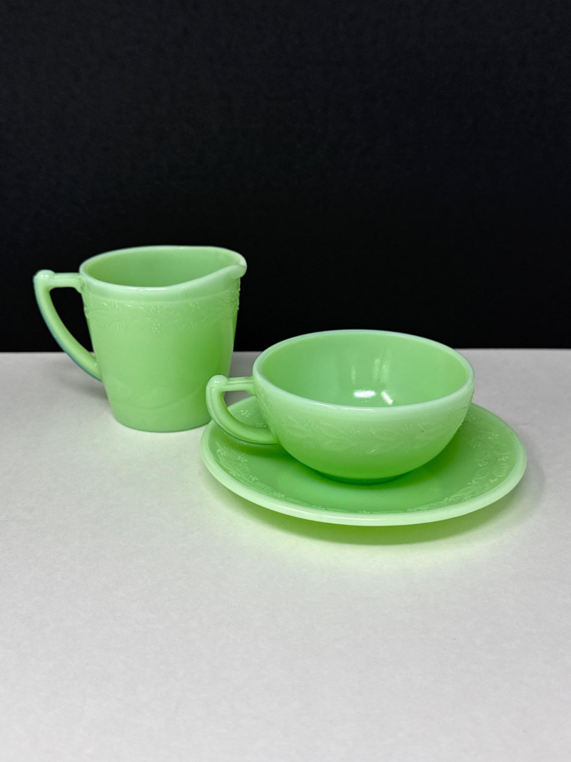 A beautiful 5-piece collection of vintage American Jadeite glass, showcasing the iconic "Opaque Green" milk glass. Items Included (5 Pieces Total): Fire-King Pitcher: A classic mid-century creamer/small pitcher. Stands 4.75” H. Cup & Saucer: A matching 2-piece set. Cup stands 1.5” H. Fenton Footed Urn: A highly textured decorative piece with ornate handles. Stands 3.5” H. Small Jadeite Bowl/Dish: Small pitcher like dish that matches the pattern on the cup & saucer. All are in great vintage/antique condition.