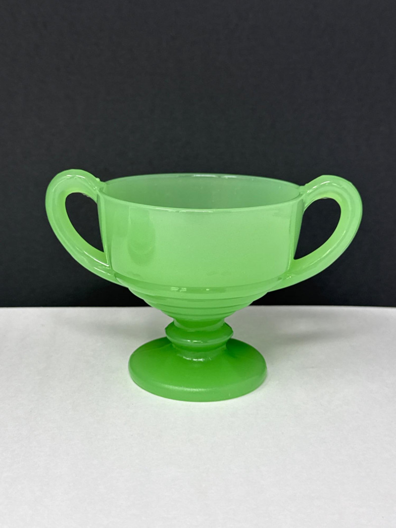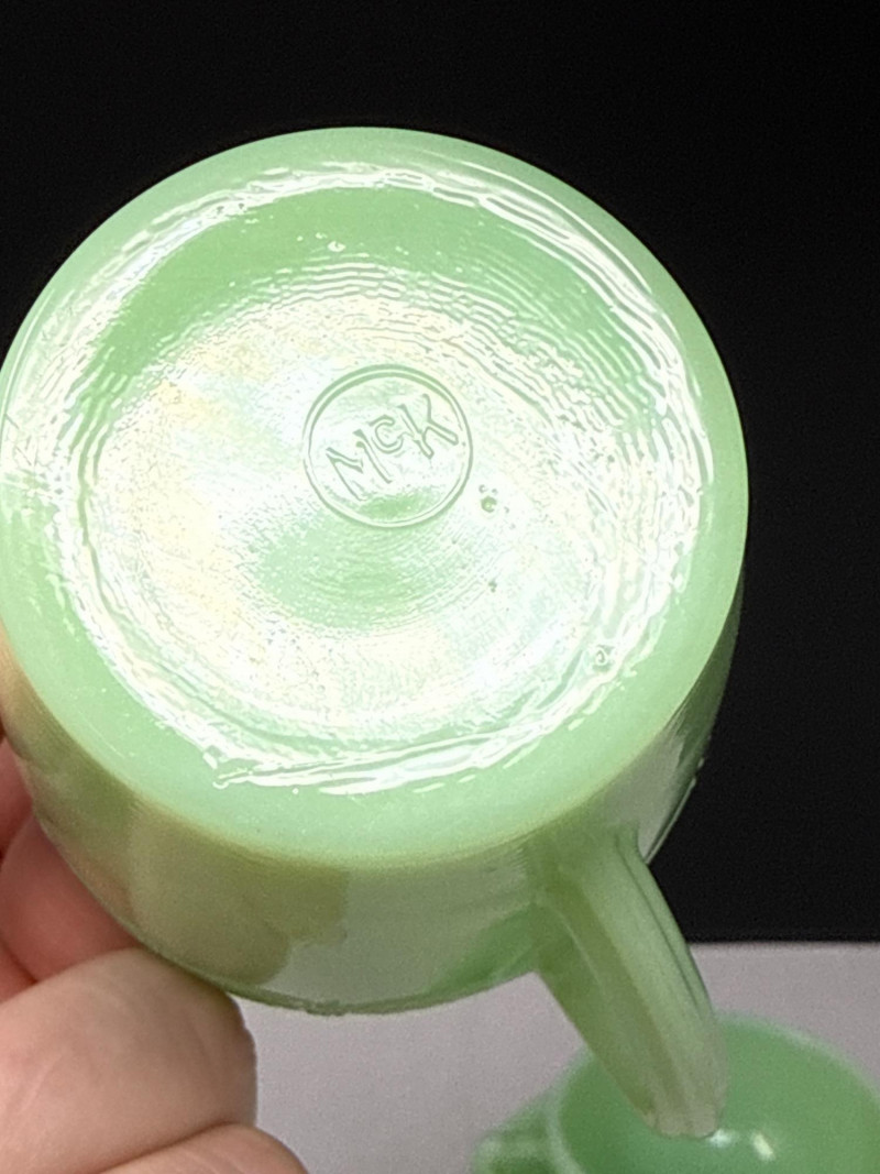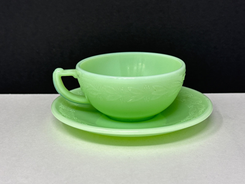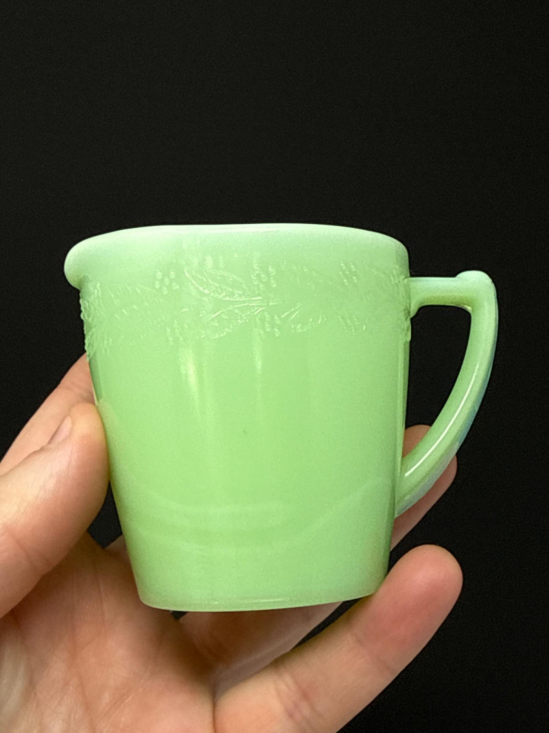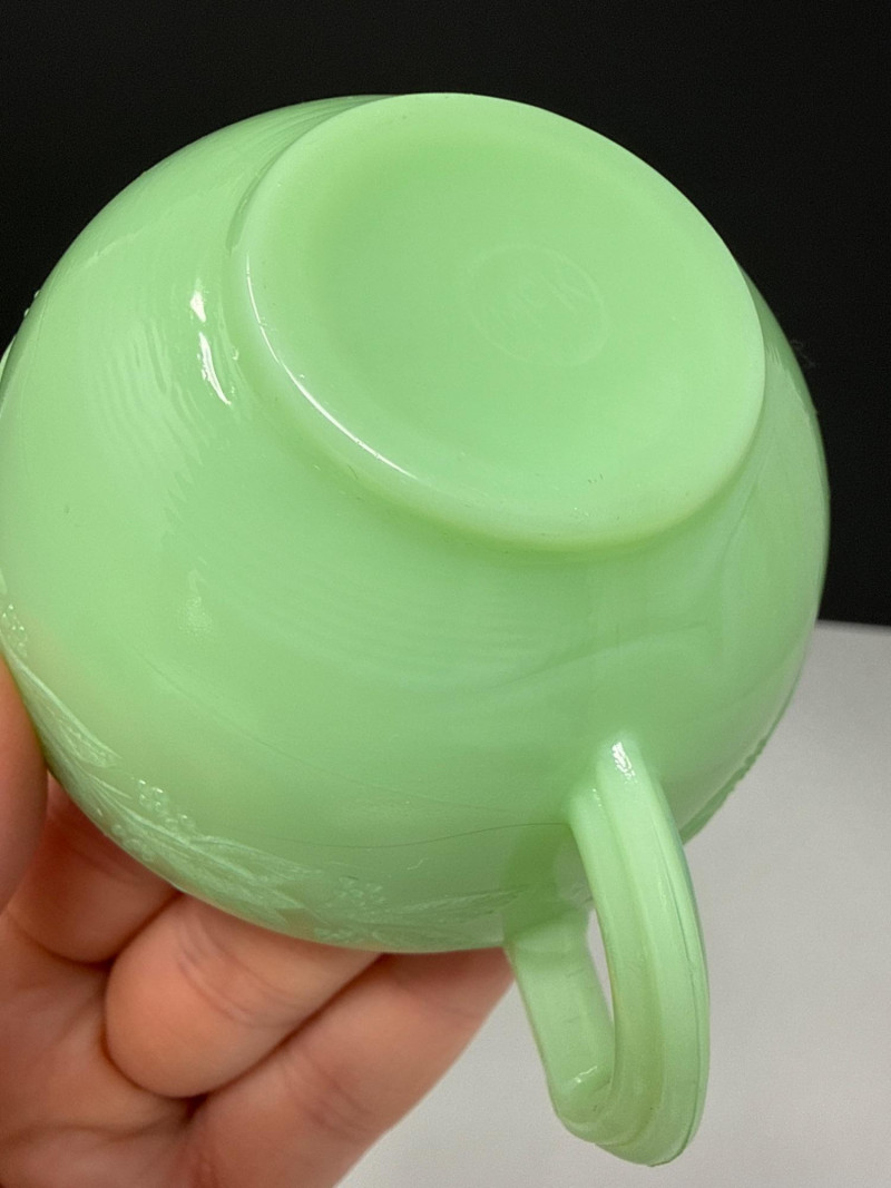 A beautiful 5-piece collection of vintage American Jadeite glass, showcasing the iconic "Opaque Green" milk glass. Items Included (5 Pieces Total): Fire-King Pitcher: A classic mid-century creamer/small pitcher. Stands 4.75” H. Cup & Saucer: A matching 2-piece set. Cup stands 1.5” H. Fenton Footed Urn: A highly textured decorative piece with ornate handles. Stands 3.5” H. Small Jadeite Bowl/Dish: Small pitcher like dish that matches the pattern on the cup & saucer. All are in great vintage/antique condition.