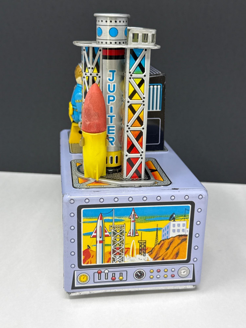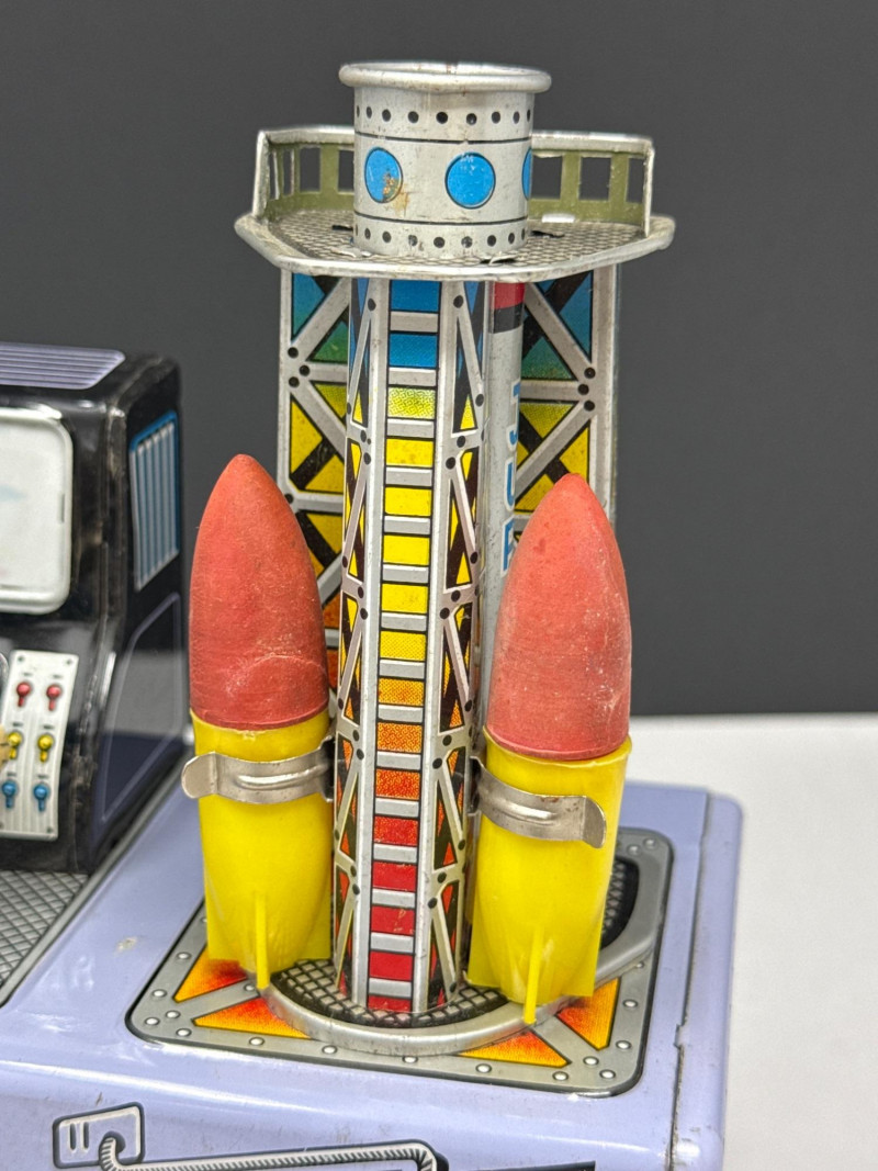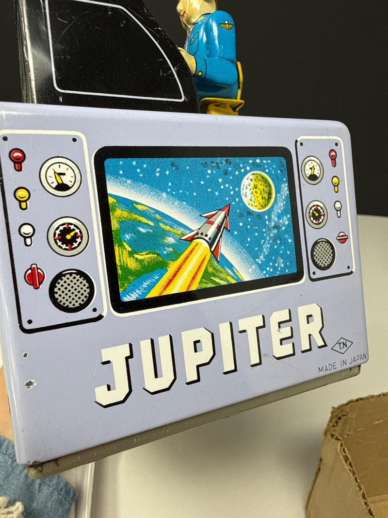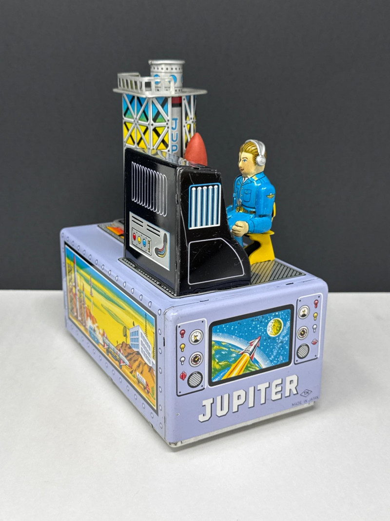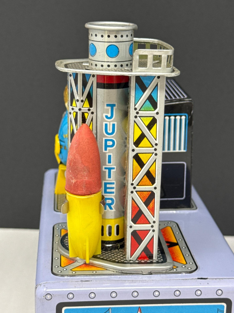 NOMURA 1950’s Japan Jupiter Rocket Launcher Tin Toy Manufacturer: Produced by Nomura (T.N) in Japan, a company well-known for high-quality tin lithograph toys during the mid-20th century. Era: Circa 1950s, reflecting the "Space Age" fascination of that decade. Material: Primarily lithographed tin, featuring vibrant colors and intricate mechanical graphics. The Rocket: The toy features a central "Jupiter" rocket (finished in yellow and red) positioned within a tall, orange-and-white lattice-style gantry or launch tower. The Base: The base is light blue/grey and decorated with "control panel" lithography, including dials, buttons, and switches to simulate a real launch site. Characters: It includes a small tin astronaut/operator figure sitting at a control station on the base. Back Detail: There is a screen-like graphic on the back with "JUPITER" branding and a cosmic illustration of a rocket in space. Manufacturer: Nomura (T.N), Japan. Model: Jupiter Rocket Launcher. Era: 1950s.
