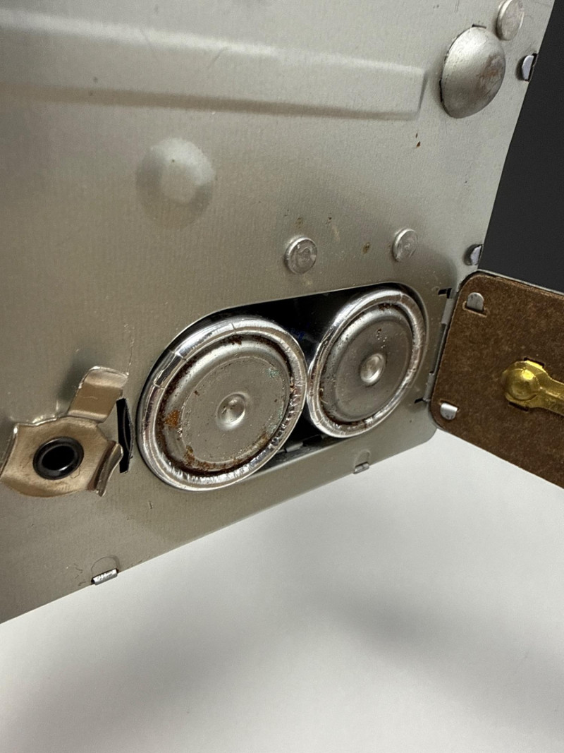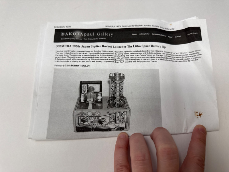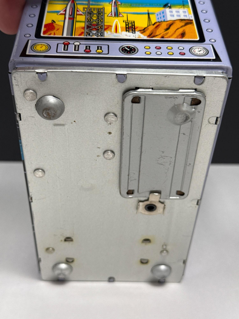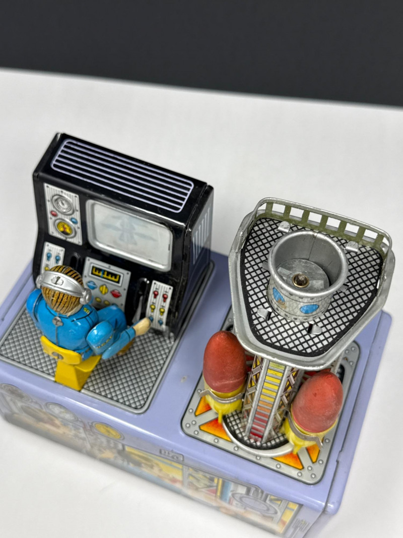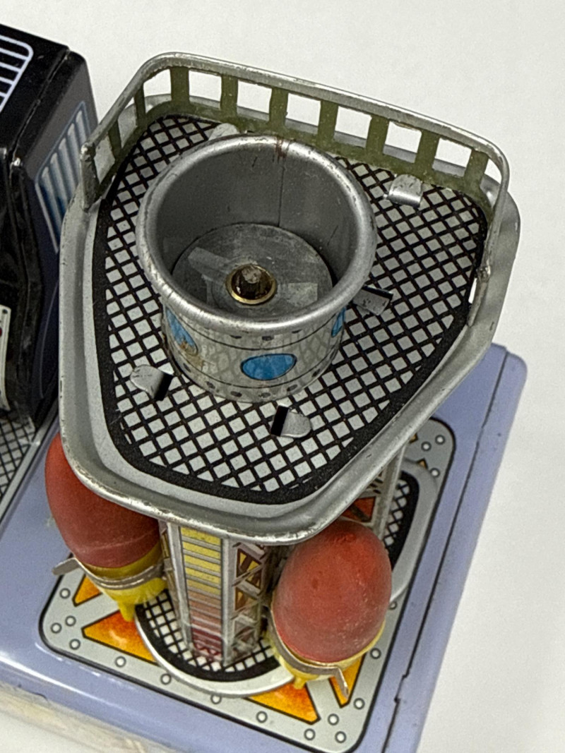 NOMURA 1950’s Japan Jupiter Rocket Launcher Tin Toy Manufacturer: Produced by Nomura (T.N) in Japan, a company well-known for high-quality tin lithograph toys during the mid-20th century. Era: Circa 1950s, reflecting the "Space Age" fascination of that decade. Material: Primarily lithographed tin, featuring vibrant colors and intricate mechanical graphics. The Rocket: The toy features a central "Jupiter" rocket (finished in yellow and red) positioned within a tall, orange-and-white lattice-style gantry or launch tower. The Base: The base is light blue/grey and decorated with "control panel" lithography, including dials, buttons, and switches to simulate a real launch site. Characters: It includes a small tin astronaut/operator figure sitting at a control station on the base. Back Detail: There is a screen-like graphic on the back with "JUPITER" branding and a cosmic illustration of a rocket in space. Manufacturer: Nomura (T.N), Japan. Model: Jupiter Rocket Launcher. Era: 1950s.