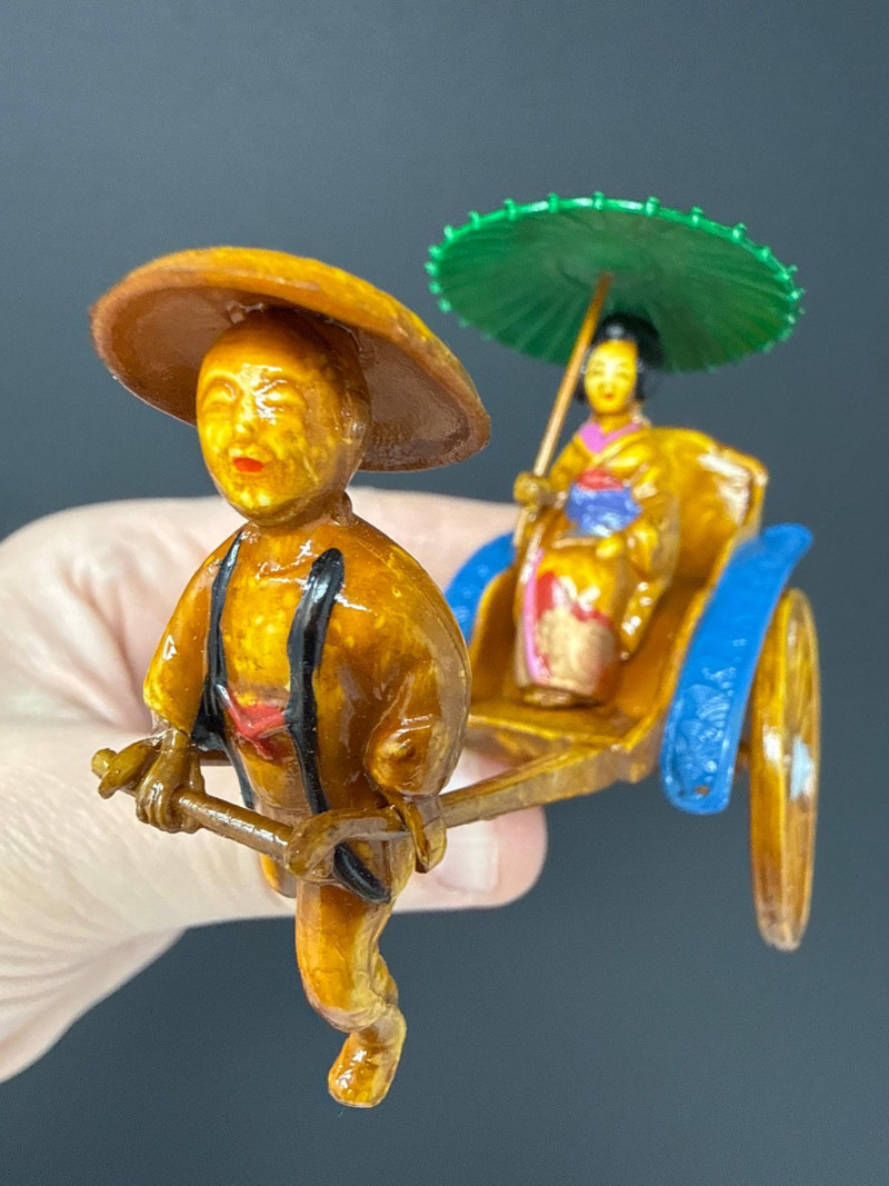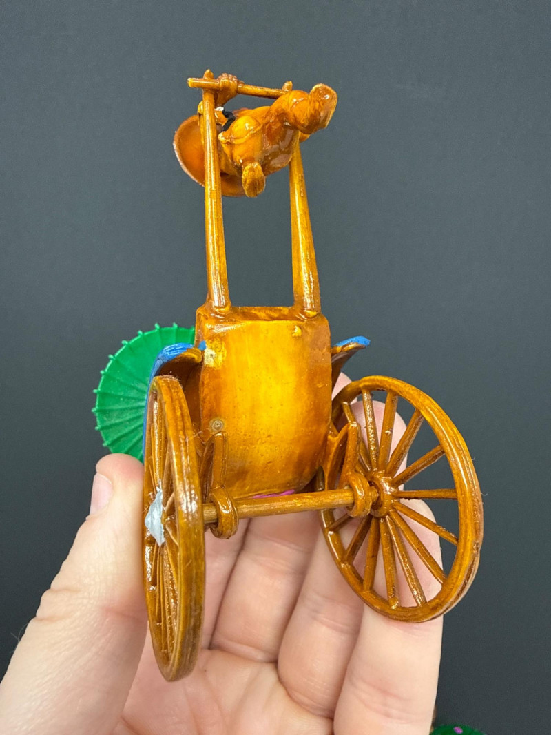 These miniatures vintage Chinese Rickshaw figurines are a testament to traditional craftsmanship, likely utilizing pith paper or natural fiber techniques to create lifelike textures and vibrant colors. Each piece tells a story of historical transport, making them excellent conversation starters for any display shelf or curio cabinet. Good Vintage Condition