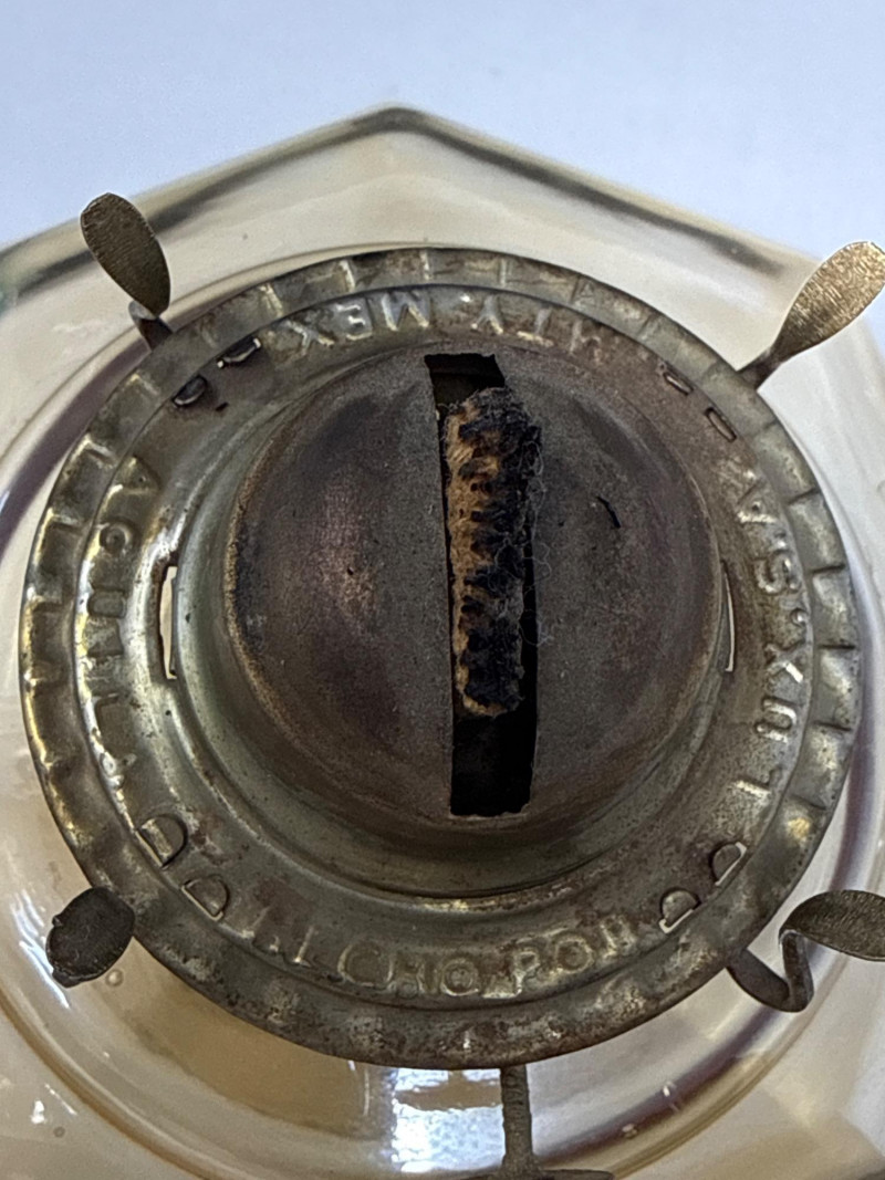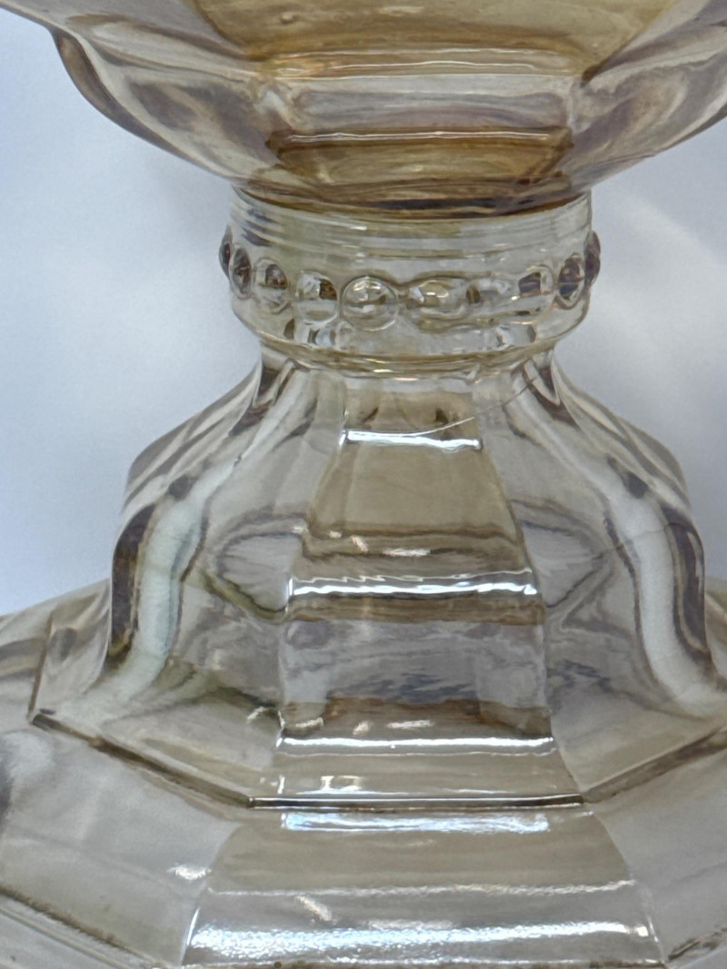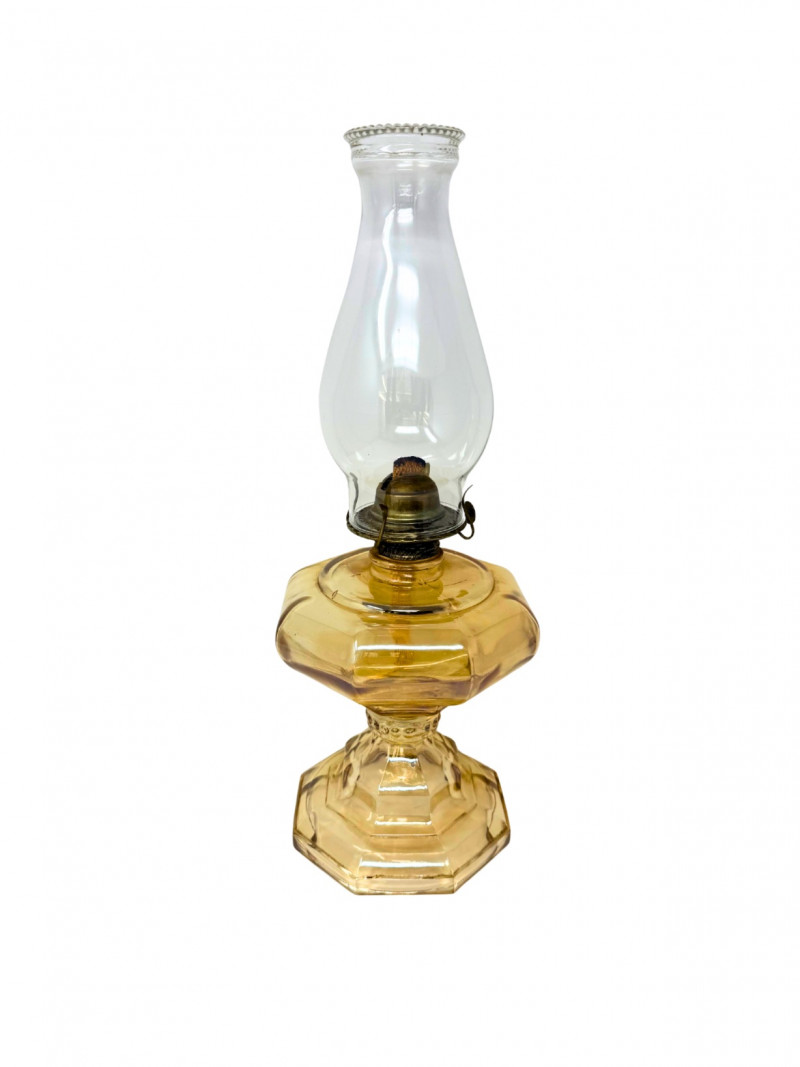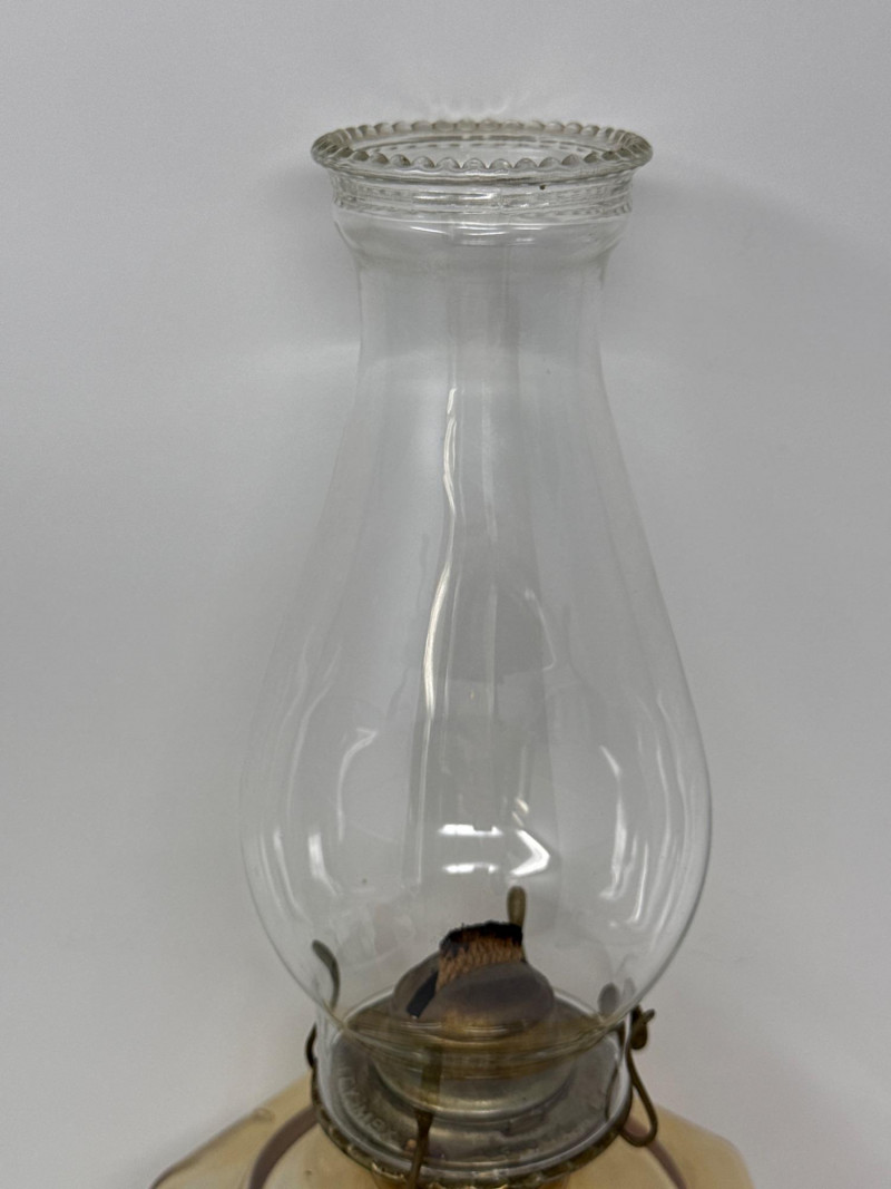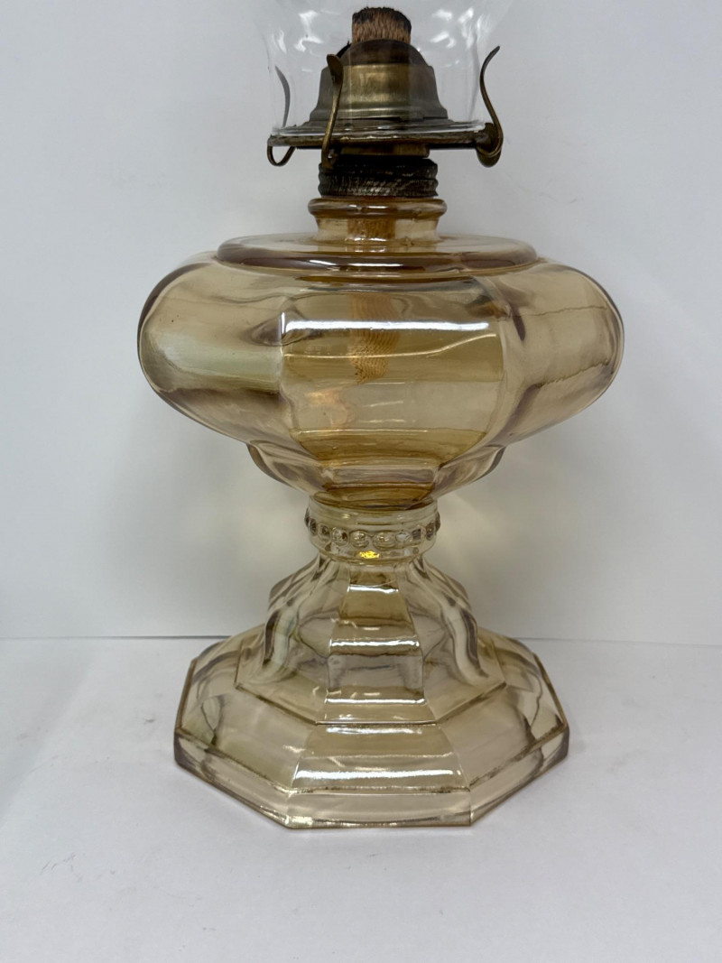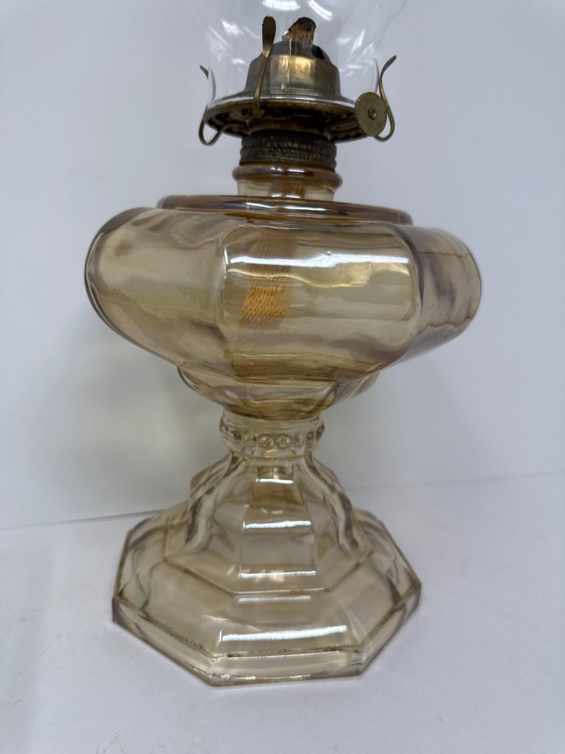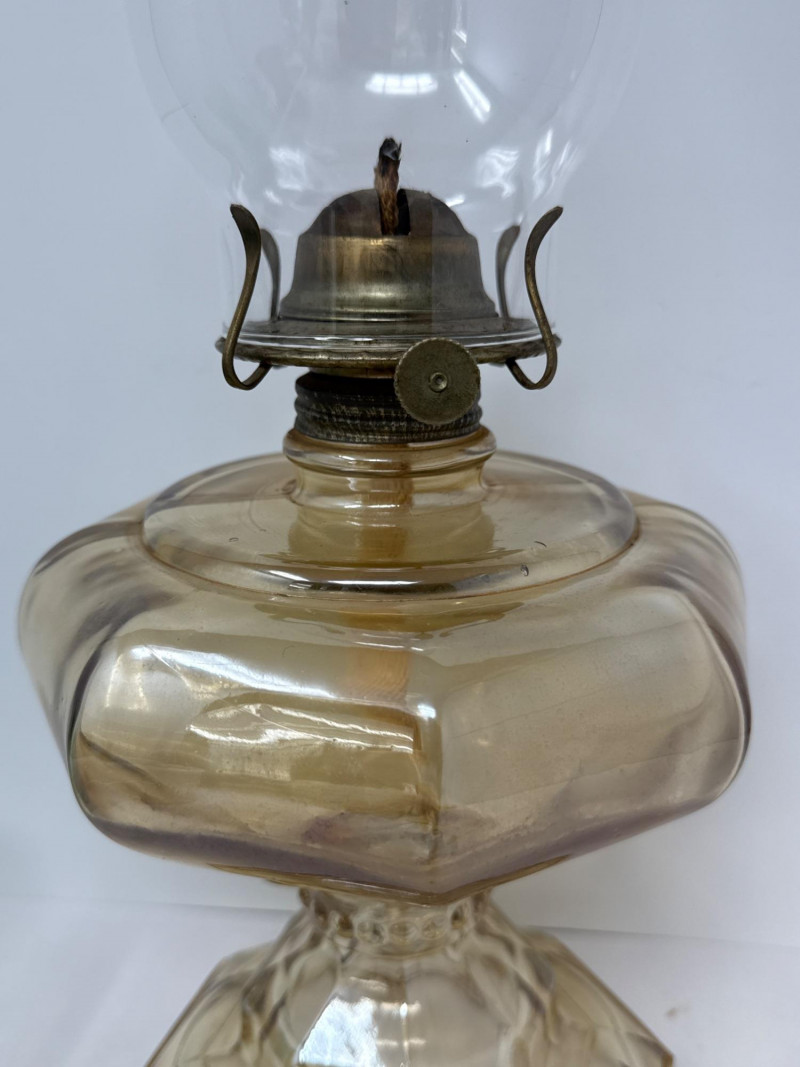 This elegant antique oil lamp features a beautiful combination of warm tones and classic materials. The body is crafted from a light amber glass with a delicate iridescent luster finish, giving it a soft, glowing quality even when not lit. **I tried to highlight the amber color in the photos. None of the photos accurately depict the proper hue. It's a delicate amber/pink/gold hue. Marked Hechopor around brass fitting on top of the lamp. The lamp is in beautiful condition. The hurricane is clear, base is the colored glass.