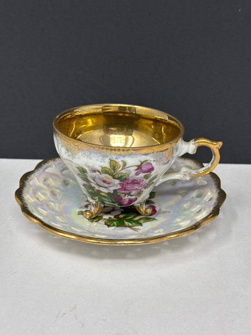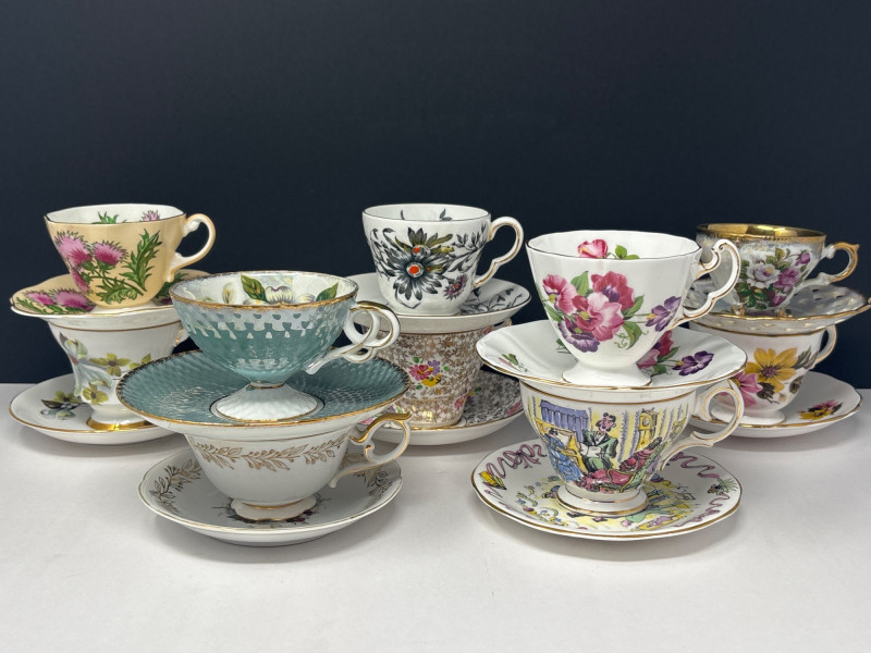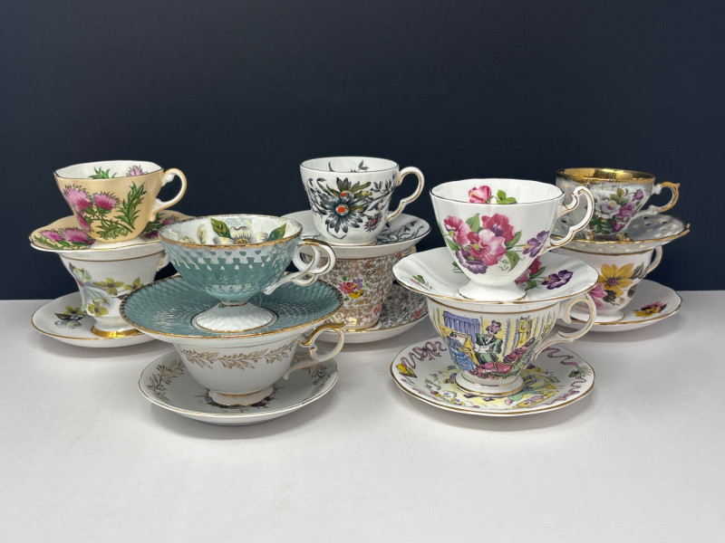 A charming 20-piece assembly (10 cups and 10 matching saucers) featuring a variety of elegant floral and gilded designs. This collection spans several continents and styles, ranging from delicate Japanese porcelain to classic English bone china. These pieces are perfect for a mismatched tea party set, "grandmillennial" decor, or as a foundational collection for a new hobbyist. There will be four total lots of these style of teacups in this auction. Good vintage/antique condition. Wear is typical for age.