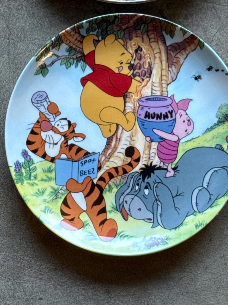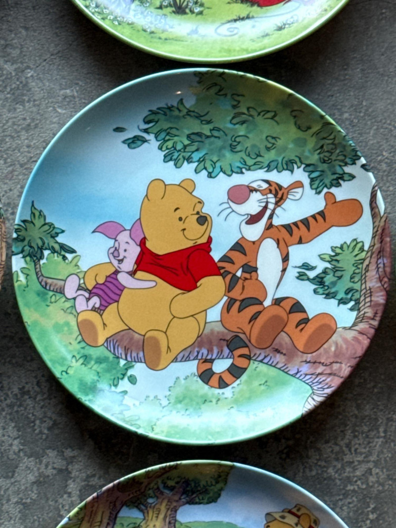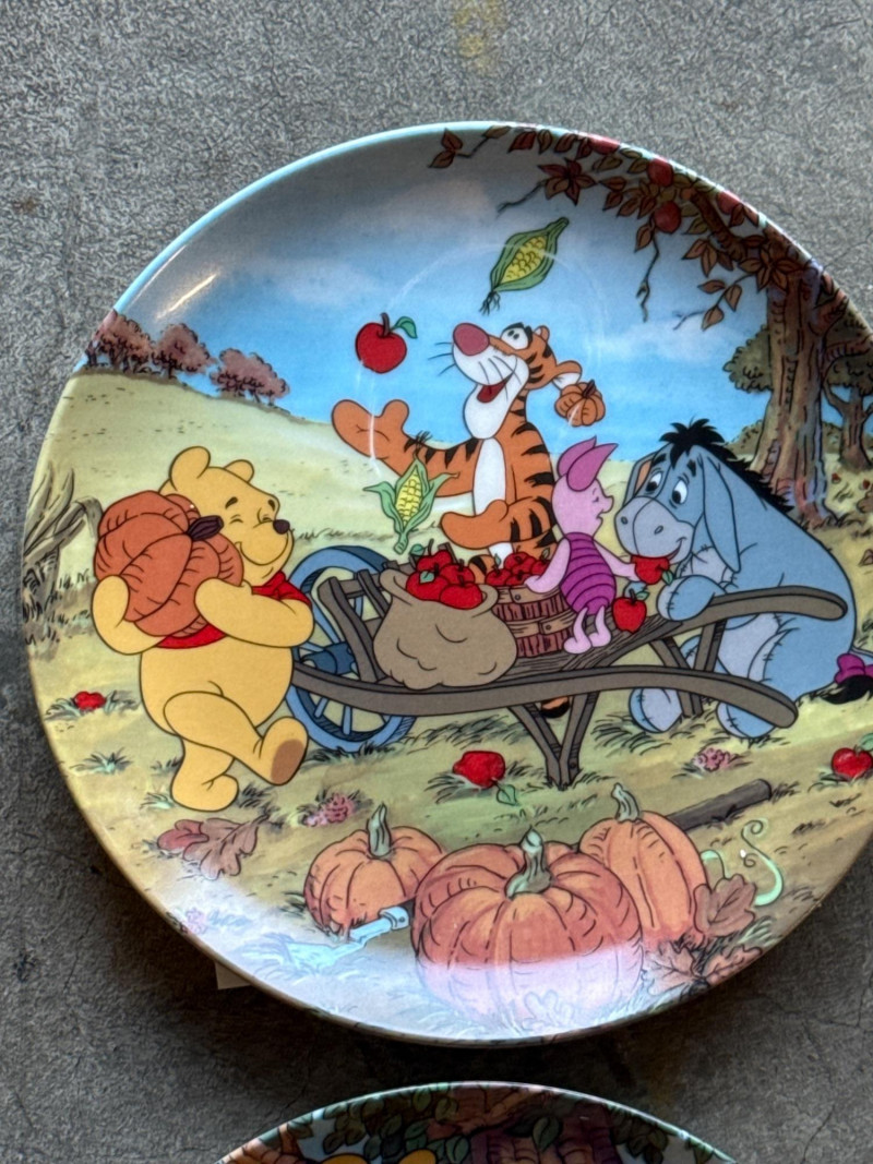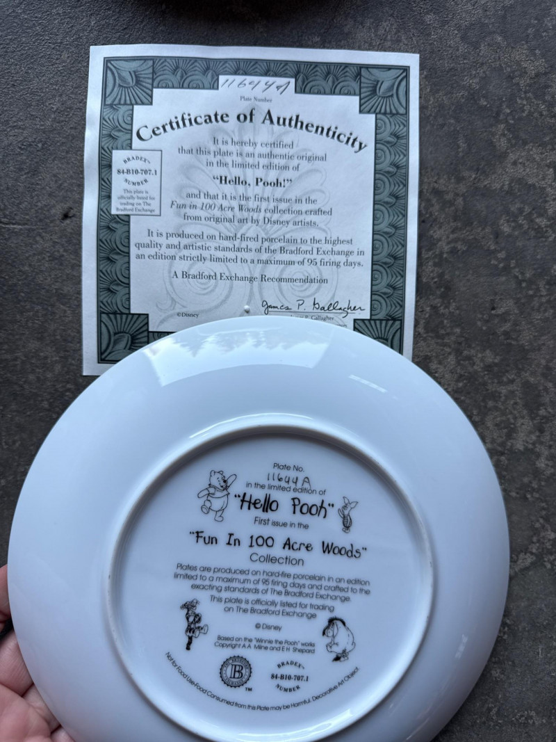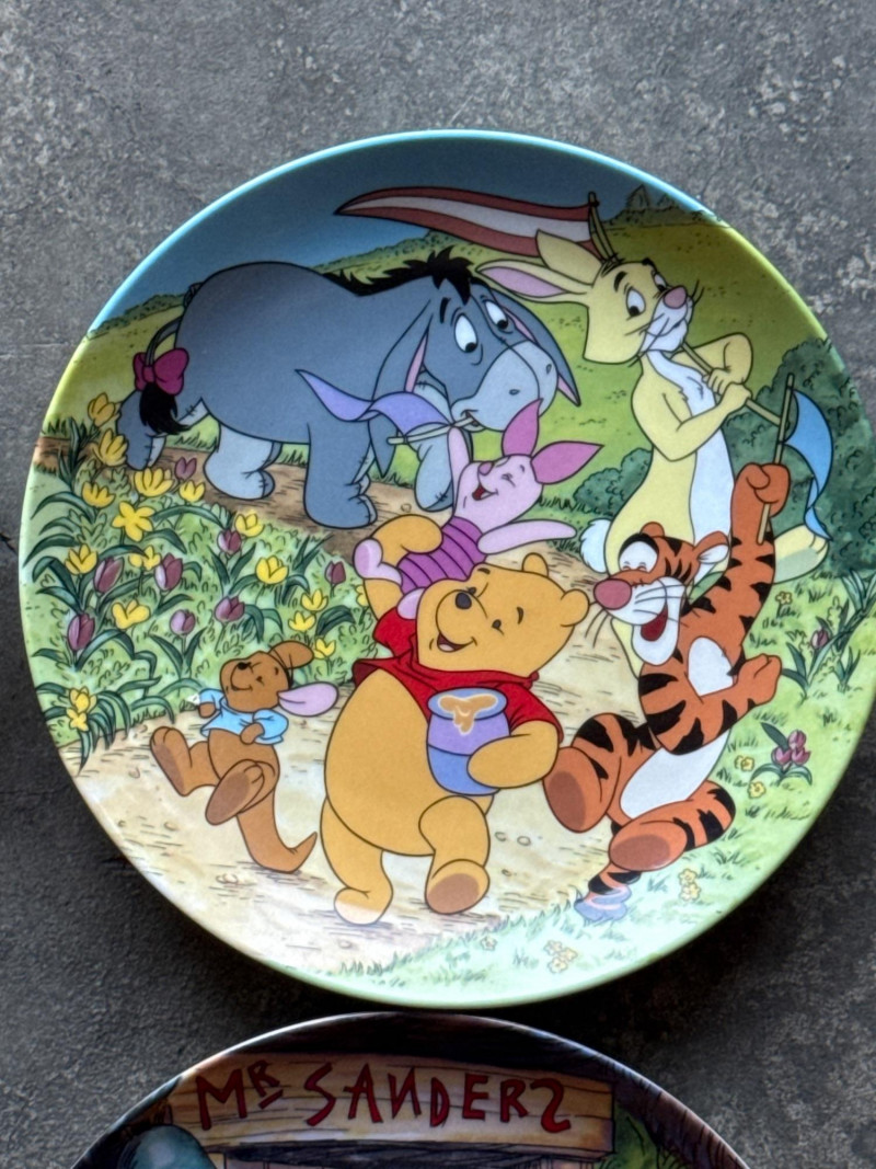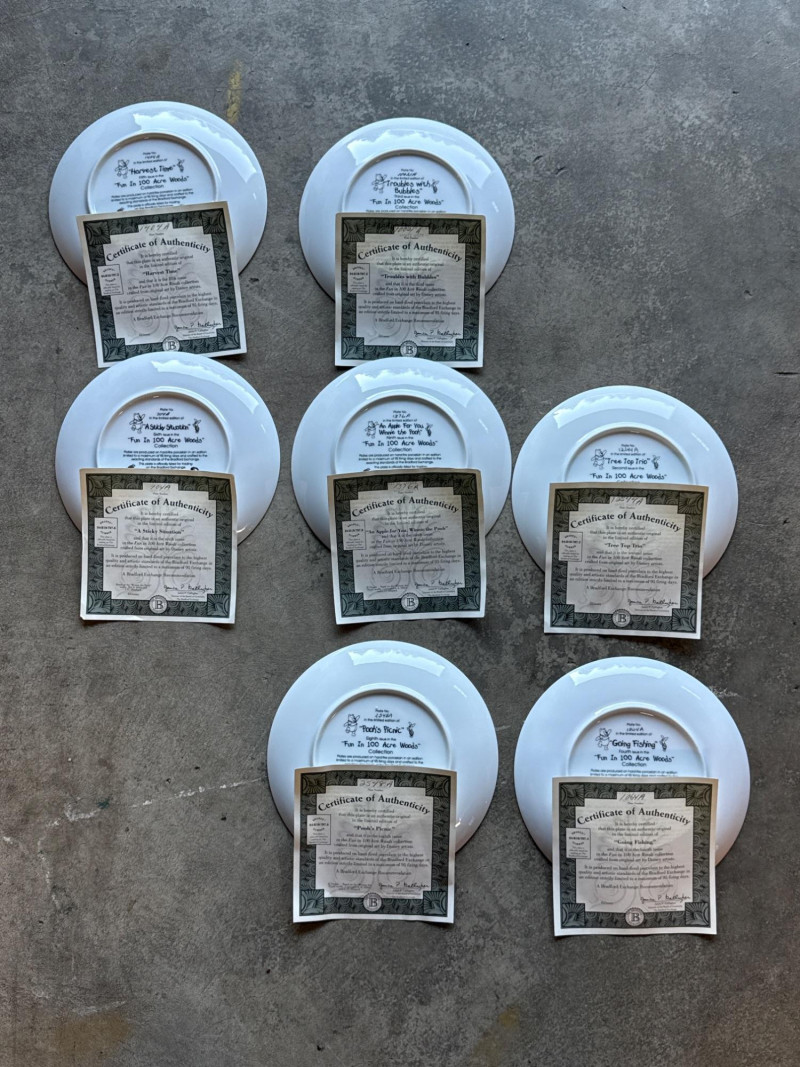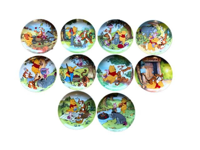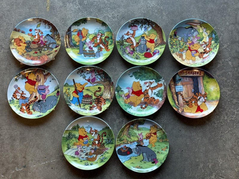 This lot features a charming collection of 10 Vintage Winnie the Pooh Collector Plates from the "Pooh's 100 Aker Wood" series. These whimsical pieces bring the beloved characters of the Hundred Acre Wood to life with vibrant storybook illustrations and classic 1960s/70s nostalgia. Series: Part of the celebrated "Pooh's 100 Aker Wood" collection. Featured Art: Includes iconic scenes such as the "Hello, Pooh!" centerpiece, Tigger and Pooh at "Mr. Sanders" house, and the "100 Aker Wood" map. Character Favorites: Features the whole gang, including Pooh, Tigger, Piglet, and Eeyore. 10 plates in total- 8 Plates: Include their original Certificates of Authenticity (COA) and are housed in their protective foam storage cases. 2 Plates: Included as-is (no COA or foam casing provided for these two).Lot Details
