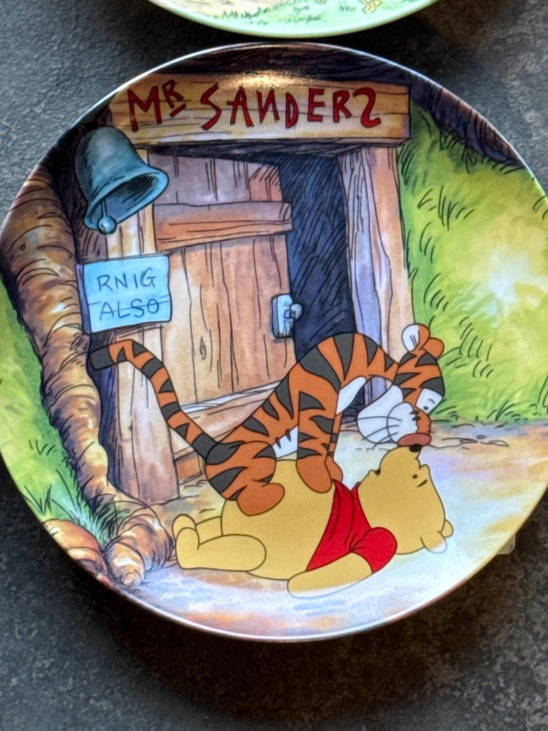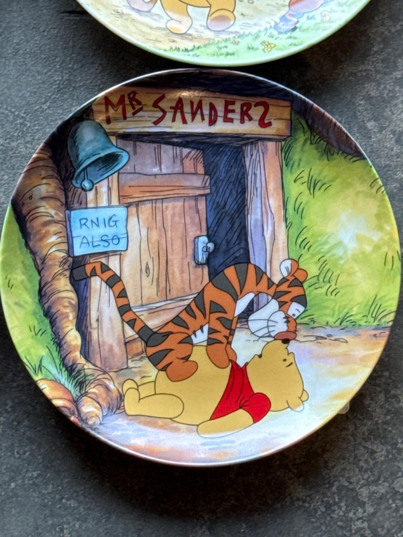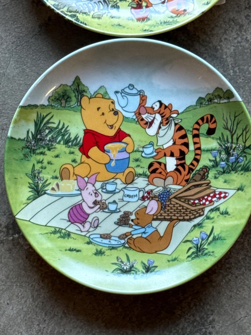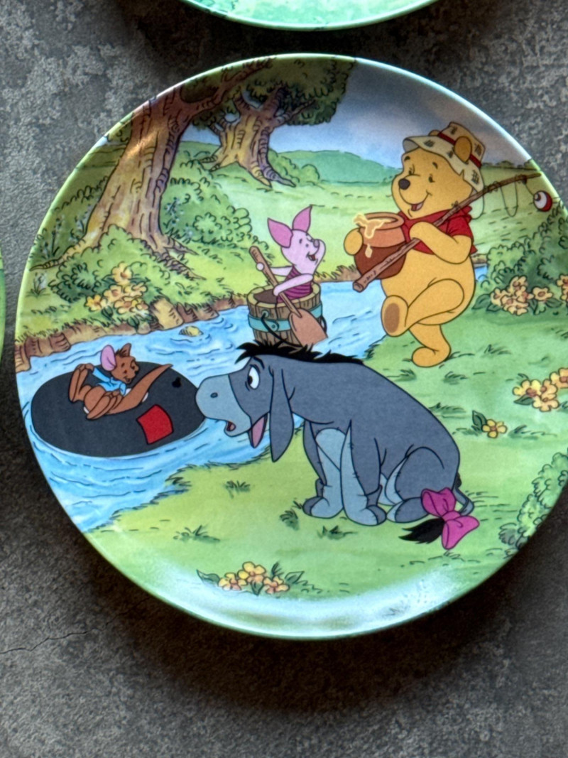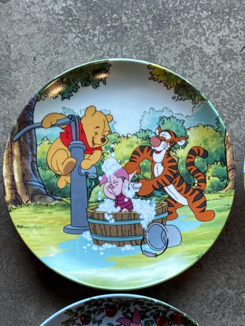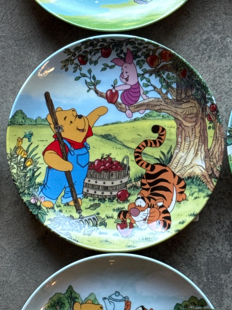 This lot features a charming collection of 10 Vintage Winnie the Pooh Collector Plates from the "Pooh's 100 Aker Wood" series. These whimsical pieces bring the beloved characters of the Hundred Acre Wood to life with vibrant storybook illustrations and classic 1960s/70s nostalgia. Series: Part of the celebrated "Pooh's 100 Aker Wood" collection. Featured Art: Includes iconic scenes such as the "Hello, Pooh!" centerpiece, Tigger and Pooh at "Mr. Sanders" house, and the "100 Aker Wood" map. Character Favorites: Features the whole gang, including Pooh, Tigger, Piglet, and Eeyore. 10 plates in total- 8 Plates: Include their original Certificates of Authenticity (COA) and are housed in their protective foam storage cases. 2 Plates: Included as-is (no COA or foam casing provided for these two).Lot Details