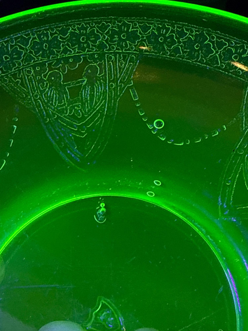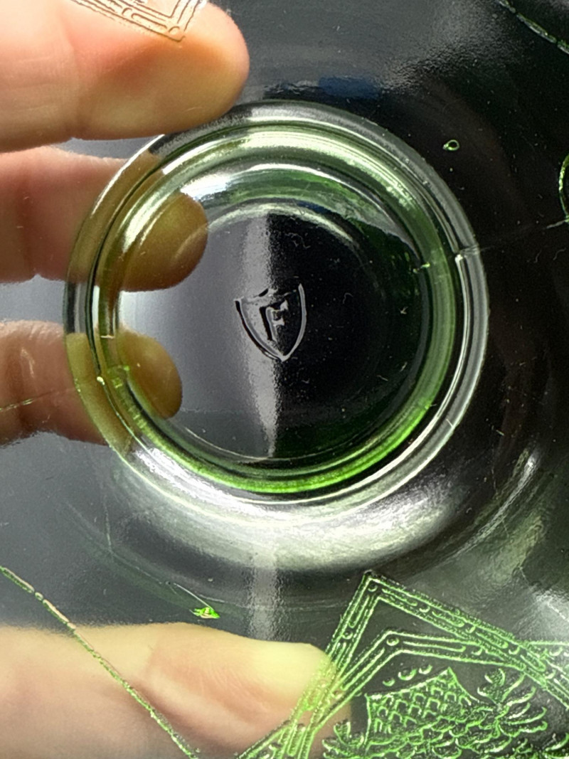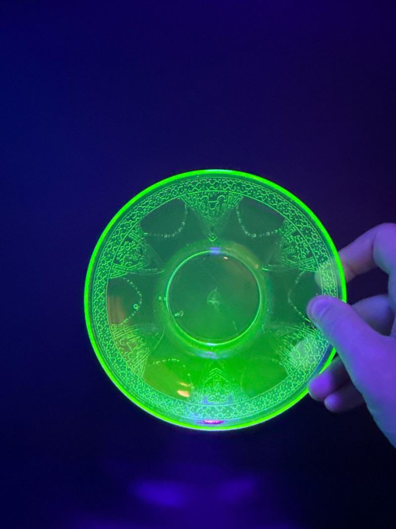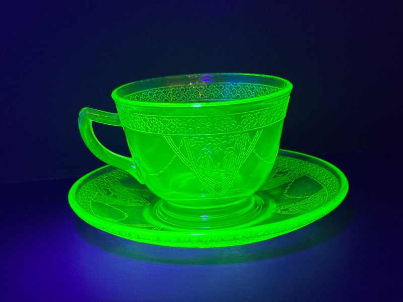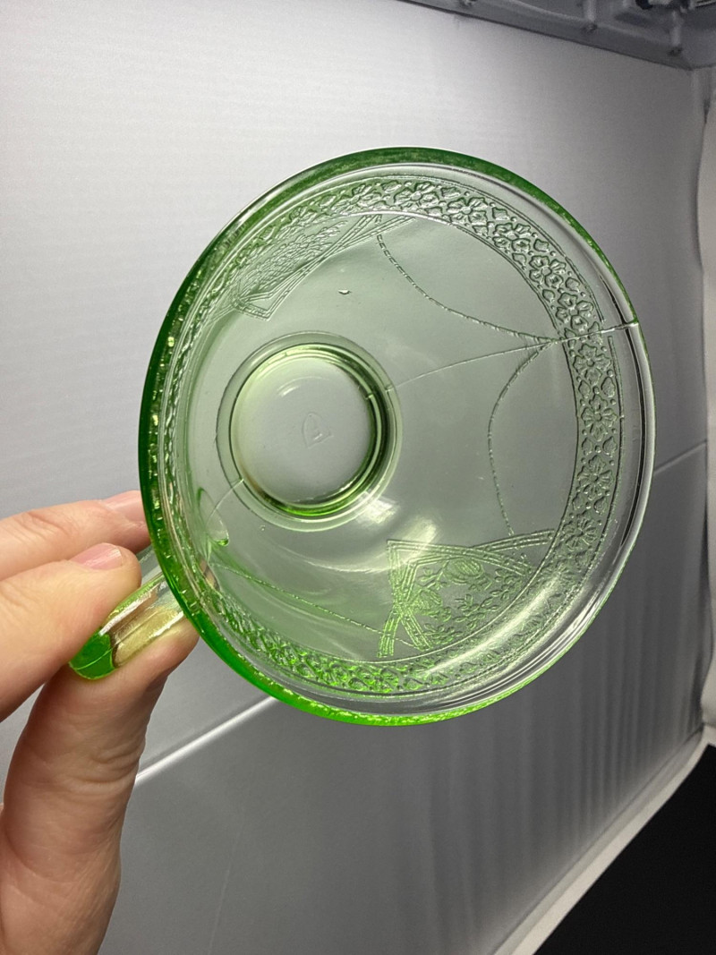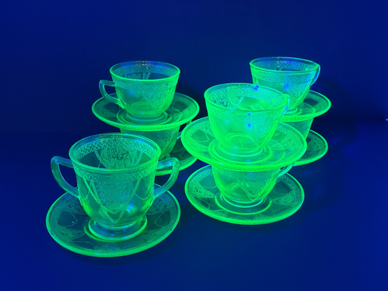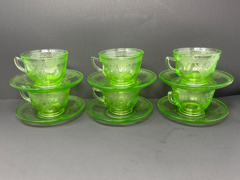 Federal Glass Company operated from around 1927 to 1932 for this specific line of uranium glass. (6) Tea/Coffee Cups: Featuring elegant curved handles and a delicate green tint. (7) Matching Saucers: Circular plates designed to pair perfectly with the cups. (1) Footed Creamer/Sugar Dish: A centerpiece vessel with a decorative footed base and patterned glass body.