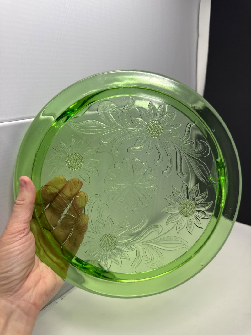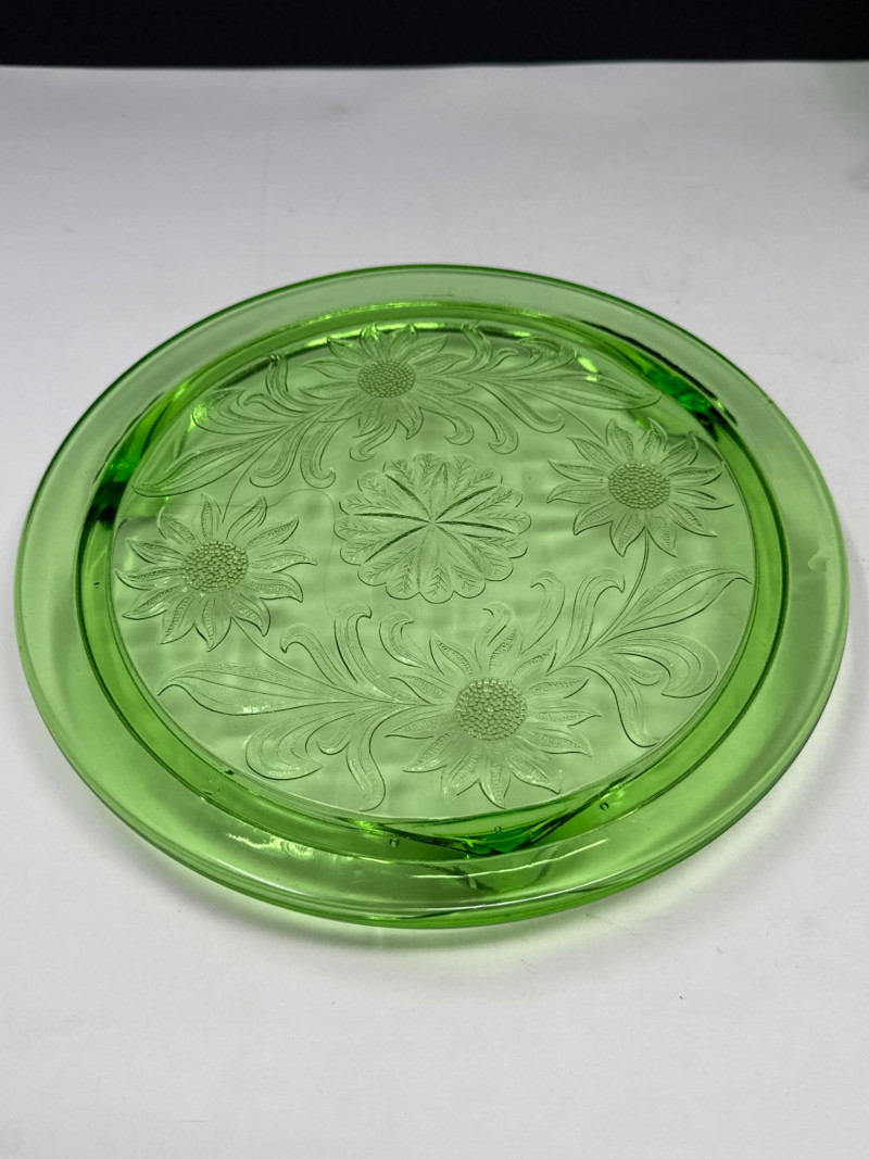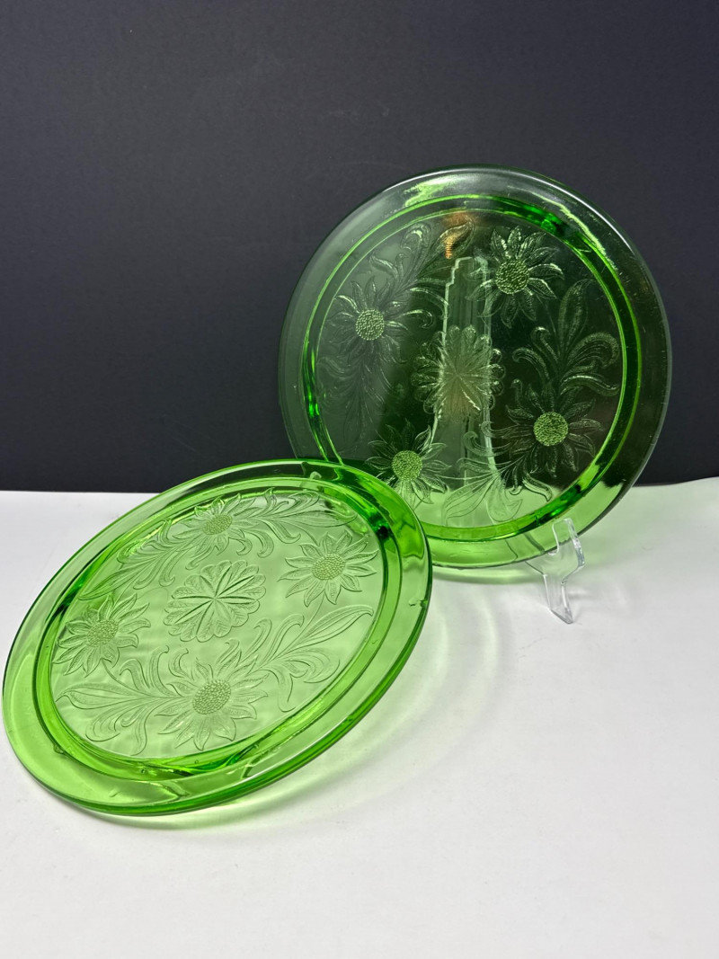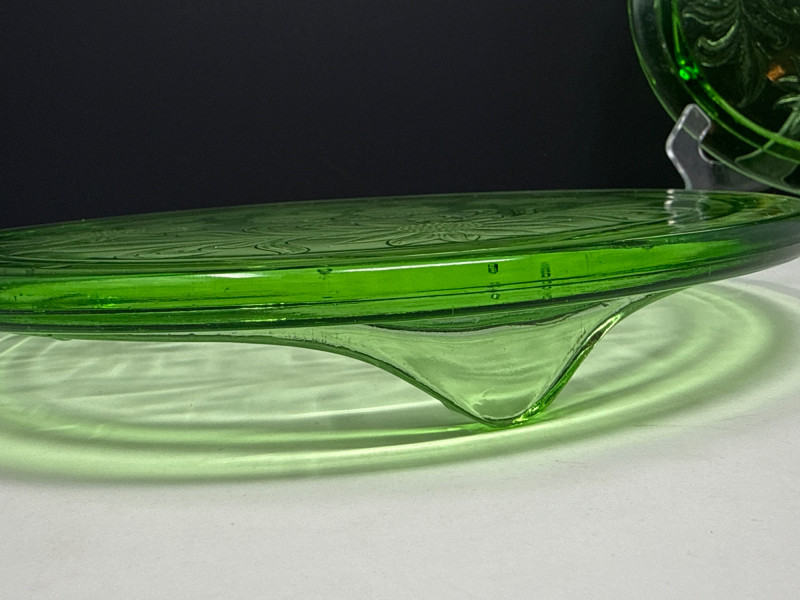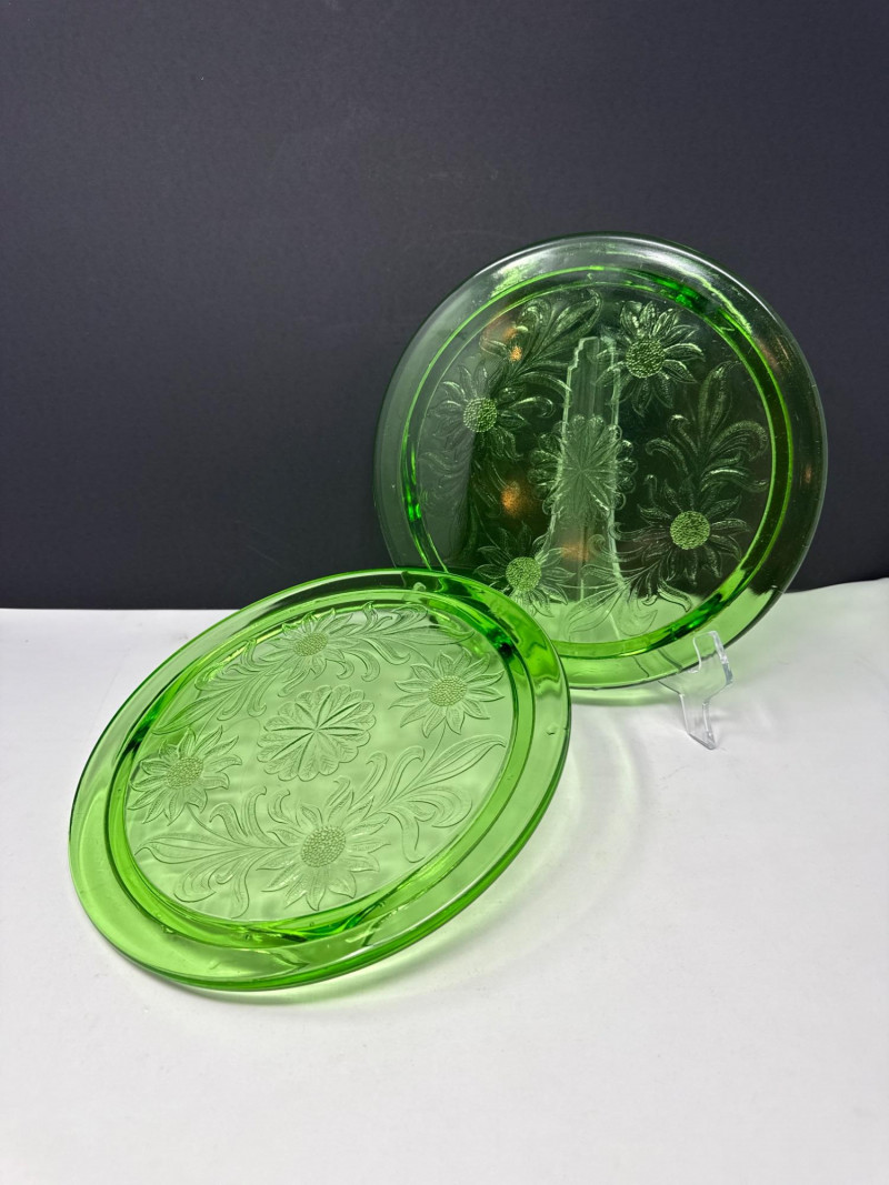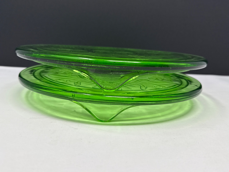 (2) Vintage Jeannette Green Depression Glass "Sunflower" footed cake plate - 10" D