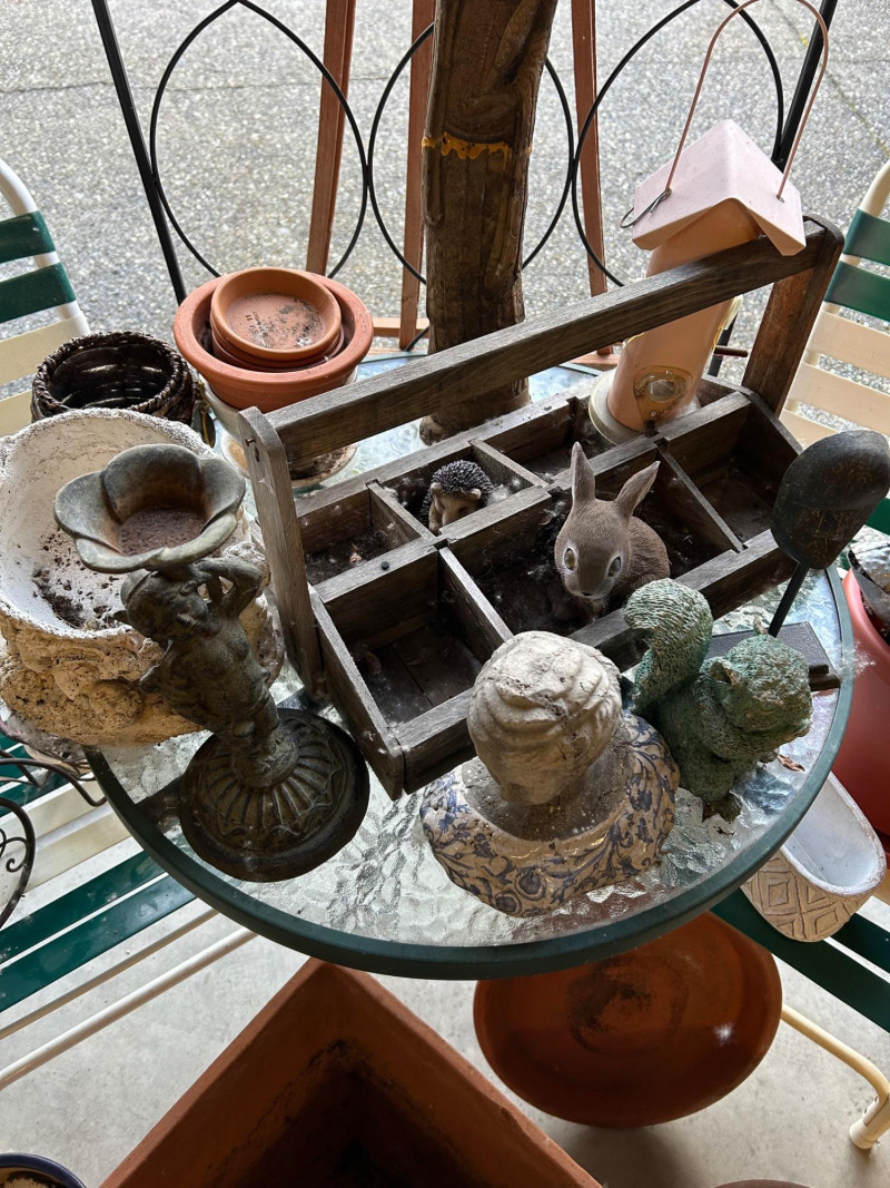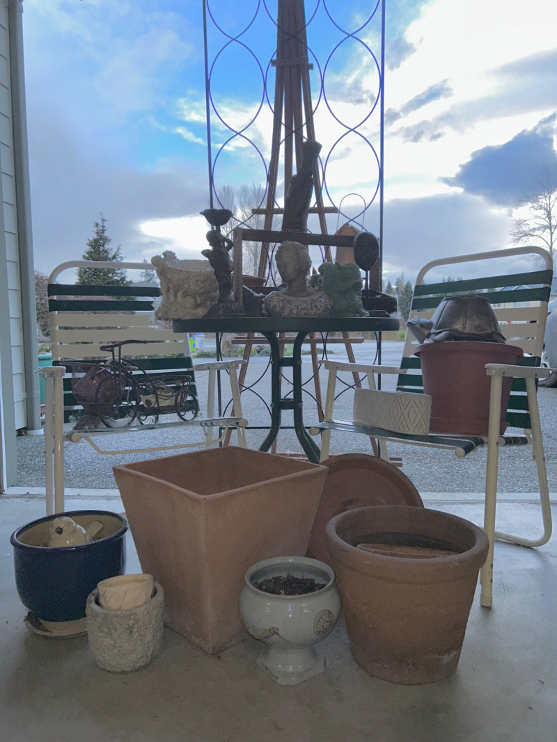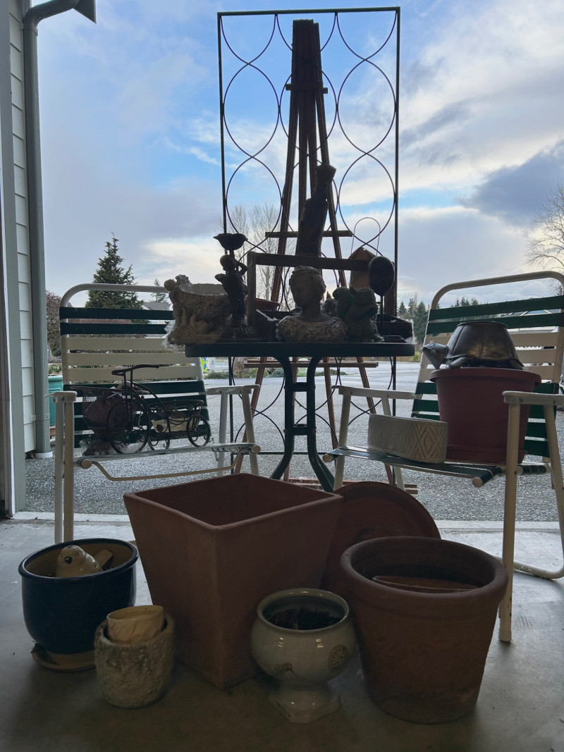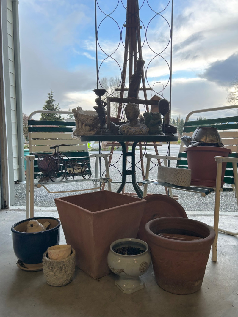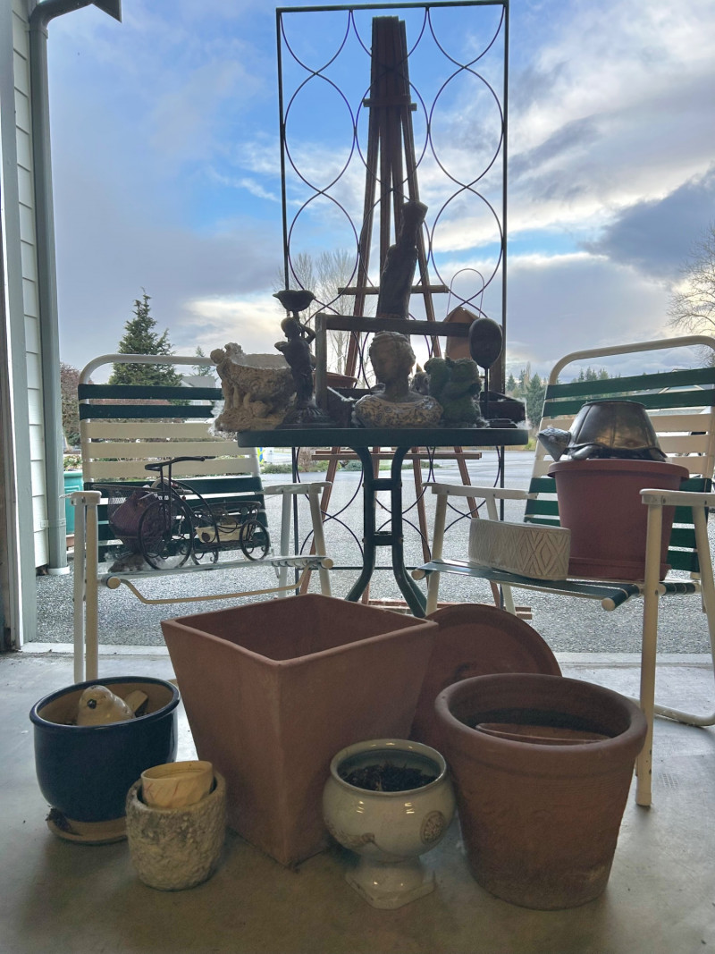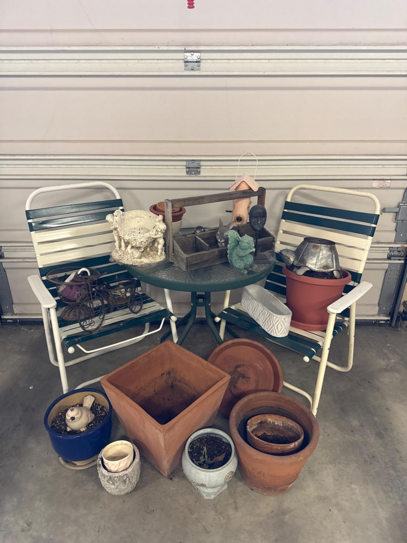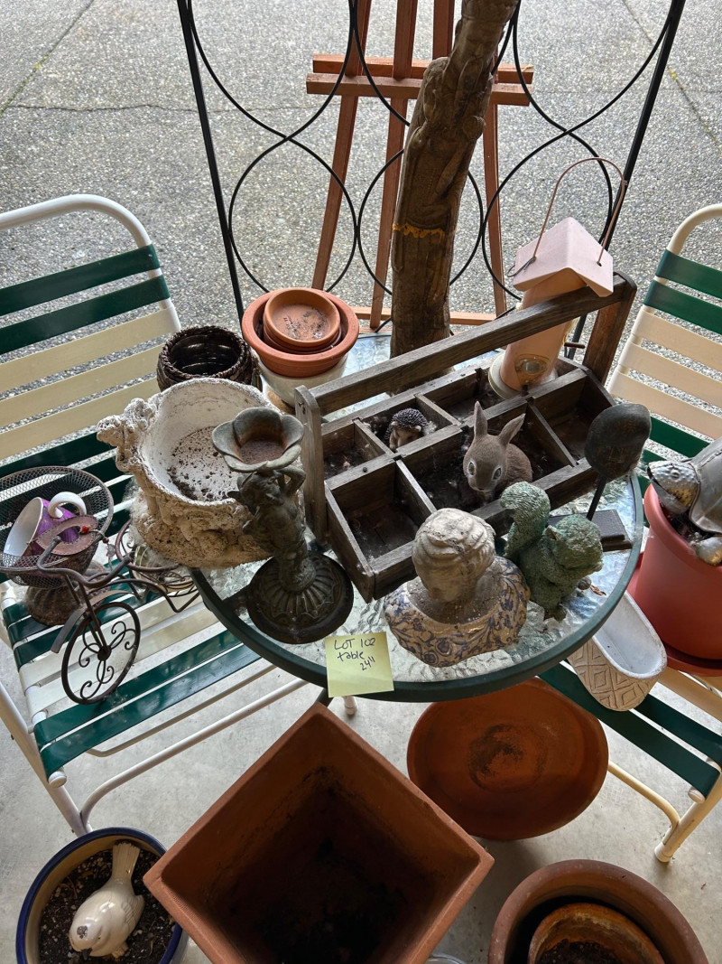Large mixed lot of outdoor and garden items, including: Two green‑and‑white striped lawn chairs with round glass‑top metal table Assorted plant pots: terracotta, ceramic, and mixed materials Garden trellises & stakes: wooden trellises, metal trellis with circular design, planter box with metal grid supports, and shepherd’s hook Decorative garden pieces: small statues, bust, carved figure, candlestick, and additional accents Small décor assortment: birdhouse, rabbit figure, mini planters, and other outdoor decorative items