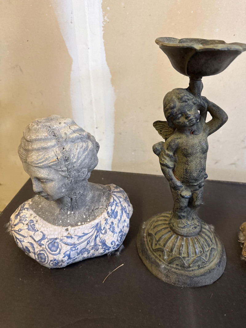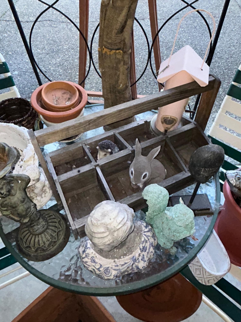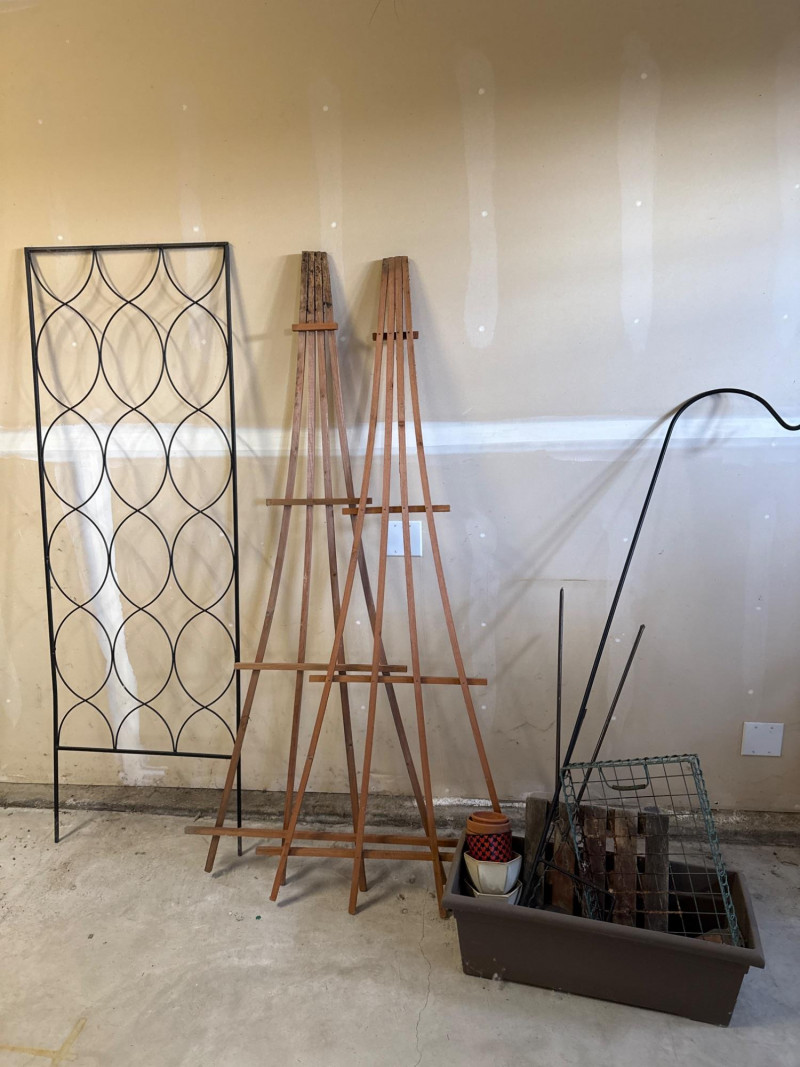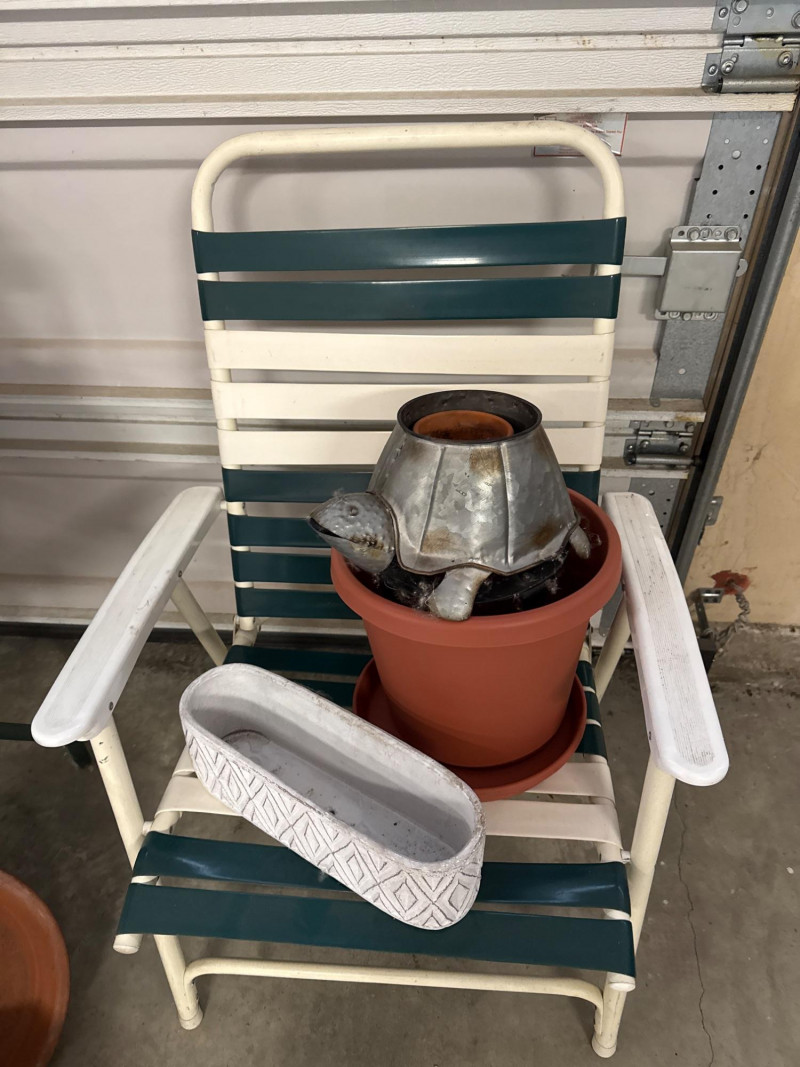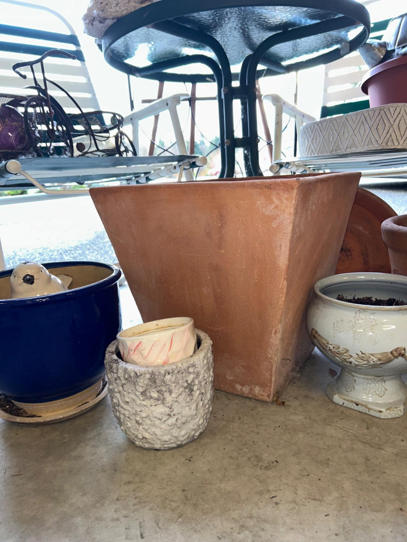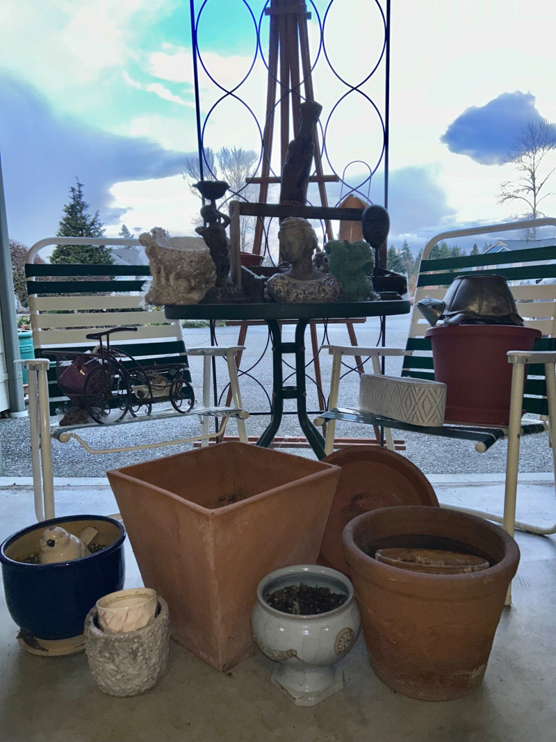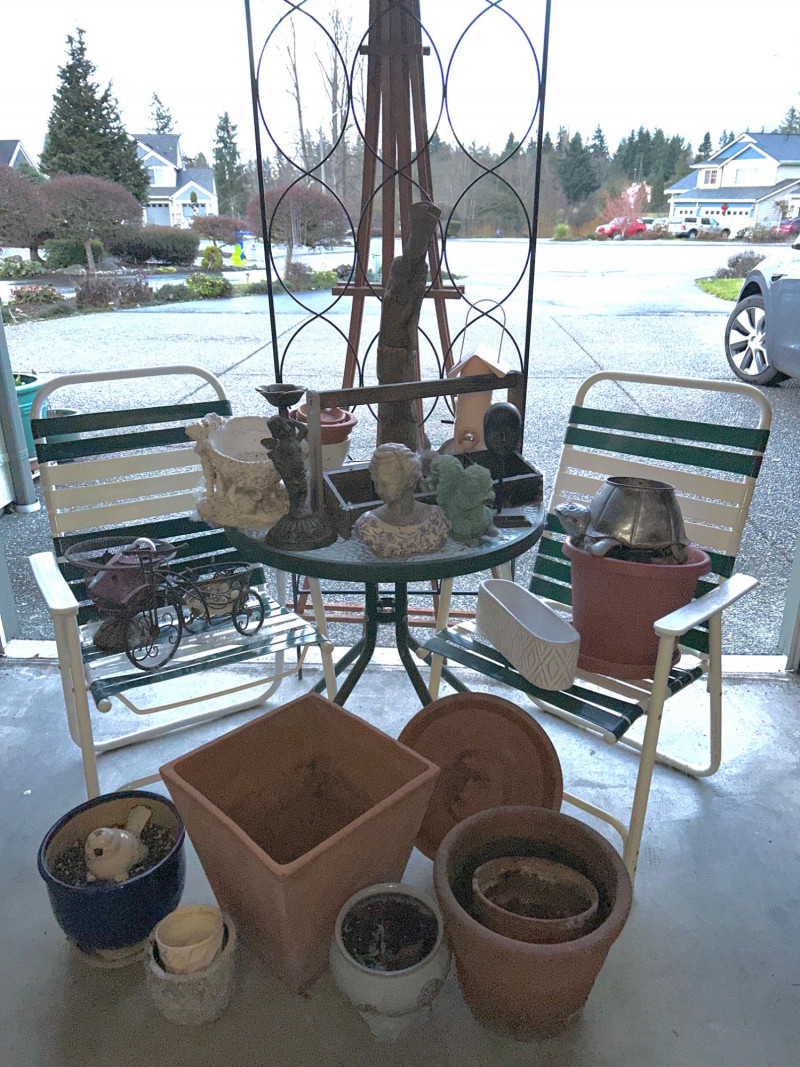 Large mixed lot of outdoor and garden items, including: Two green‑and‑white striped lawn chairs with round glass‑top metal table Assorted plant pots: terracotta, ceramic, and mixed materials Garden trellises & stakes: wooden trellises, metal trellis with circular design, planter box with metal grid supports, and shepherd’s hook Decorative garden pieces: small statues, bust, carved figure, candlestick, and additional accents Small décor assortment: birdhouse, rabbit figure, mini planters, and other outdoor decorative items