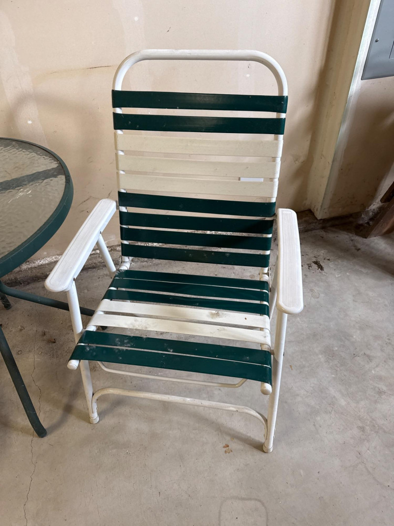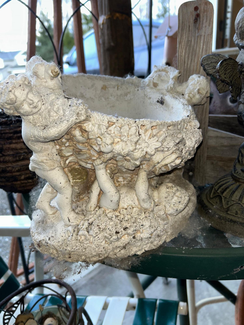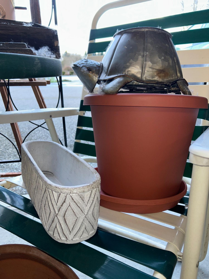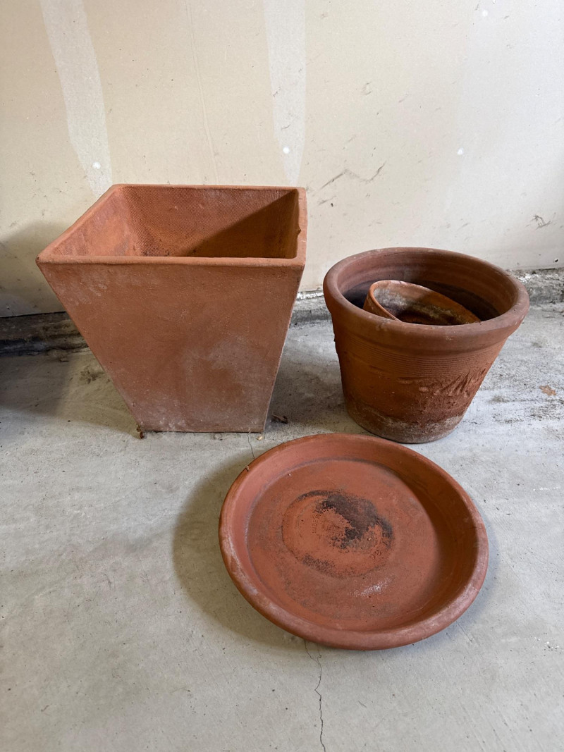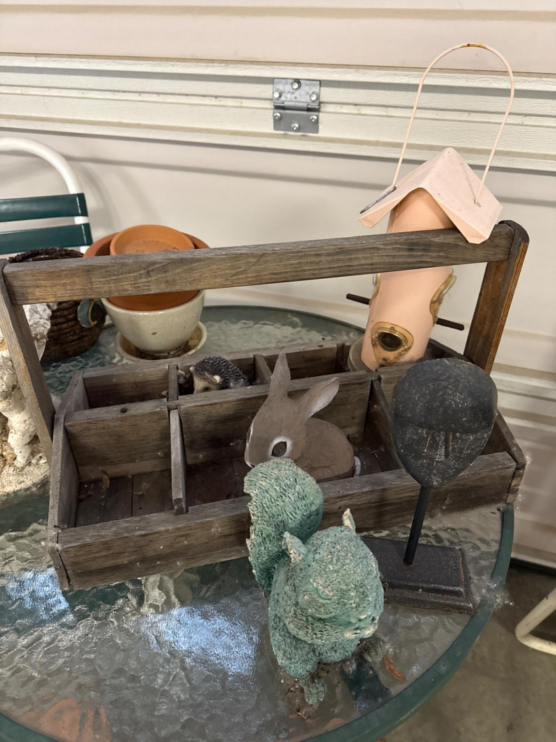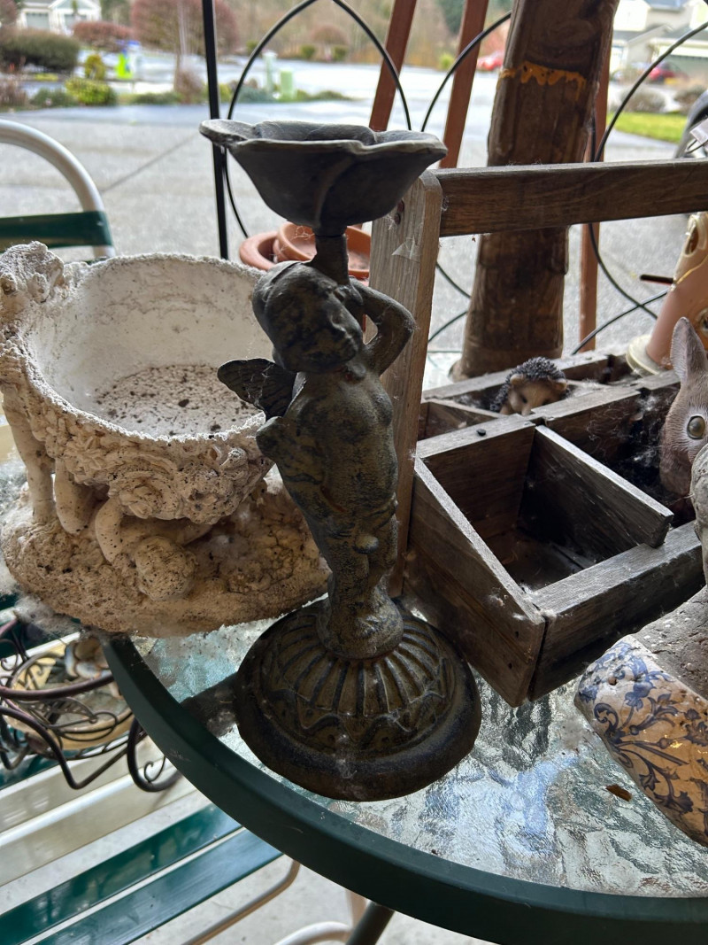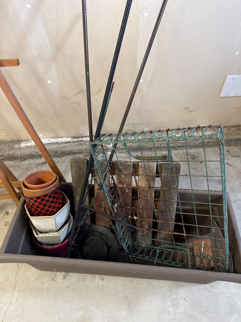 Large mixed lot of outdoor and garden items, including: Two green‑and‑white striped lawn chairs with round glass‑top metal table Assorted plant pots: terracotta, ceramic, and mixed materials Garden trellises & stakes: wooden trellises, metal trellis with circular design, planter box with metal grid supports, and shepherd’s hook Decorative garden pieces: small statues, bust, carved figure, candlestick, and additional accents Small décor assortment: birdhouse, rabbit figure, mini planters, and other outdoor decorative items