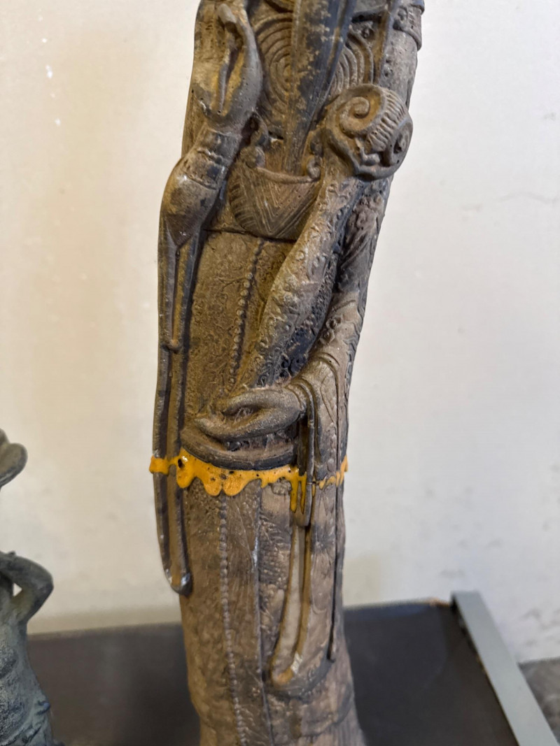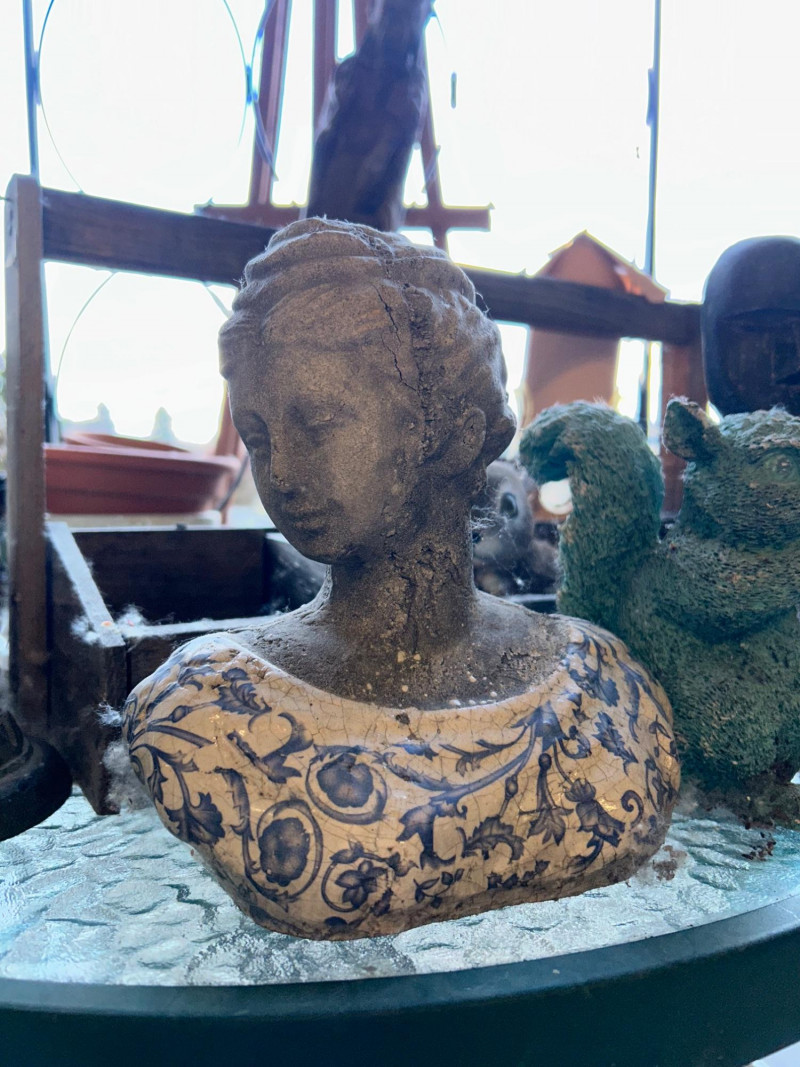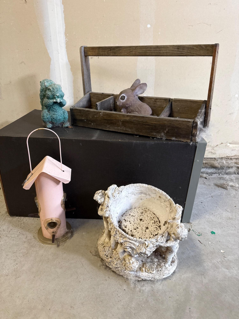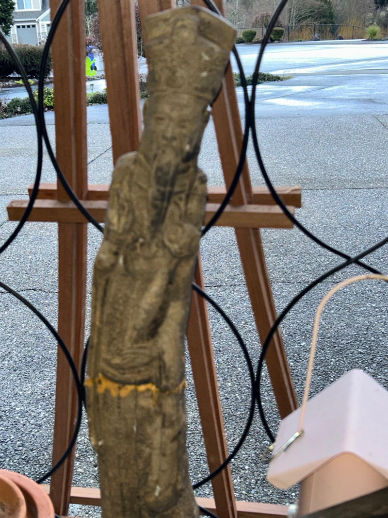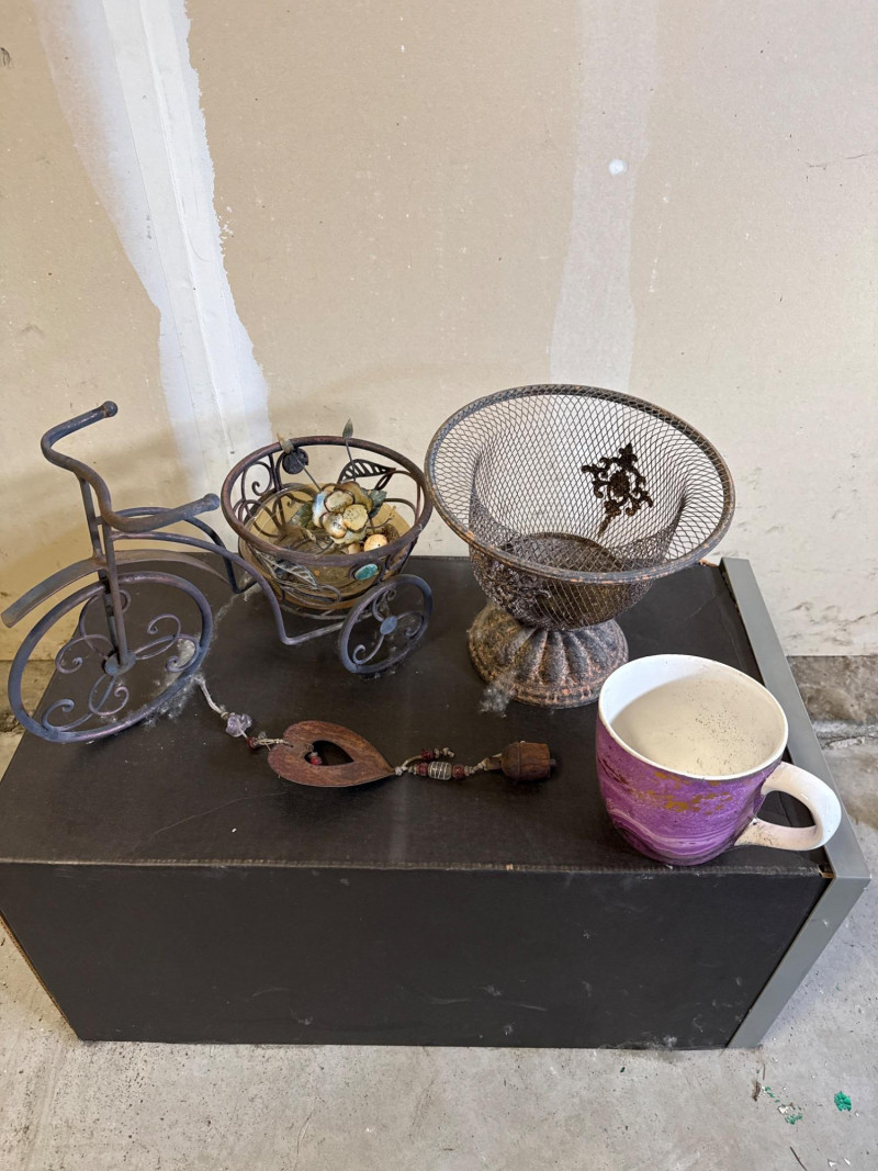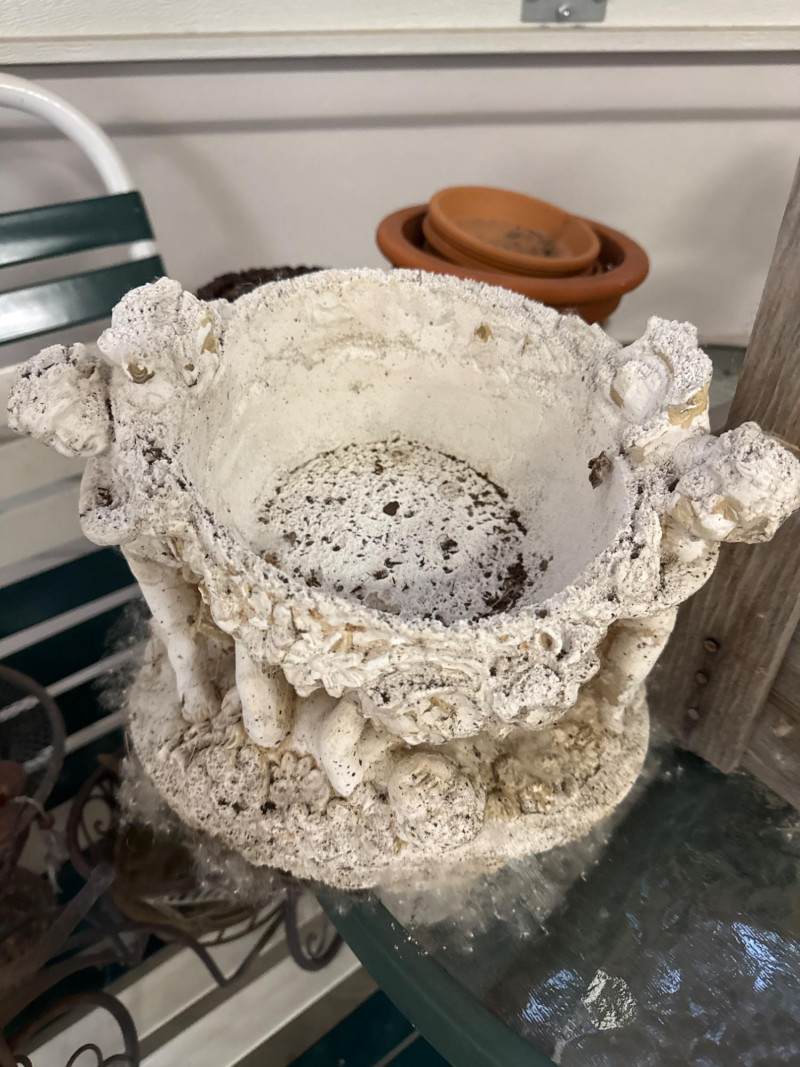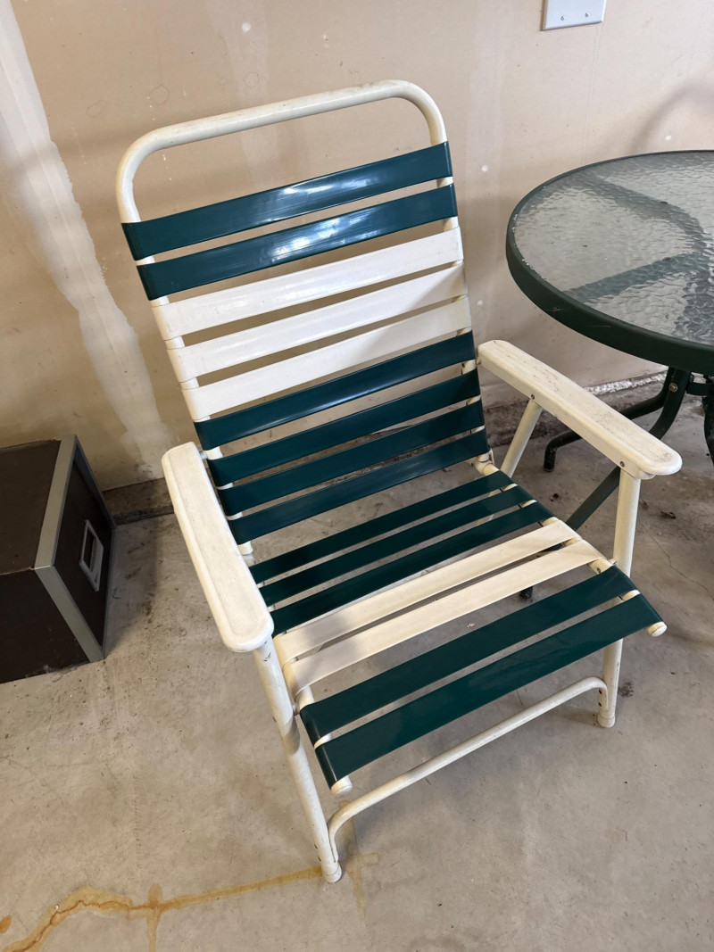 Large mixed lot of outdoor and garden items, including: Two green‑and‑white striped lawn chairs with round glass‑top metal table Assorted plant pots: terracotta, ceramic, and mixed materials Garden trellises & stakes: wooden trellises, metal trellis with circular design, planter box with metal grid supports, and shepherd’s hook Decorative garden pieces: small statues, bust, carved figure, candlestick, and additional accents Small décor assortment: birdhouse, rabbit figure, mini planters, and other outdoor decorative items