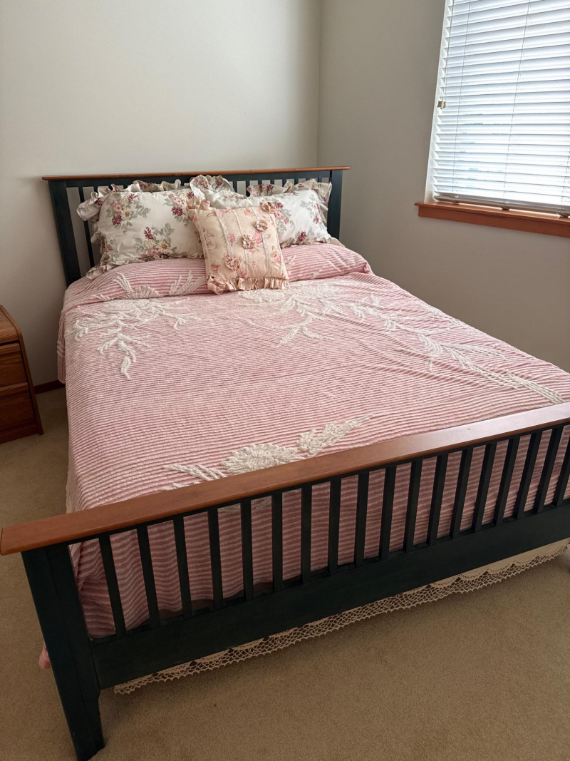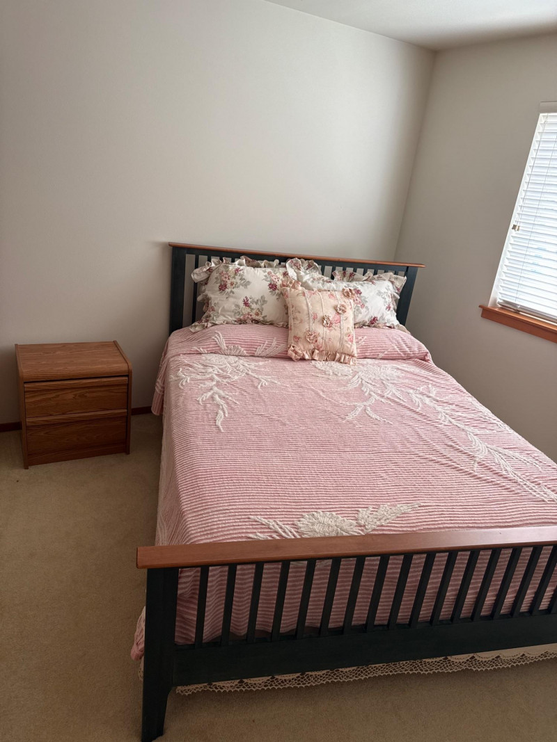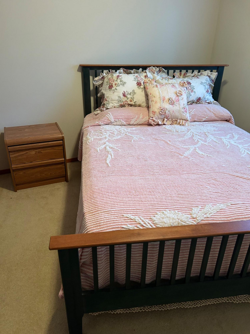 Cozy bedroom set featuring: Wooden bed frame with slatted headboard and footboard, accented with lighter wood trim, appears to be queen Coordinated bedding, including pink‑and‑white striped coverlet with textured floral pattern Three decorative pillows with floral prints and ruffled edges Two‑drawer nightstand