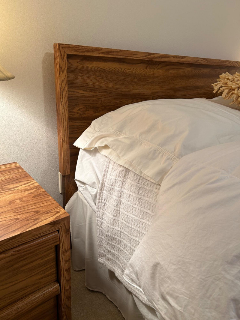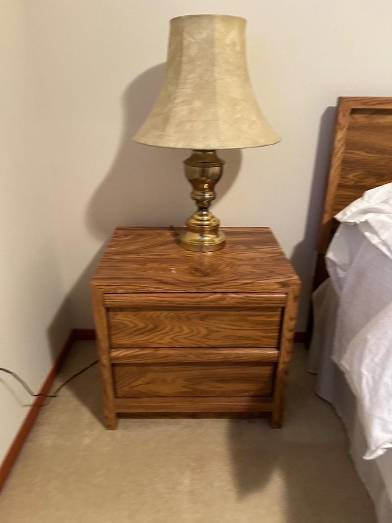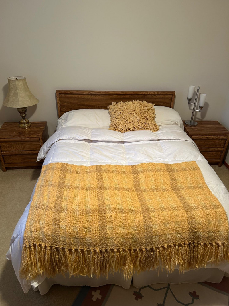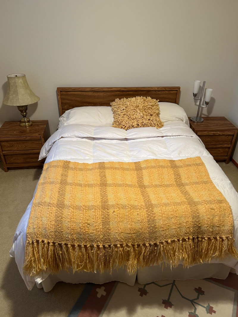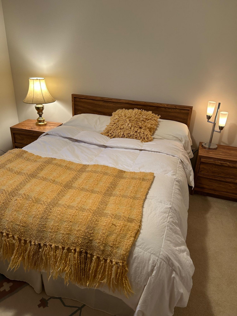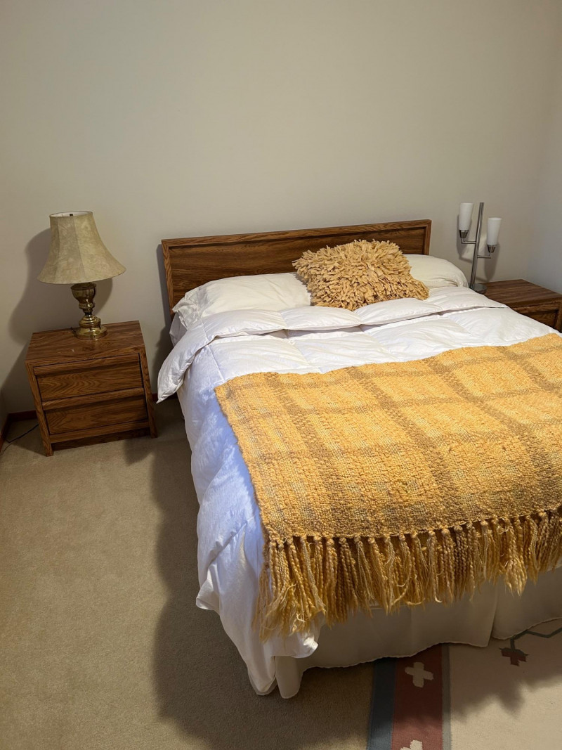 Warm, coordinated bedroom set including: Wooden bed frame with slatted headboard, dressed in a white comforter Mustard‑yellow textured throw with fringe and matching decorative pillow Two nightstands, each with a different lamp style: Traditional lamp with beige shade Modern lamp with three cylindrical white shades This includes mattress. Non smoking and pet free home.