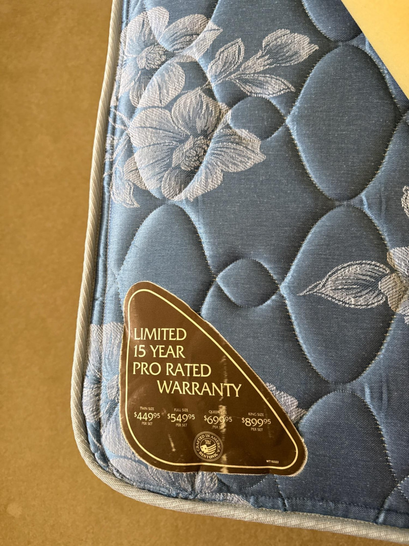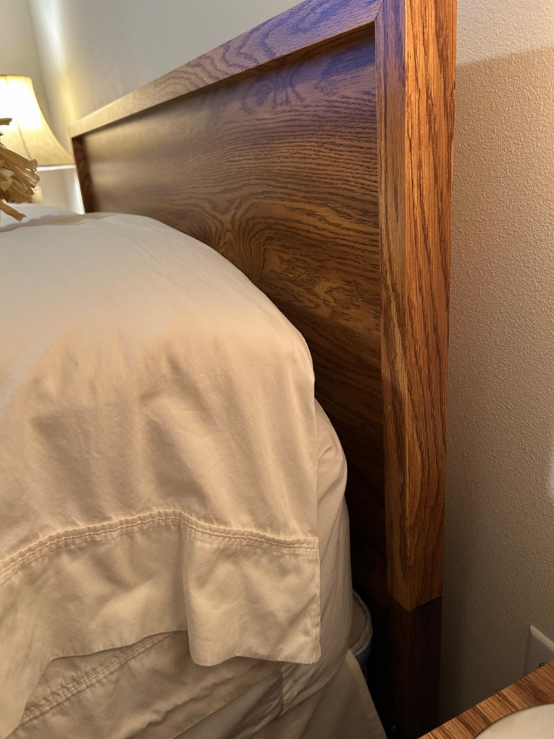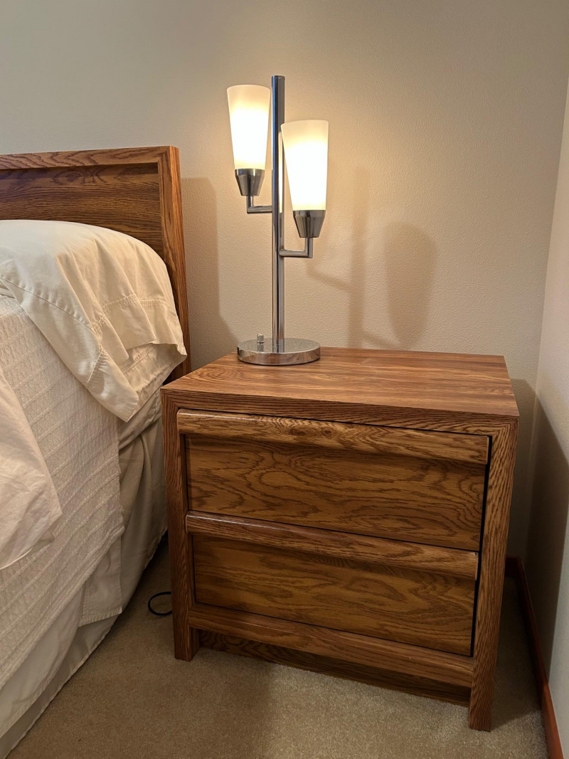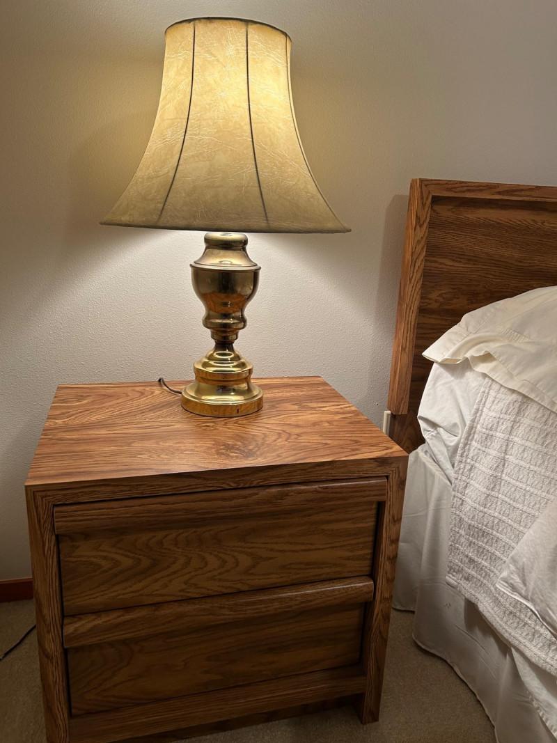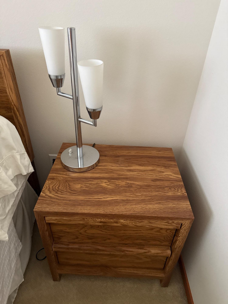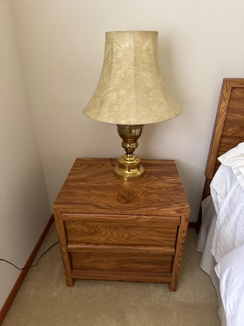 Warm, coordinated bedroom set including: Wooden bed frame with slatted headboard, dressed in a white comforter Mustard‑yellow textured throw with fringe and matching decorative pillow Two nightstands, each with a different lamp style: Traditional lamp with beige shade Modern lamp with three cylindrical white shades This includes mattress. Non smoking and pet free home.