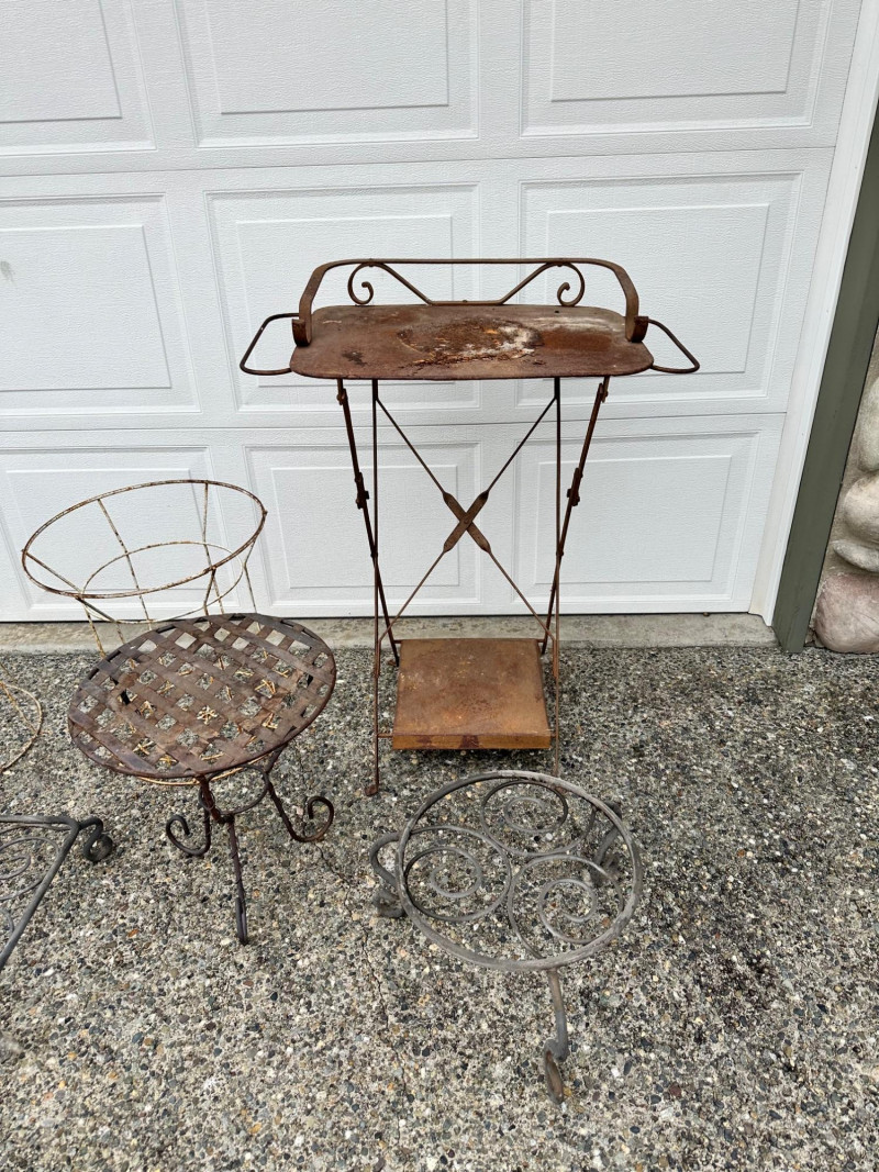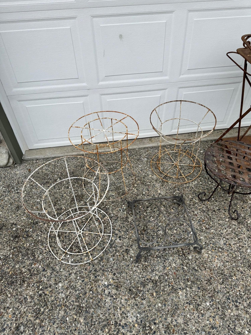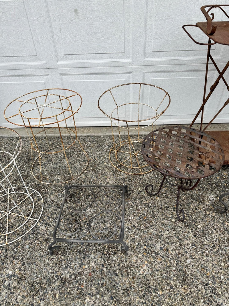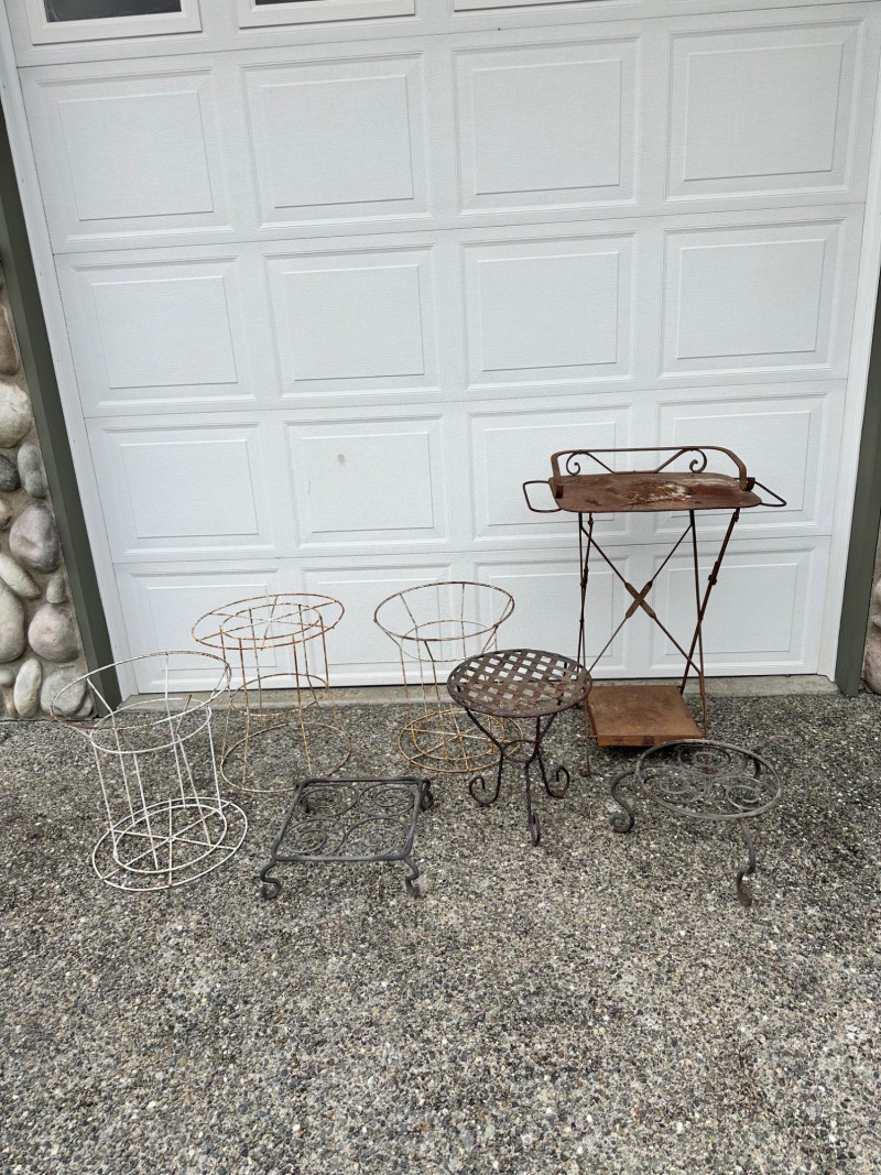Wire basket‑style plant stands in assorted shapes and sizes Rolling plant caddy Small metal accent table with lattice top Rustic metal serving cart with wheels and handles Additional vintage‑style metal holders and stands with natural patina