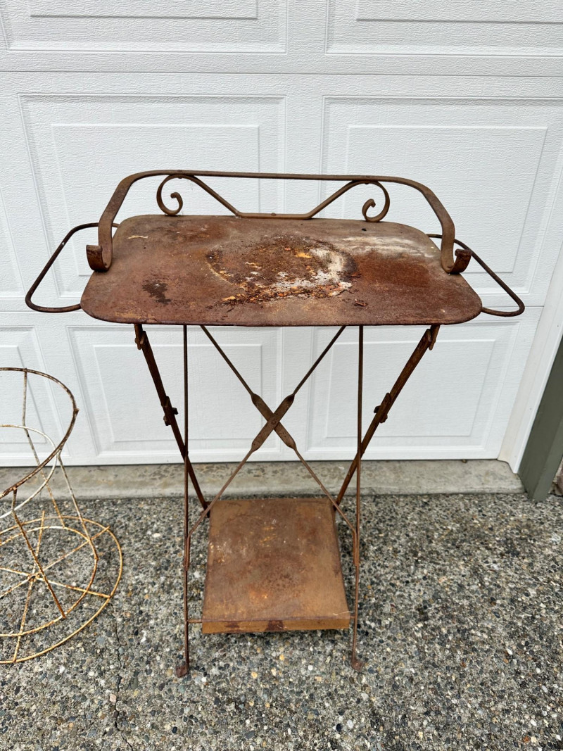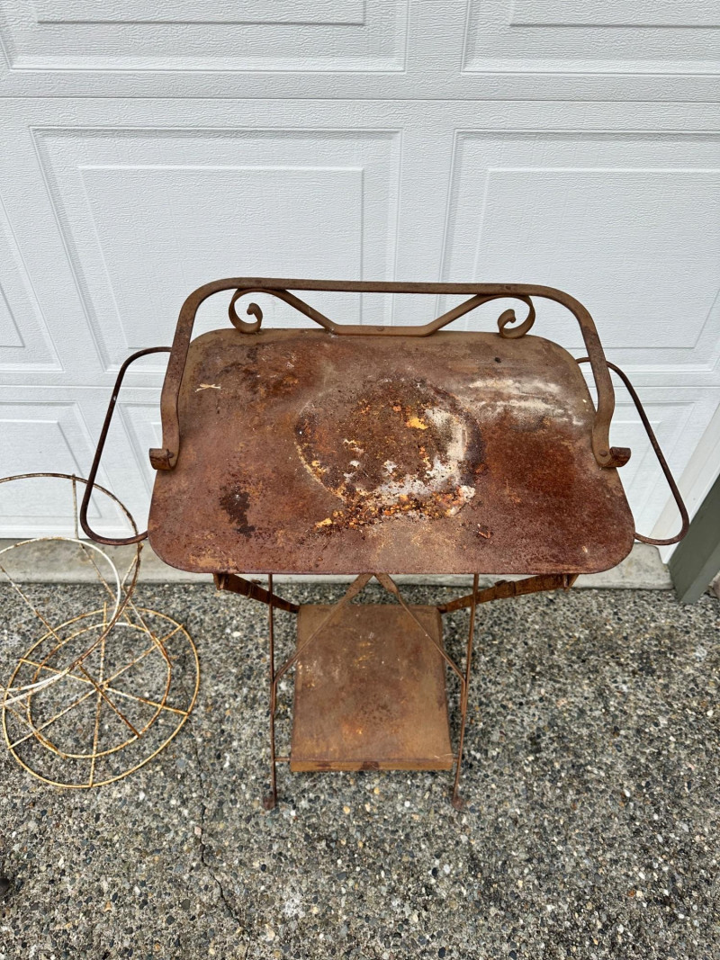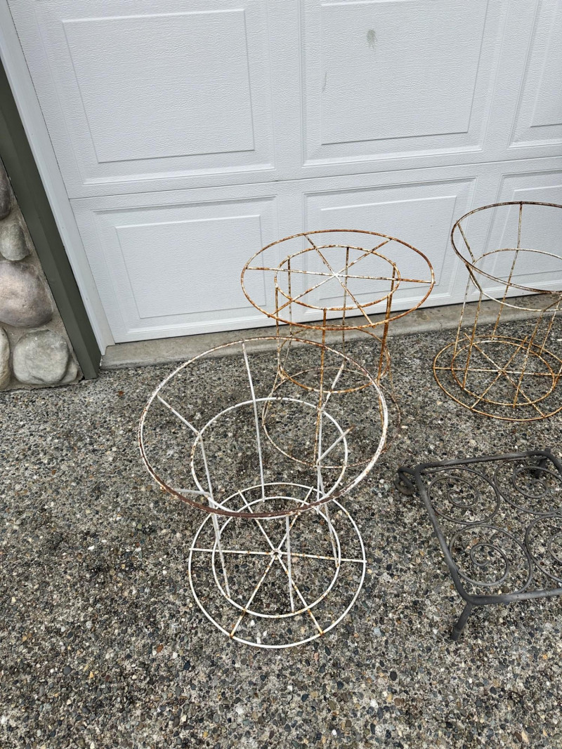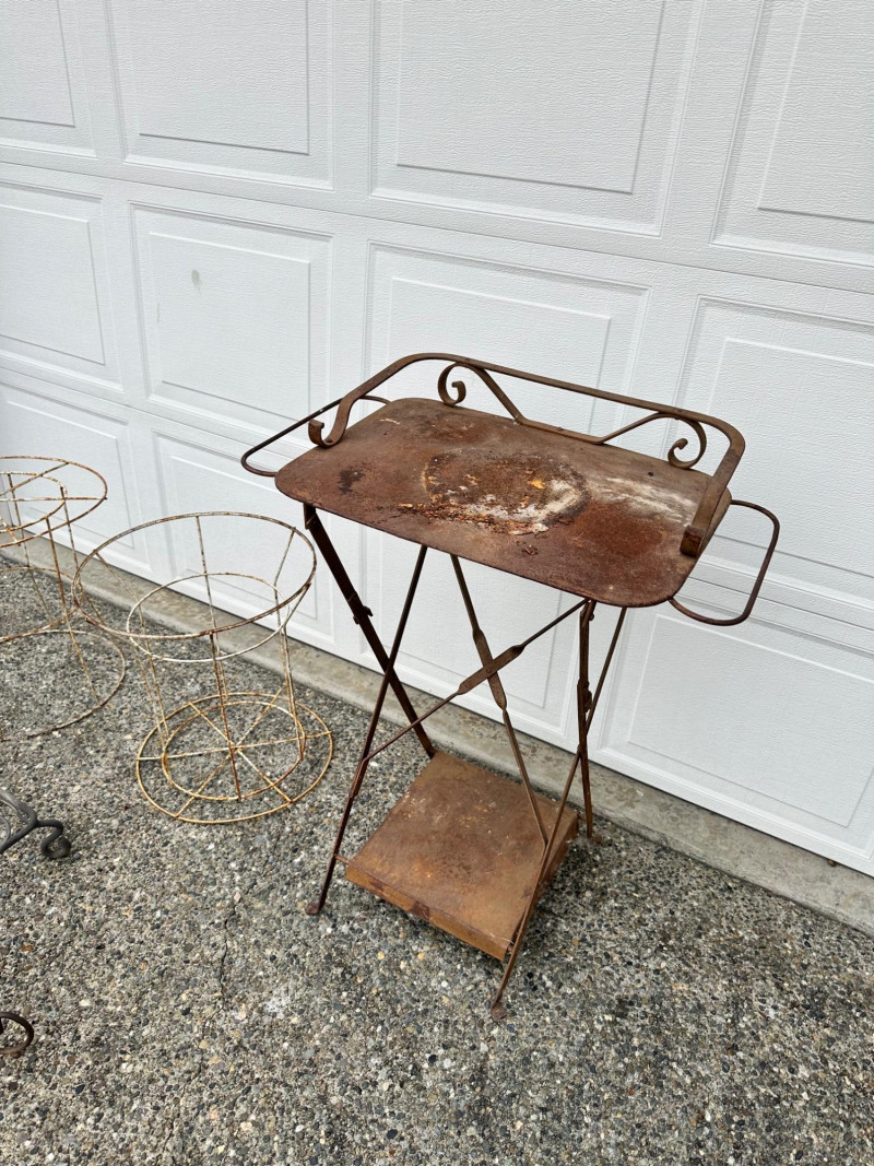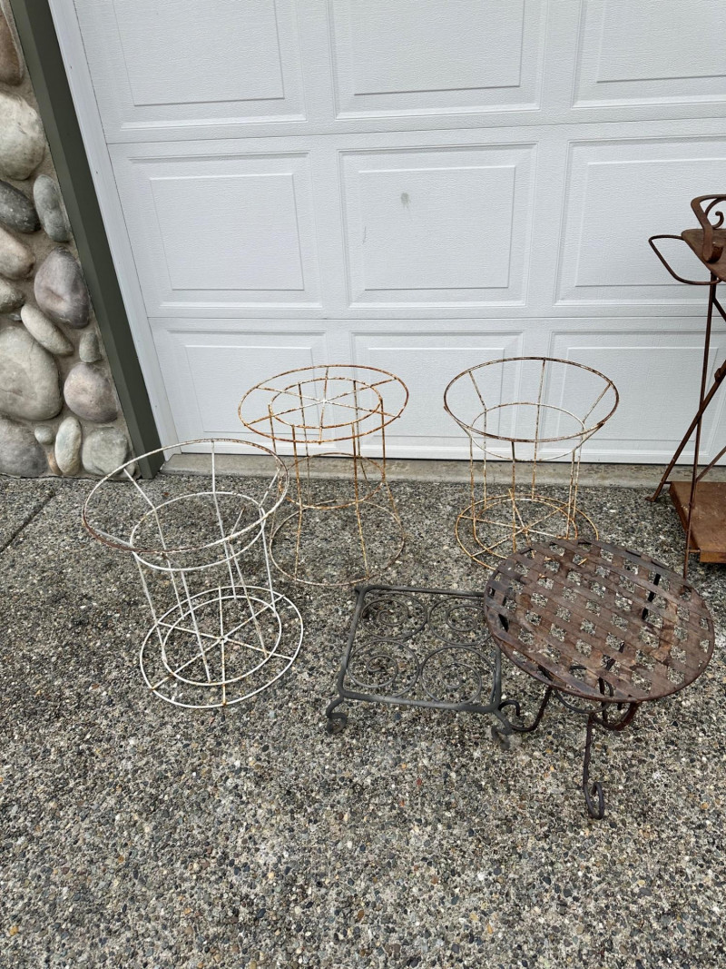 Wire basket‑style plant stands in assorted shapes and sizes Rolling plant caddy Small metal accent table with lattice top Rustic metal serving cart with wheels and handles Additional vintage‑style metal holders and stands with natural patina