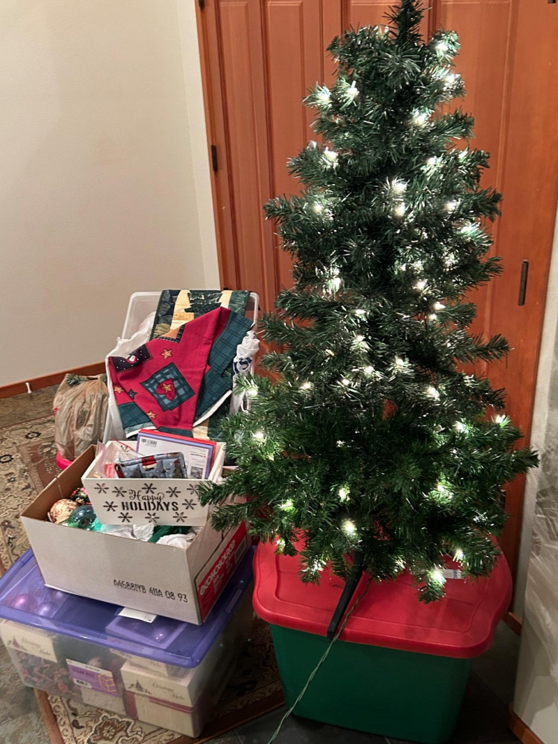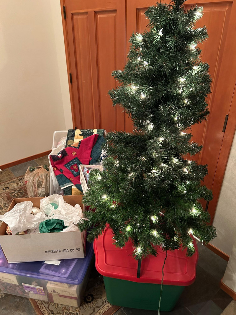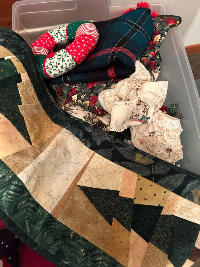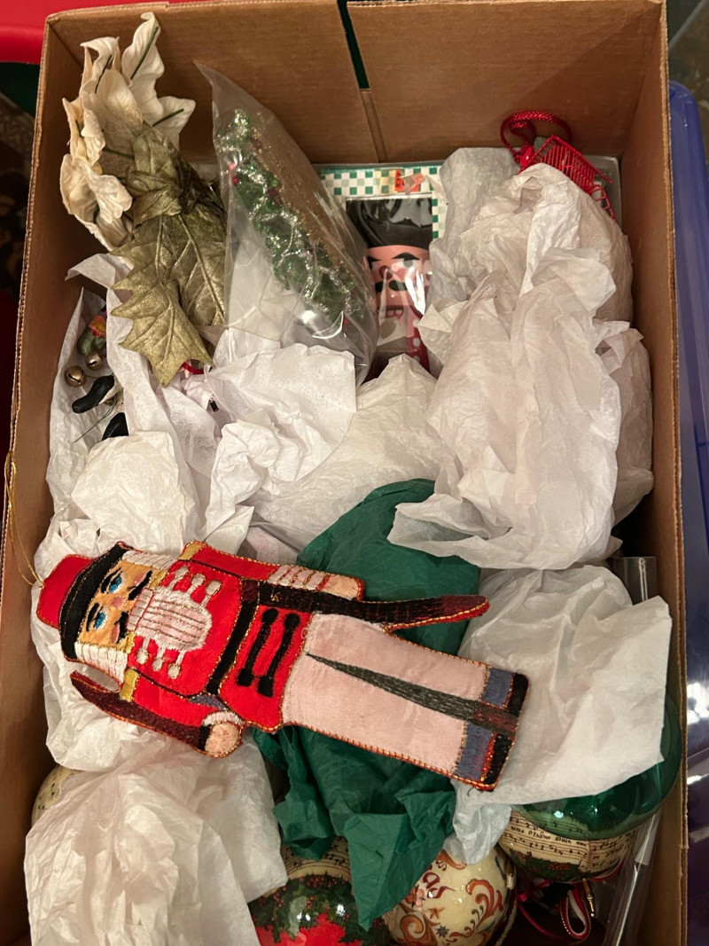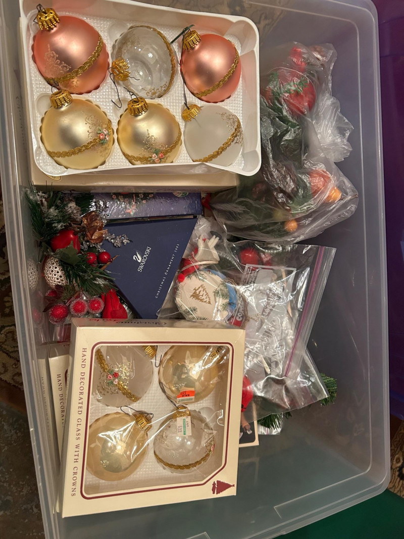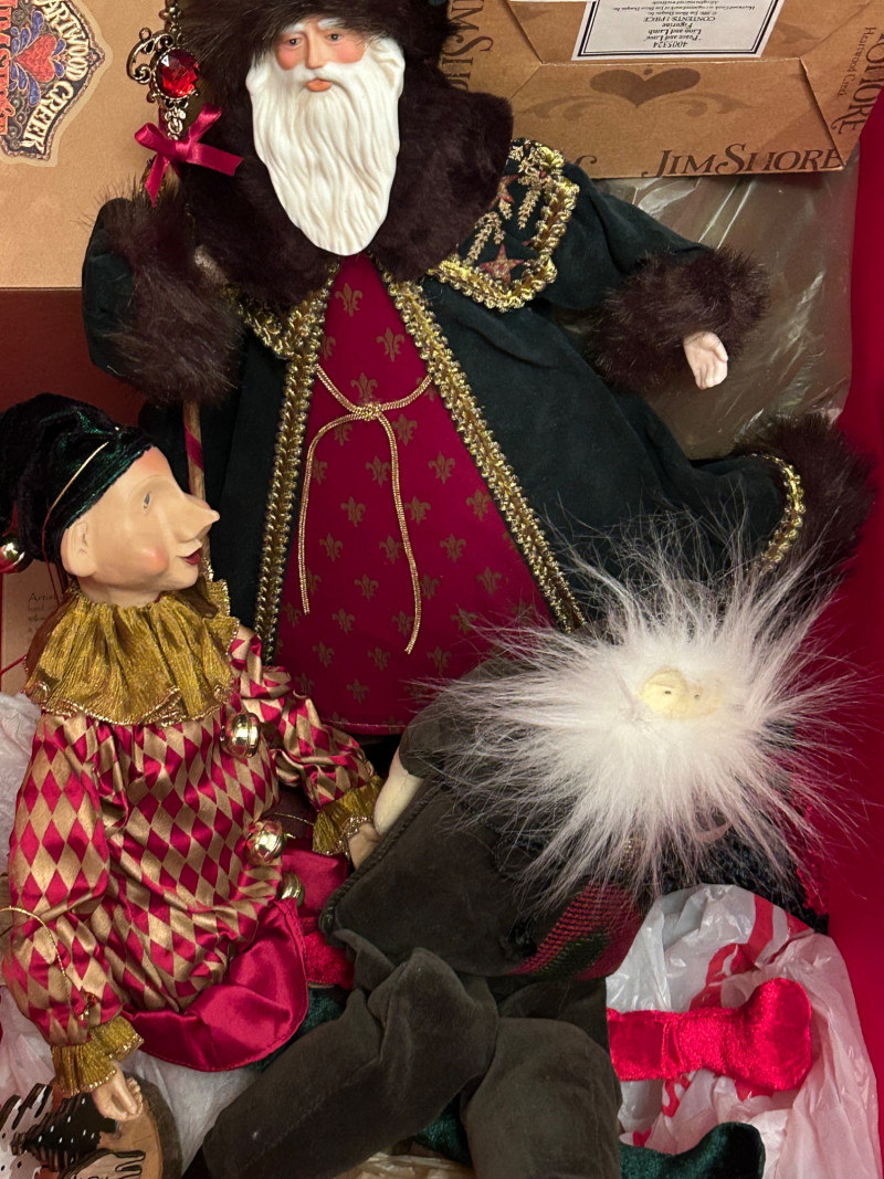 Loads of ornaments, Christmas Decor, including Jim Shore figures, Pillows and so much more. Vintage and newer items in this lot. Lots of value. 52” pre-lit tree