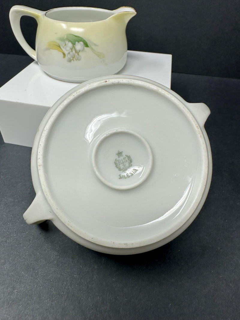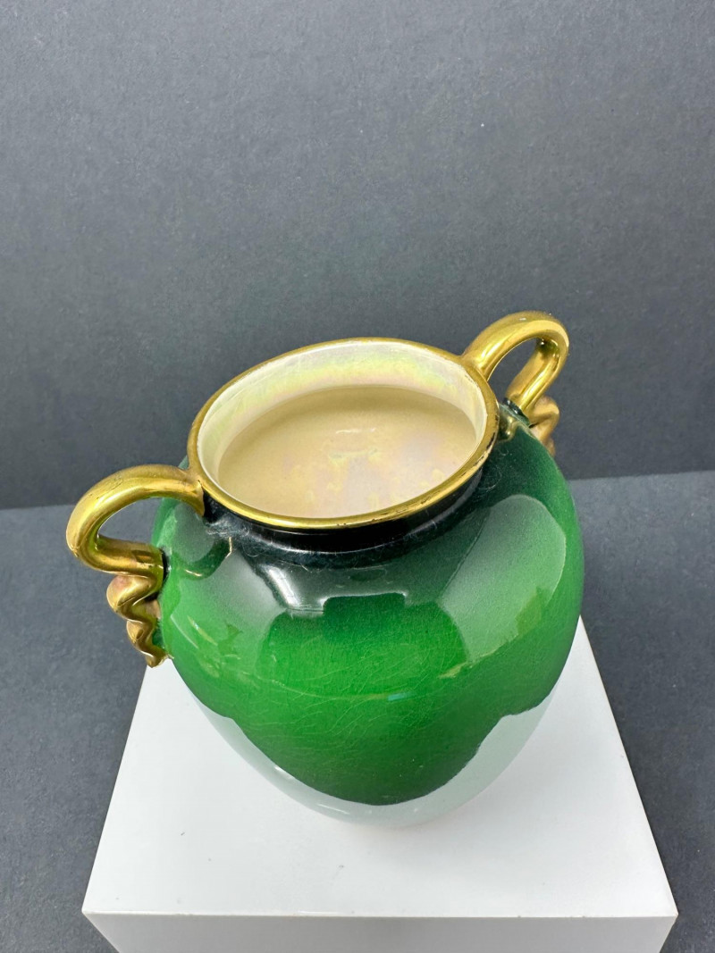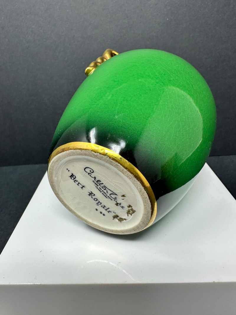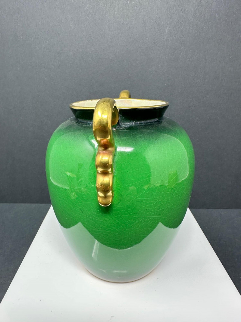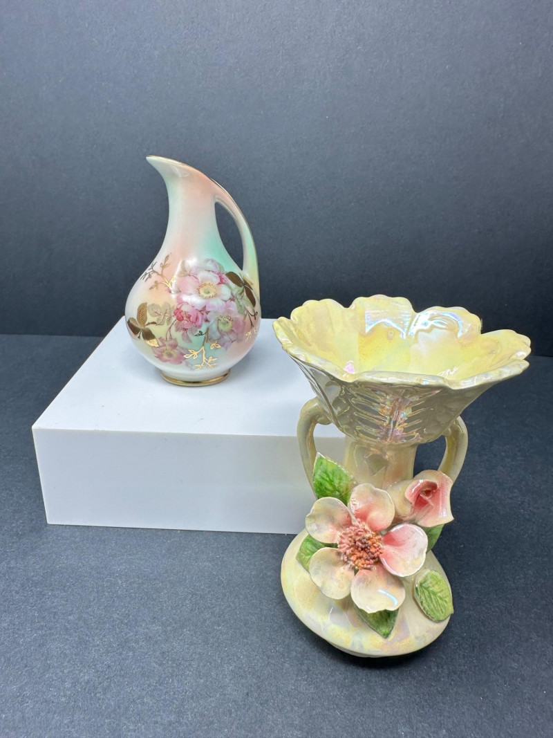 Carlton Ware green vase with yellow twin handles and black rim — classic mid‑century English pottery with vibrant glaze 5 x 5 Red and gold decorative glass vase with raised floral detailing 8" Tall RS Silesia matching porcelain sugar & creamer — floral motif, lidded, delicate and collectible White scalloped porcelain bowl with floral accents Small floral ceramic pitcher Cream‑colored vase with applied flower and leaf motif Small decorative urn/finial Pair of silver‑tone crumb trays with grapevine engraving and ornate leaf‑patterned edges (tray + matching scraper)