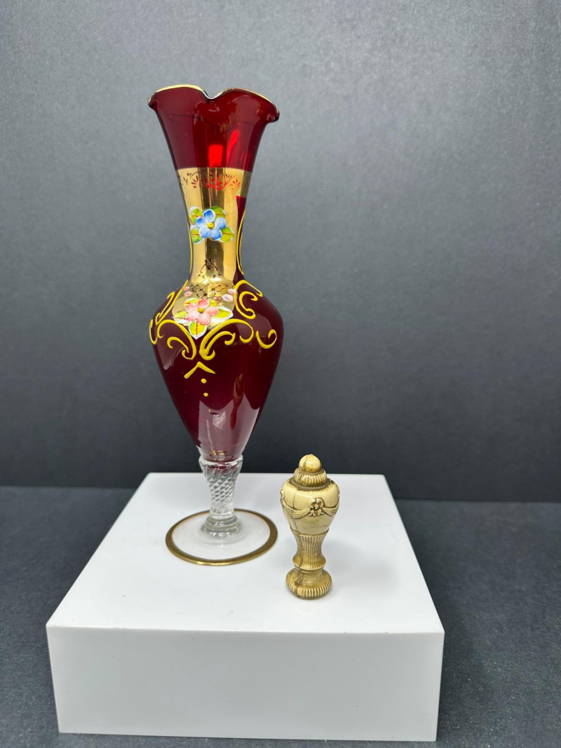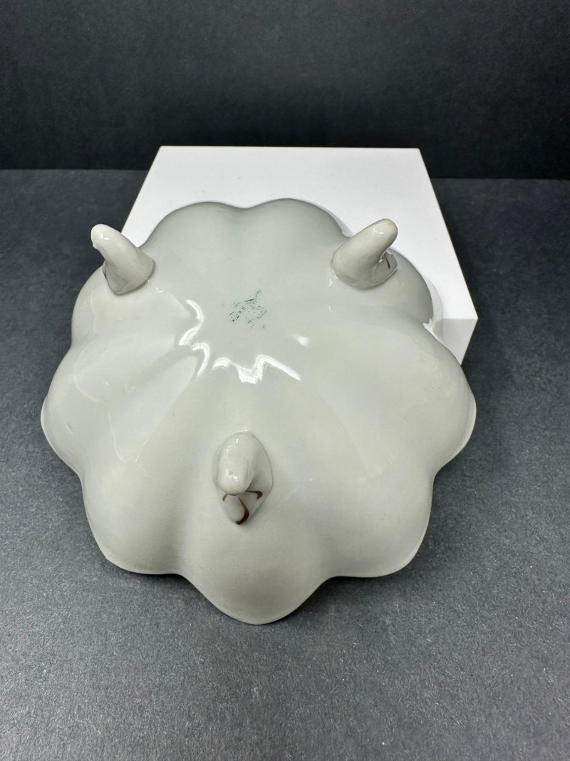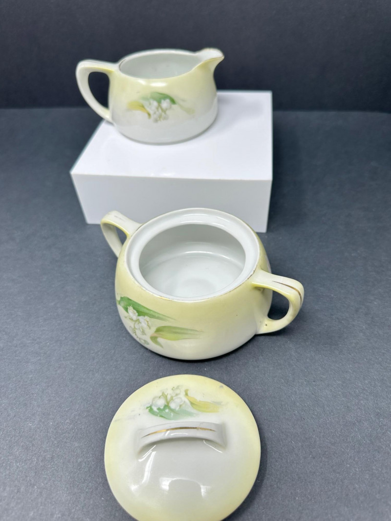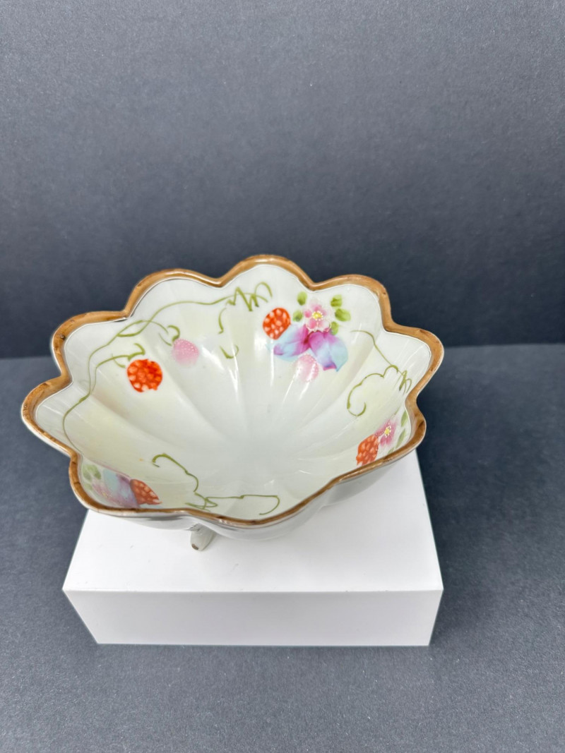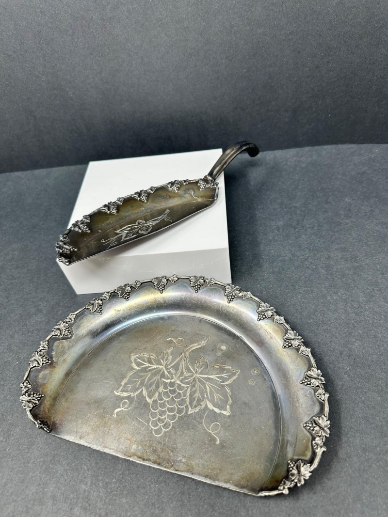 Carlton Ware green vase with yellow twin handles and black rim — classic mid‑century English pottery with vibrant glaze 5 x 5 Red and gold decorative glass vase with raised floral detailing 8" Tall RS Silesia matching porcelain sugar & creamer — floral motif, lidded, delicate and collectible White scalloped porcelain bowl with floral accents Small floral ceramic pitcher Cream‑colored vase with applied flower and leaf motif Small decorative urn/finial Pair of silver‑tone crumb trays with grapevine engraving and ornate leaf‑patterned edges (tray + matching scraper)