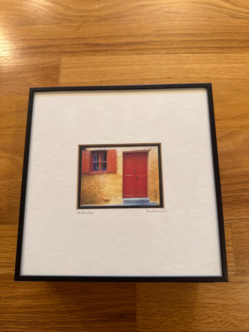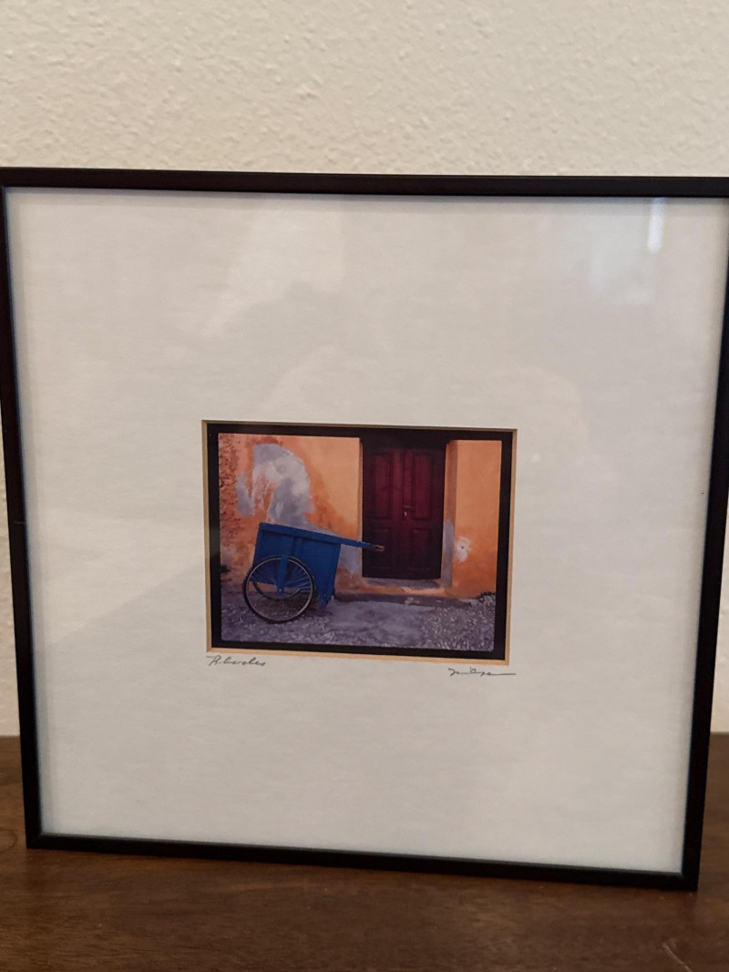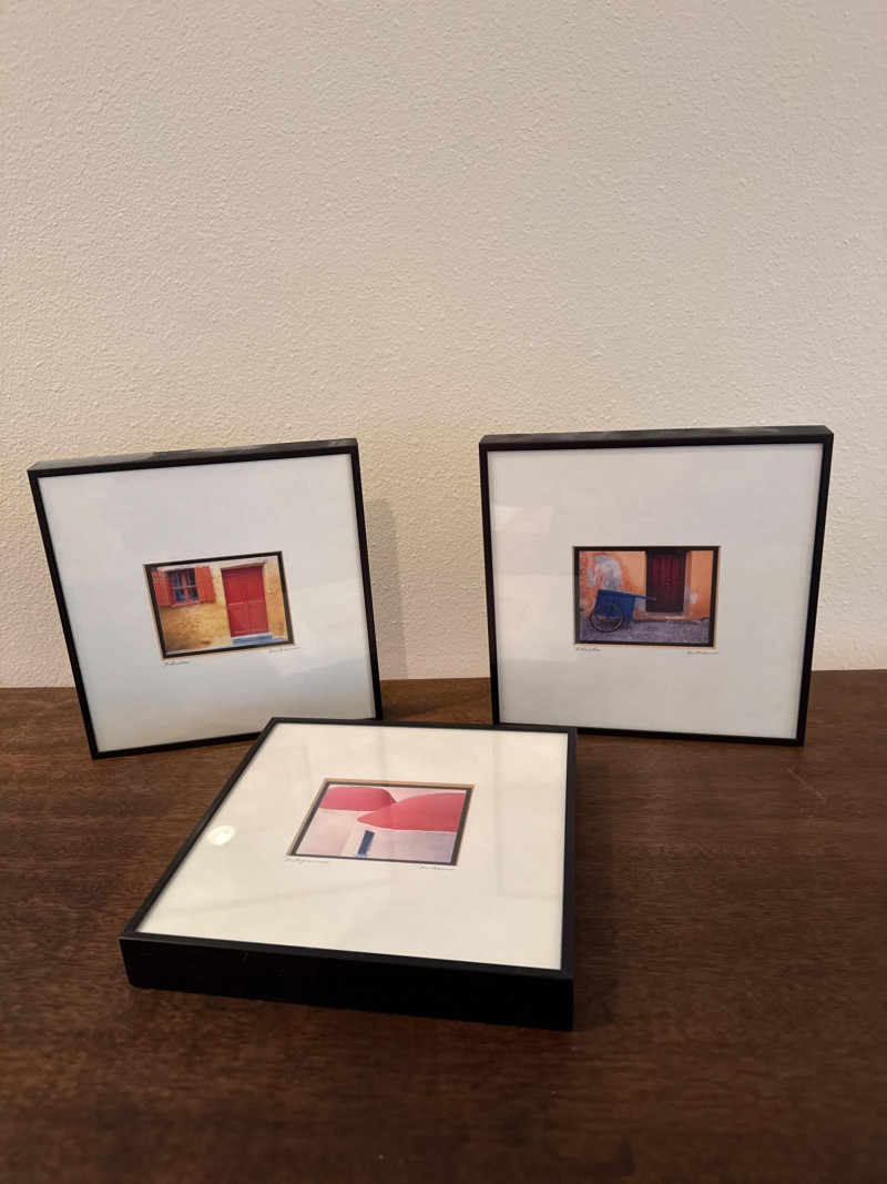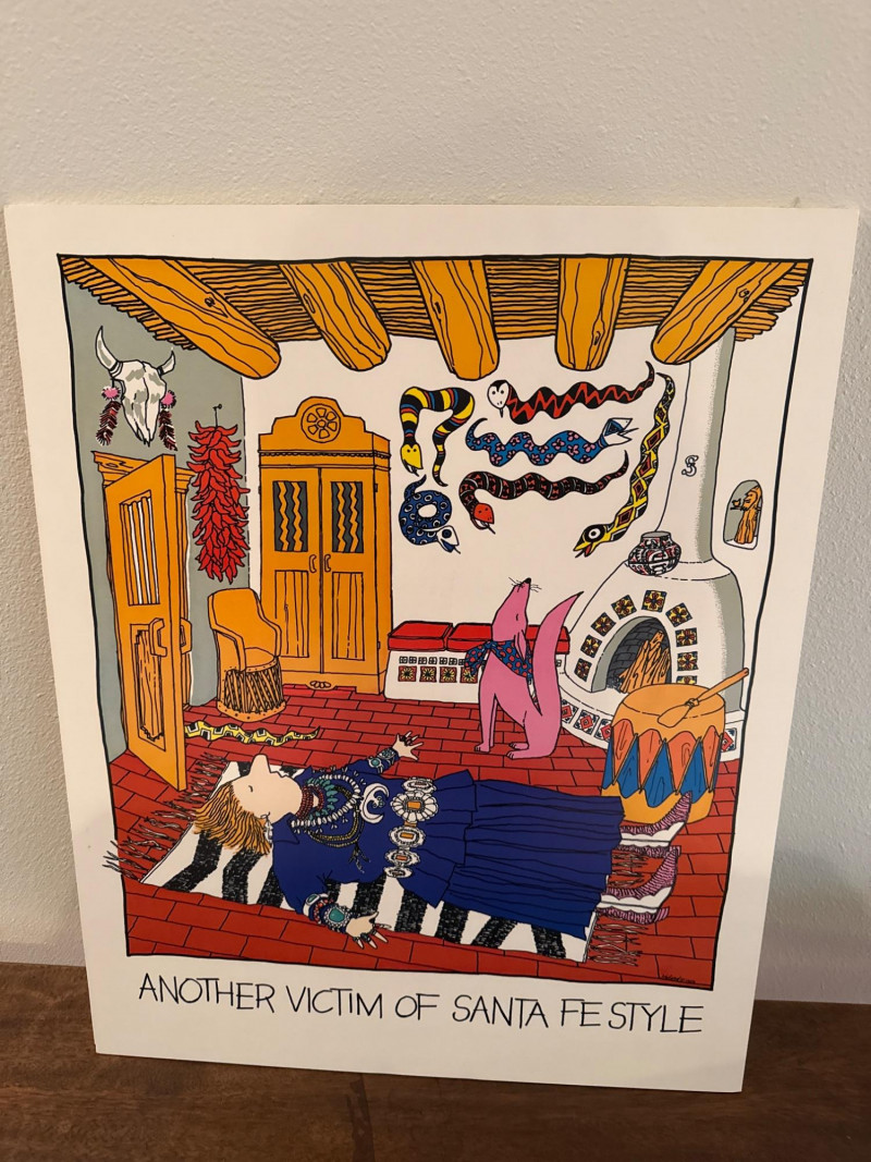 A vibrant Southwestern‑themed grouping featuring one large poster print, three small framed architectural prints, and two pieces of pottery including a green ceramic bowl and a round ceramic tray. The poster, titled “Another Victim of Santa Fe Style,” showcases bold colors and classic regional motifs, while the trio of small framed prints highlights doors and windows characteristic of Southwestern architecture. Poster measures- 18 x 22 Smaller framed prints- 7 x 7