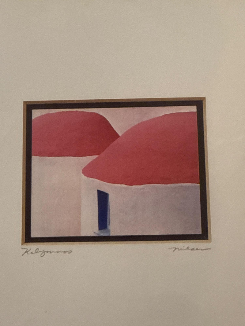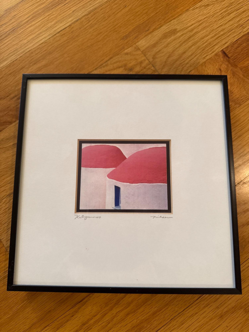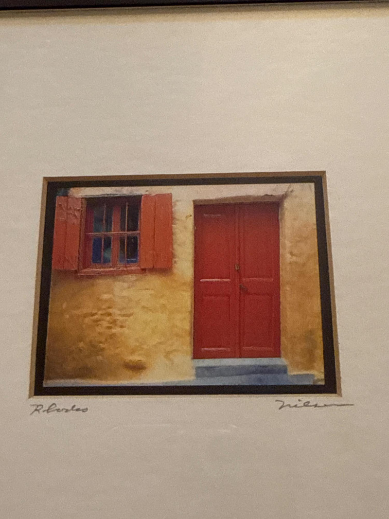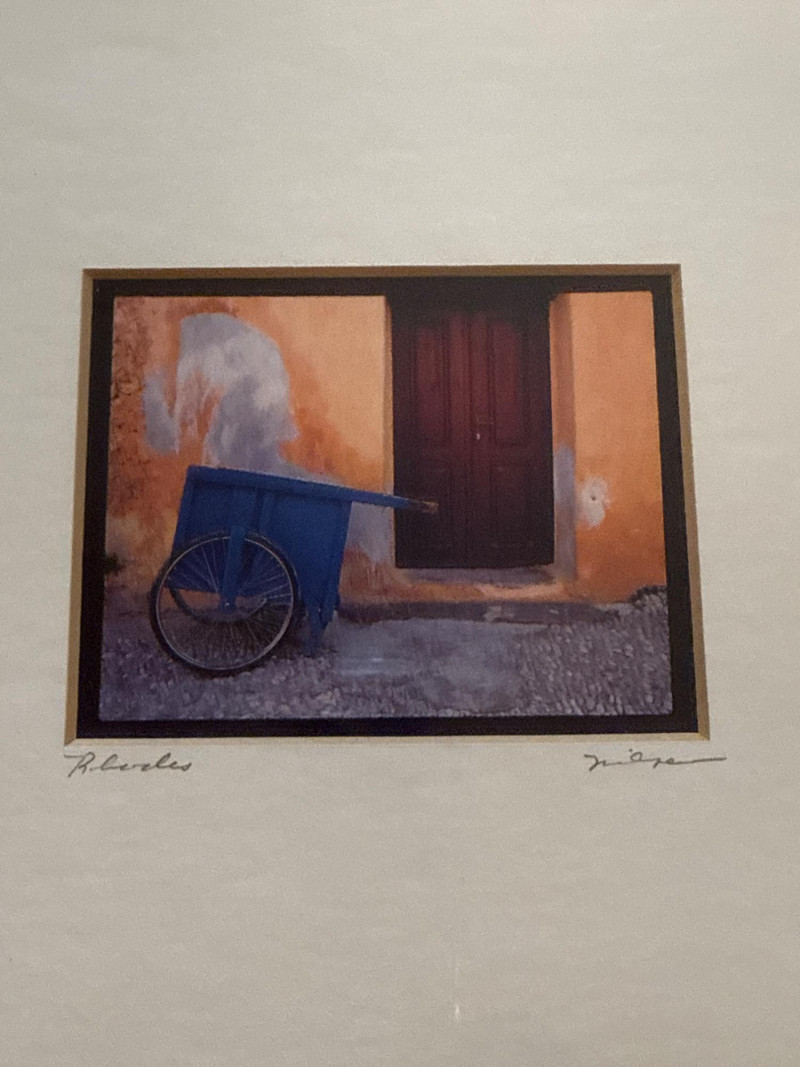 A vibrant Southwestern‑themed grouping featuring one large poster print, three small framed architectural prints, and two pieces of pottery including a green ceramic bowl and a round ceramic tray. The poster, titled “Another Victim of Santa Fe Style,” showcases bold colors and classic regional motifs, while the trio of small framed prints highlights doors and windows characteristic of Southwestern architecture. Poster measures- 18 x 22 Smaller framed prints- 7 x 7