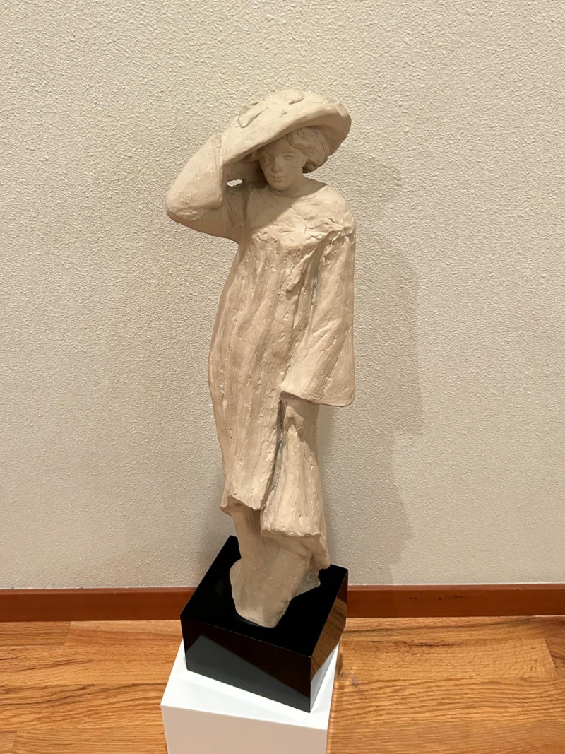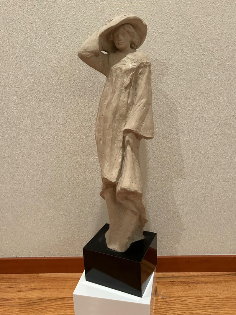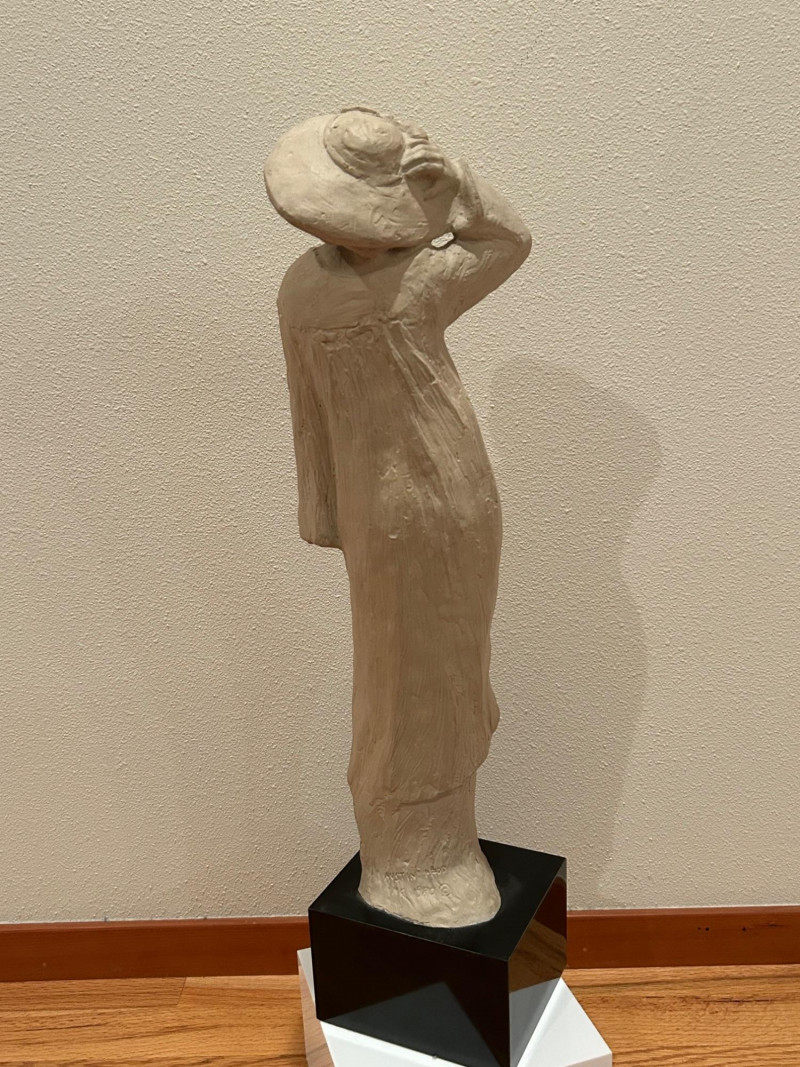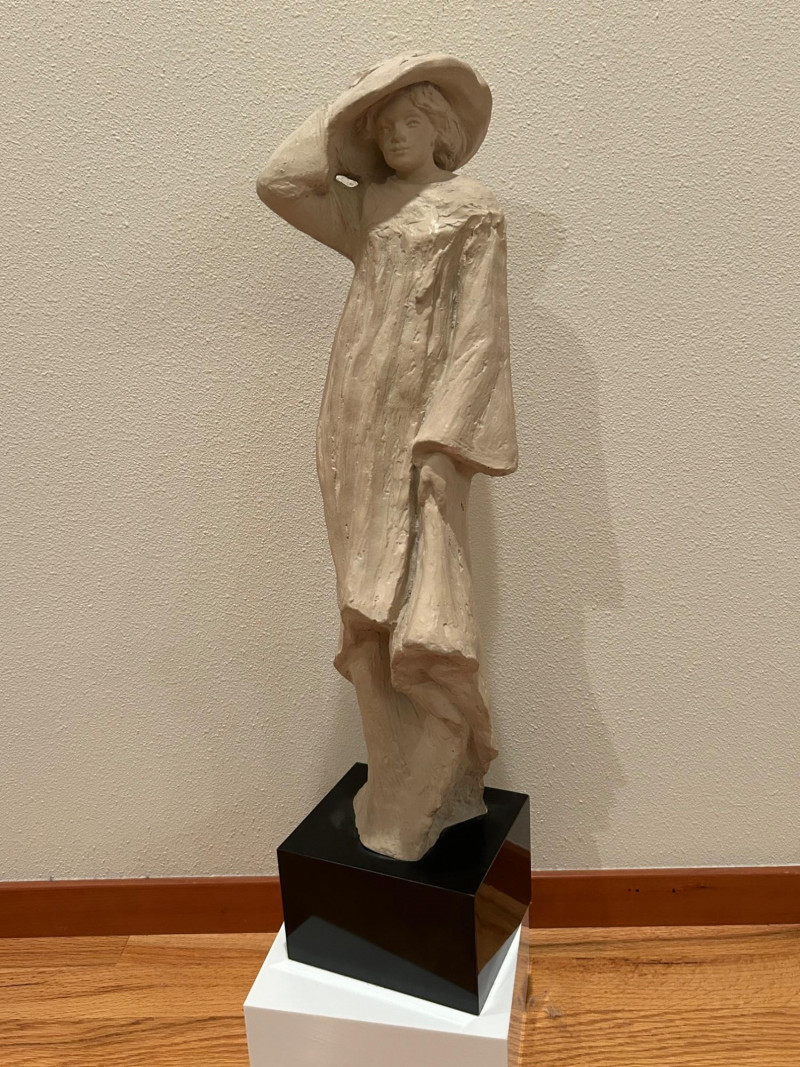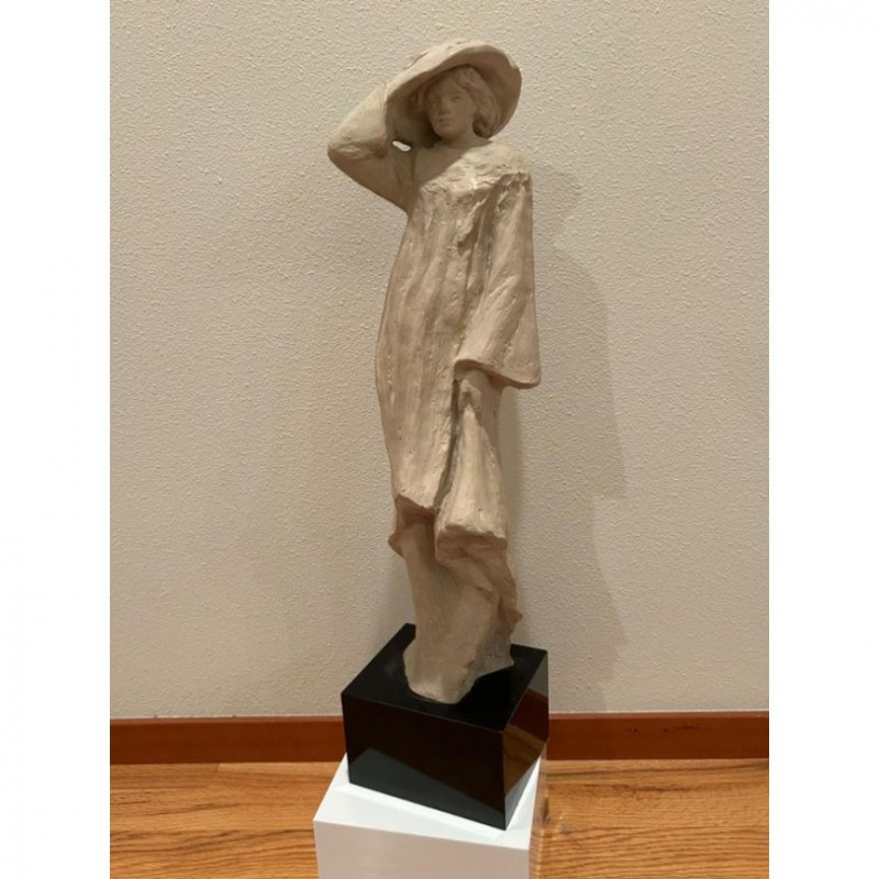 A striking and expressive 1980 Austin Productions sculpture titled “Windblow” by artist Klara Sever. This elegant figure captures a moment of motion as the subject lifts a wide‑brimmed hat against an unseen breeze. The sculptor’s signature textured garment and elongated form create a sense of movement and grace, characteristic of Sever’s work. Rendered in Austin Prod.’s classic composite material with a light stone‑like finish, the piece is mounted on a black pedestal base, offering a clean, modern contrast that enhances its sculptural presence.