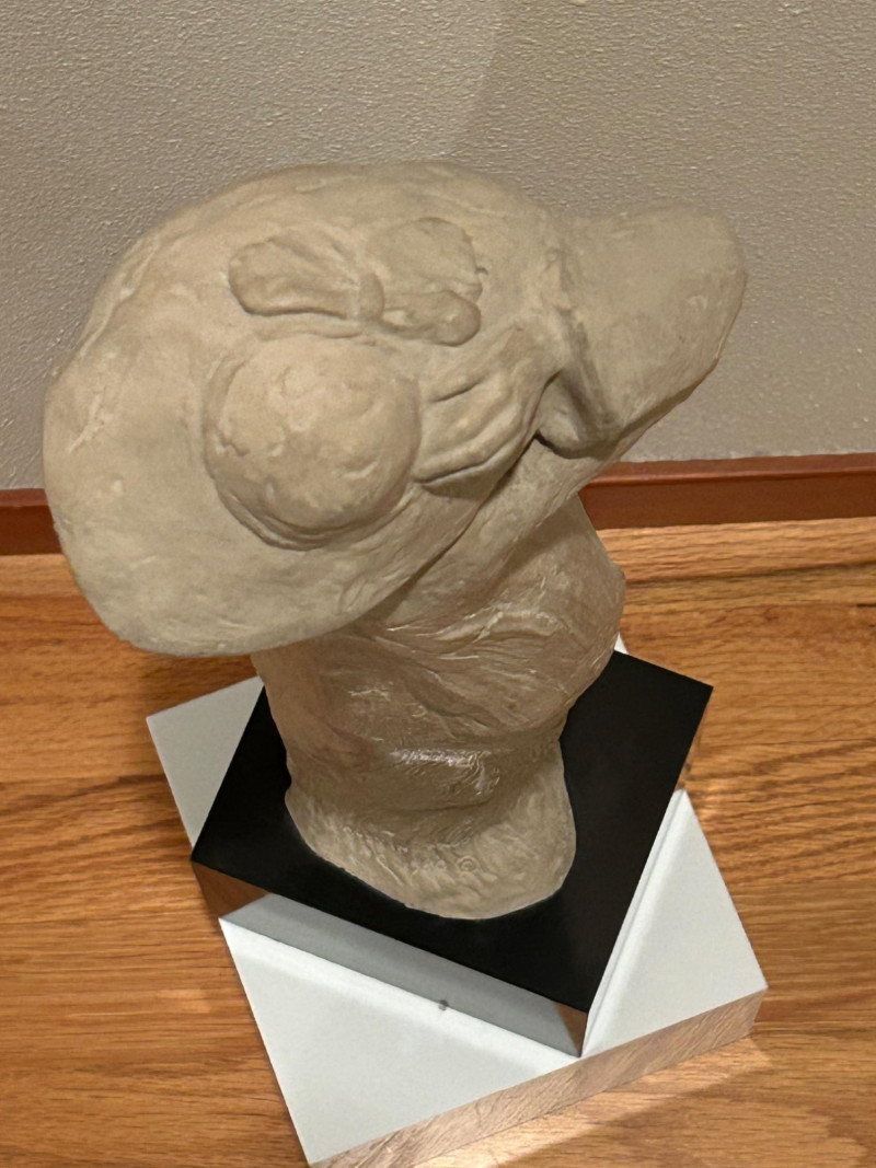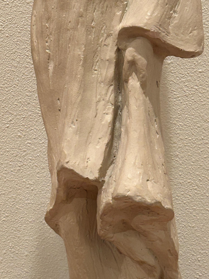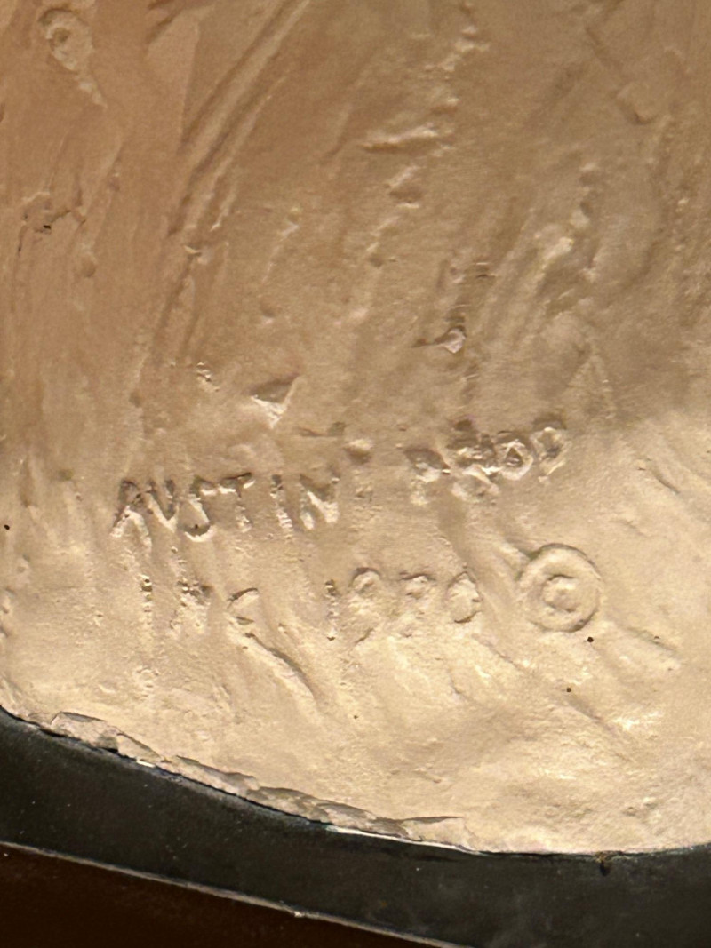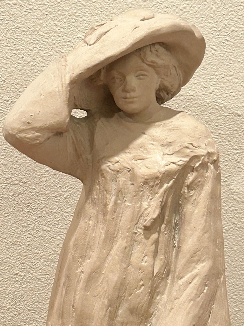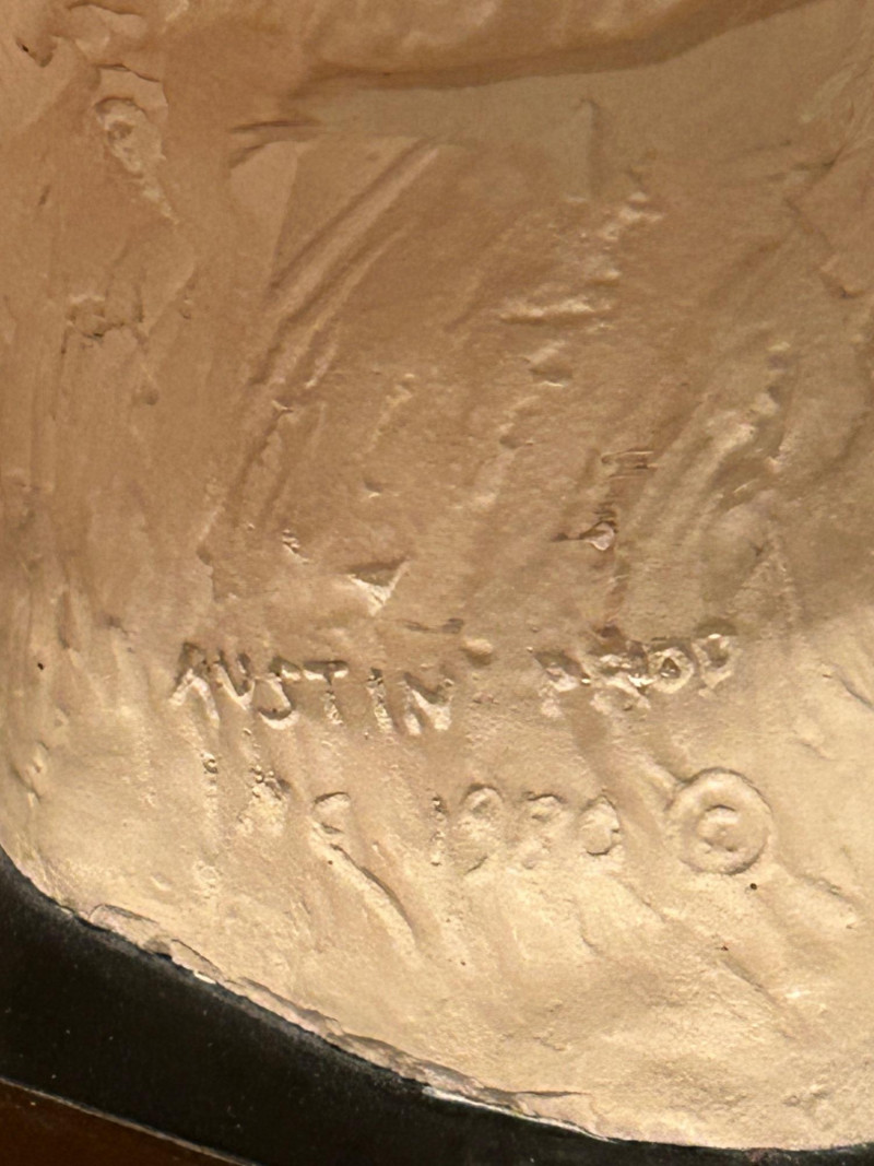 A striking and expressive 1980 Austin Productions sculpture titled “Windblow” by artist Klara Sever. This elegant figure captures a moment of motion as the subject lifts a wide‑brimmed hat against an unseen breeze. The sculptor’s signature textured garment and elongated form create a sense of movement and grace, characteristic of Sever’s work. Rendered in Austin Prod.’s classic composite material with a light stone‑like finish, the piece is mounted on a black pedestal base, offering a clean, modern contrast that enhances its sculptural presence.
