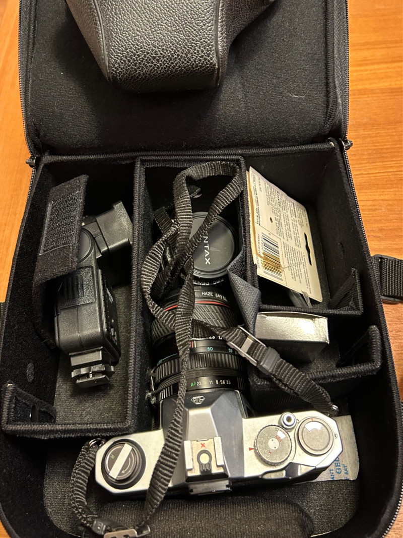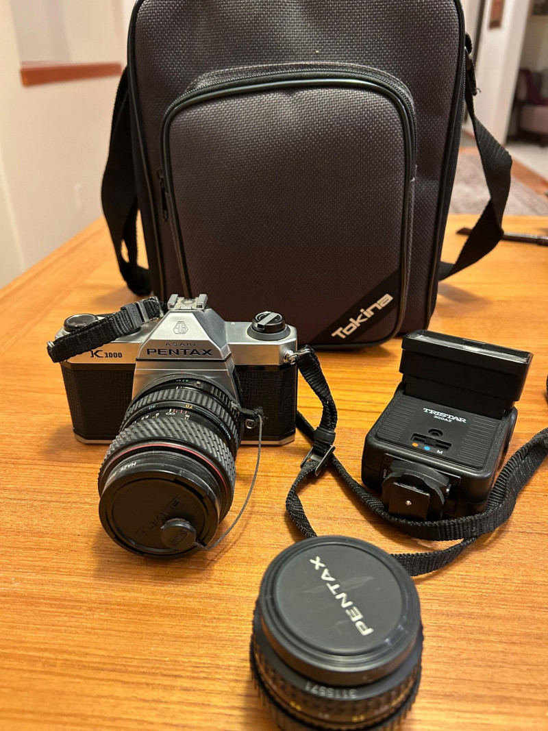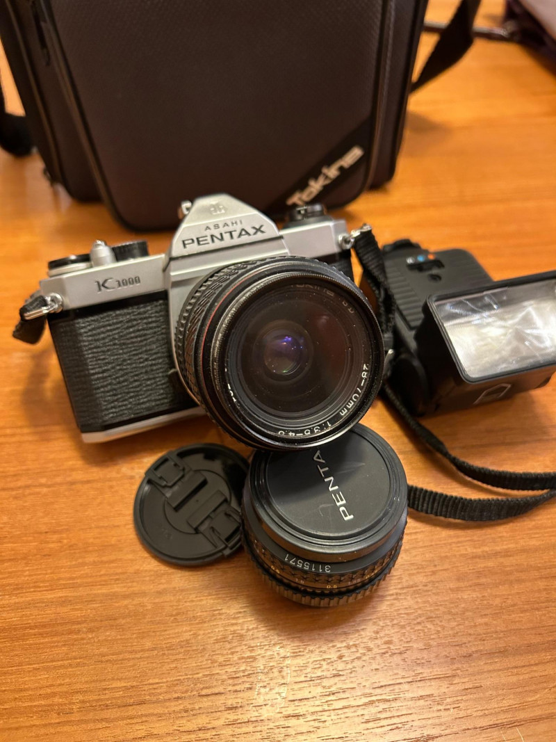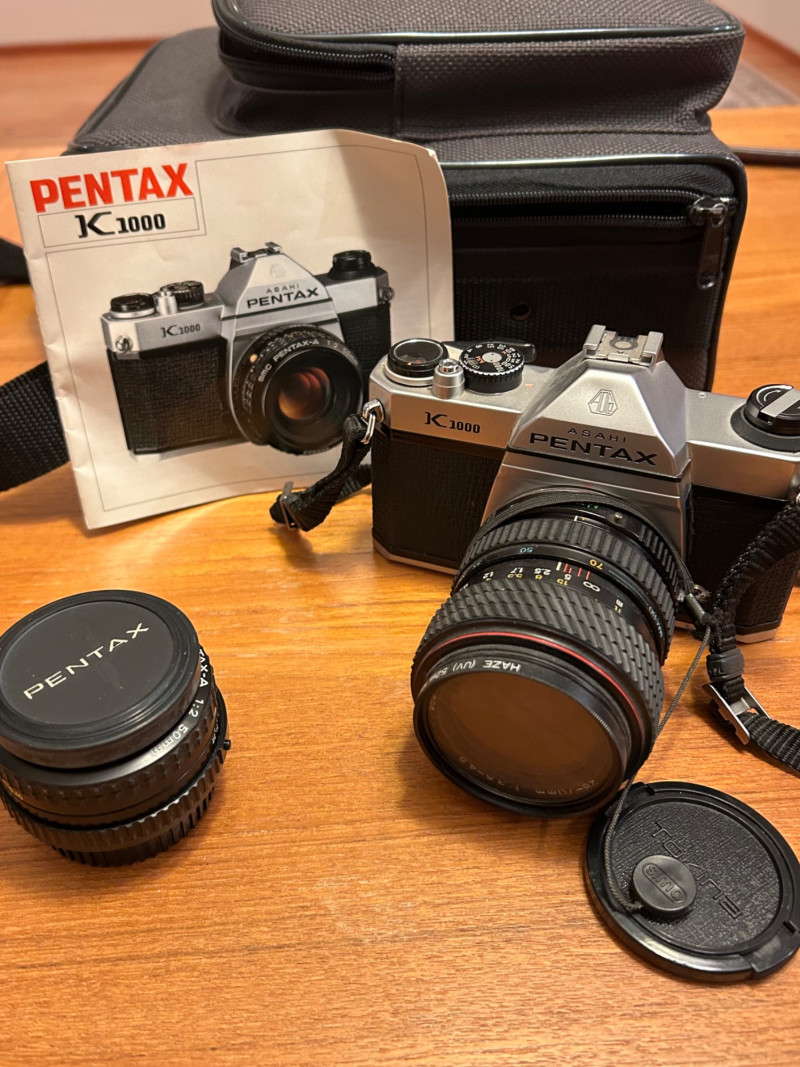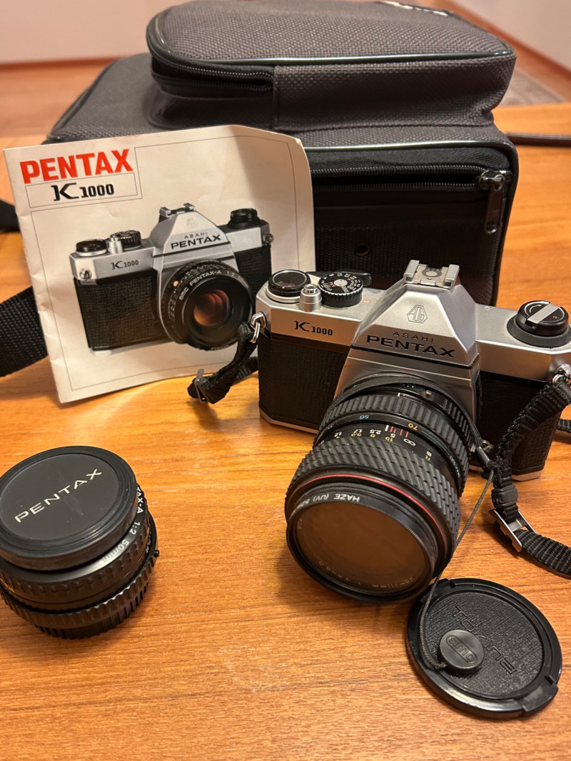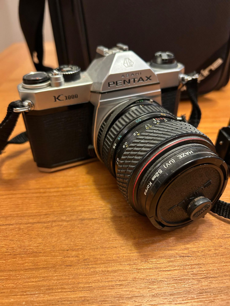A classic Asahi Pentax K1000 35mm film camera set, long celebrated for its durability and fully manual controls—an ideal choice for students, collectors, and analog photography enthusiasts. This kit includes the camera body, attached lens with a 52mm Haze/UV filter, original Pentax K1000 instruction manual, lens cap, and a protective carrying case.
