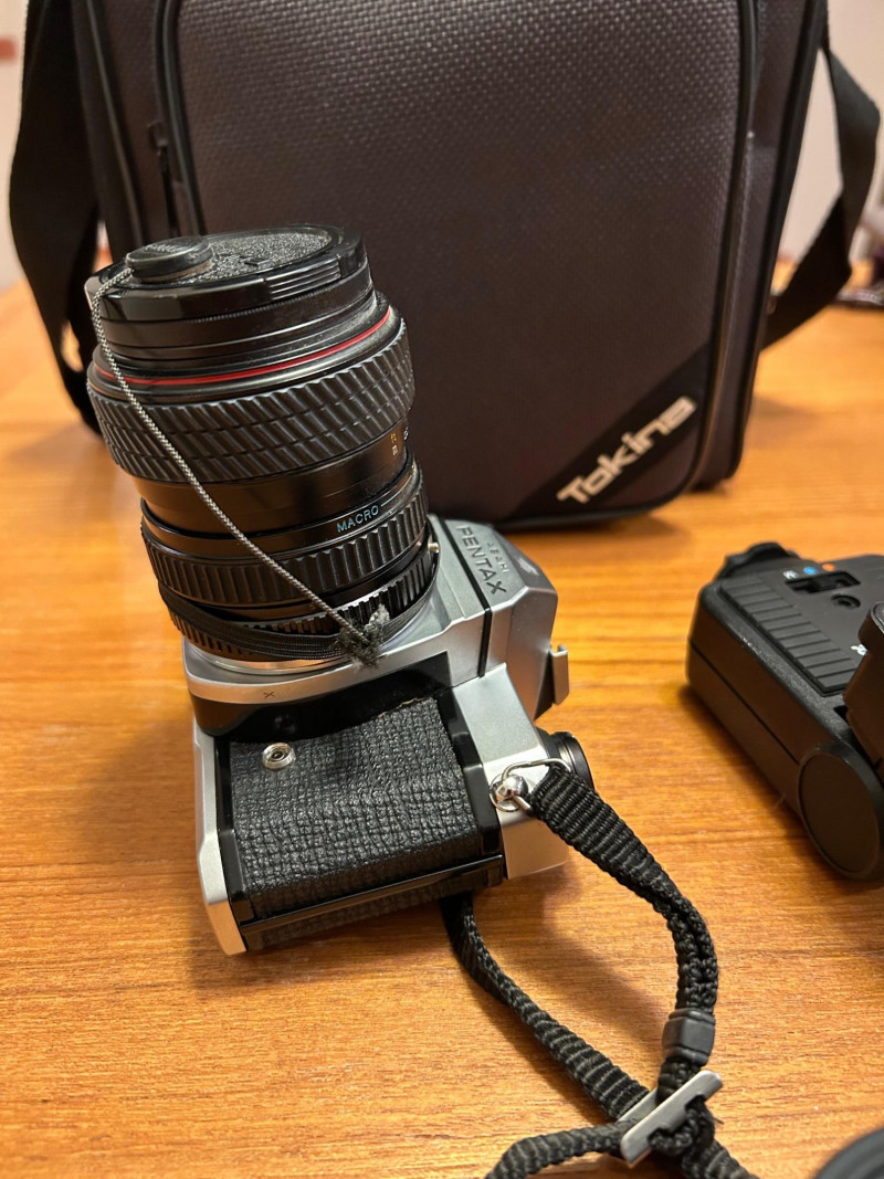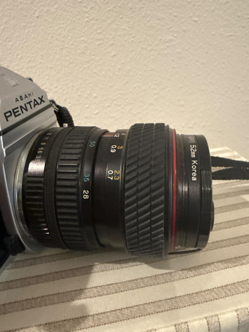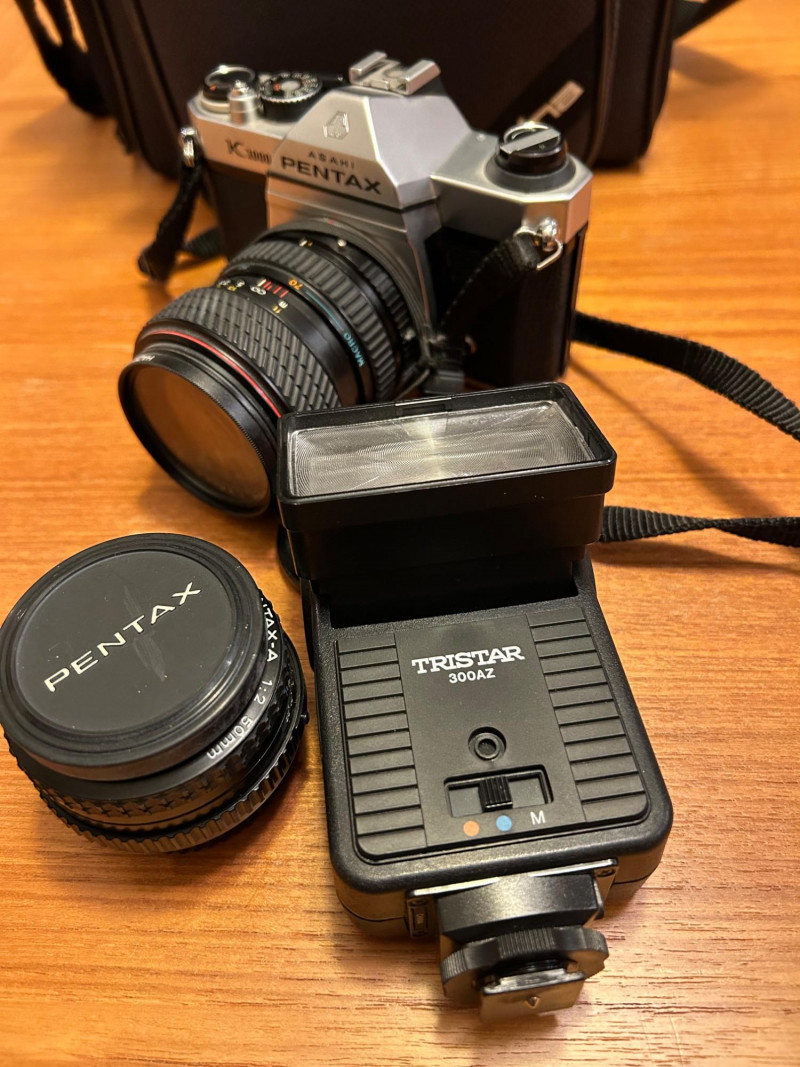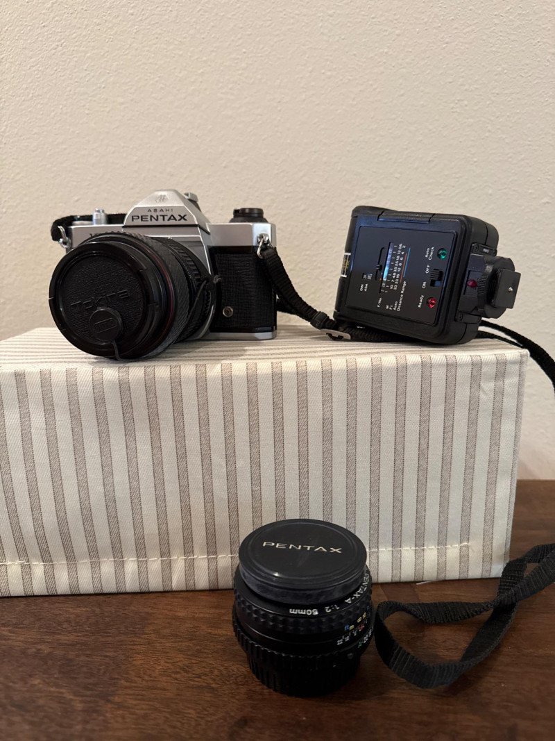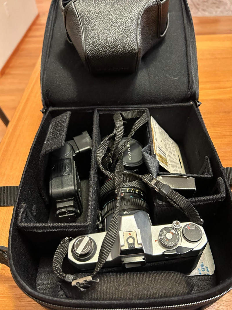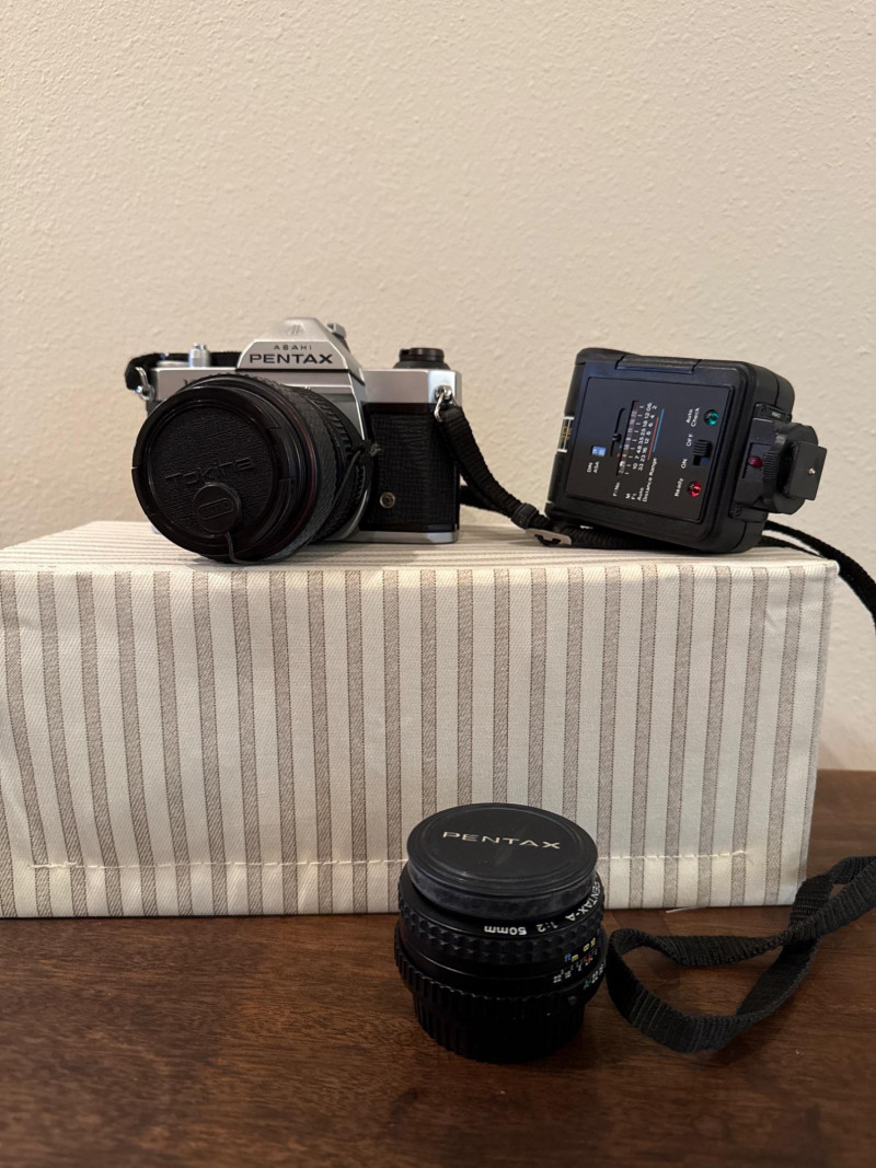 A classic Asahi Pentax K1000 35mm film camera set, long celebrated for its durability and fully manual controls—an ideal choice for students, collectors, and analog photography enthusiasts. This kit includes the camera body, attached lens with a 52mm Haze/UV filter, original Pentax K1000 instruction manual, lens cap, and a protective carrying case.