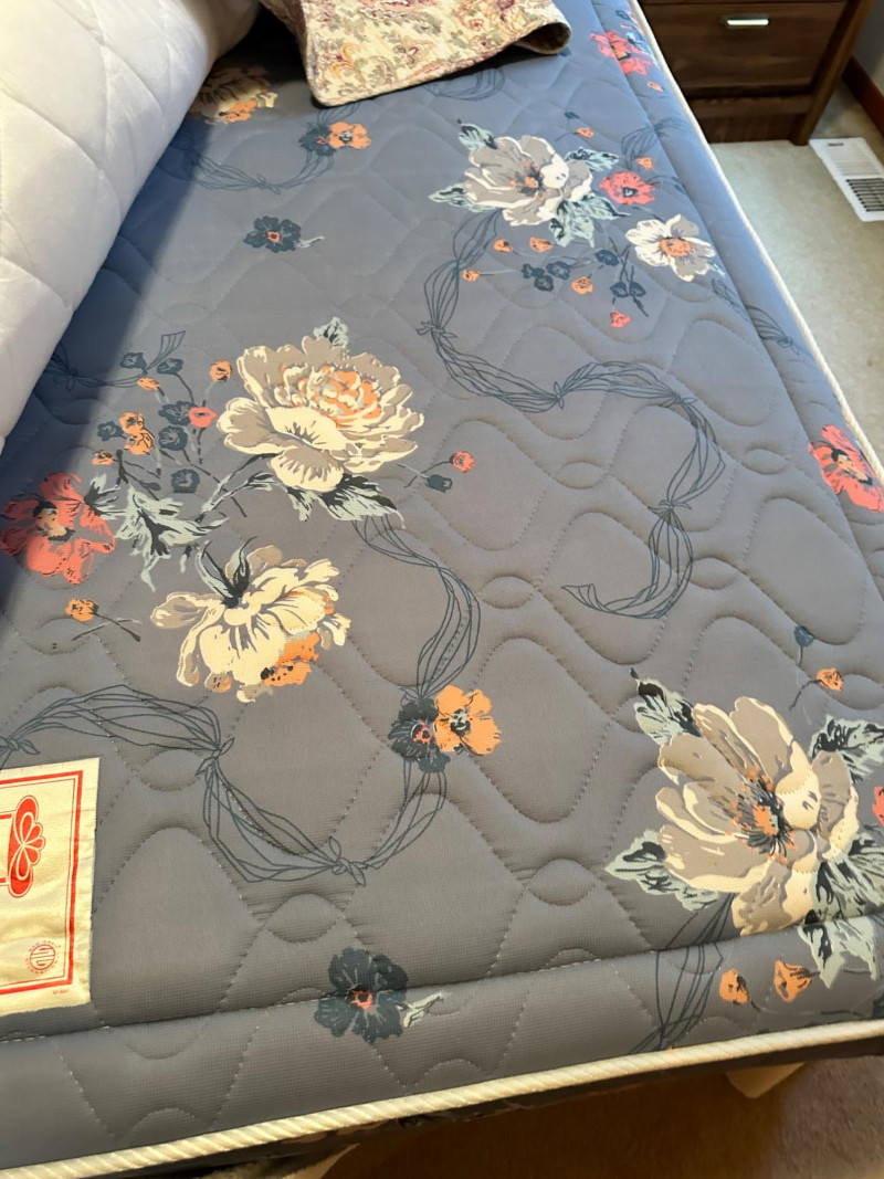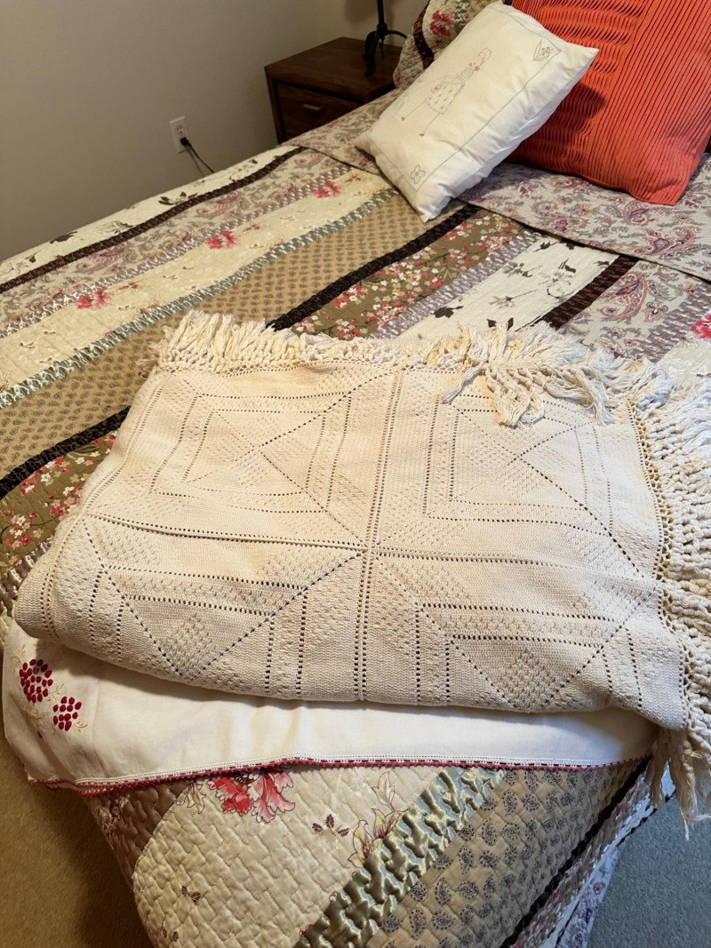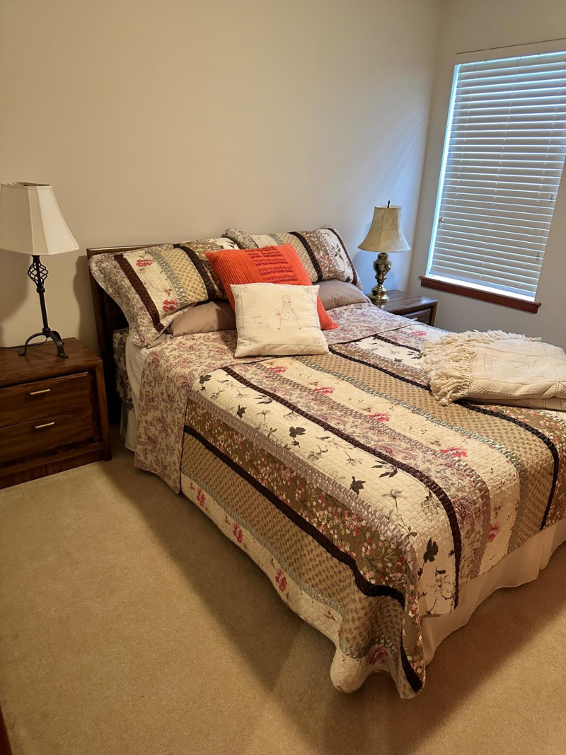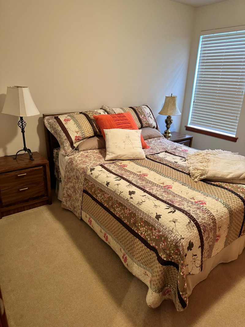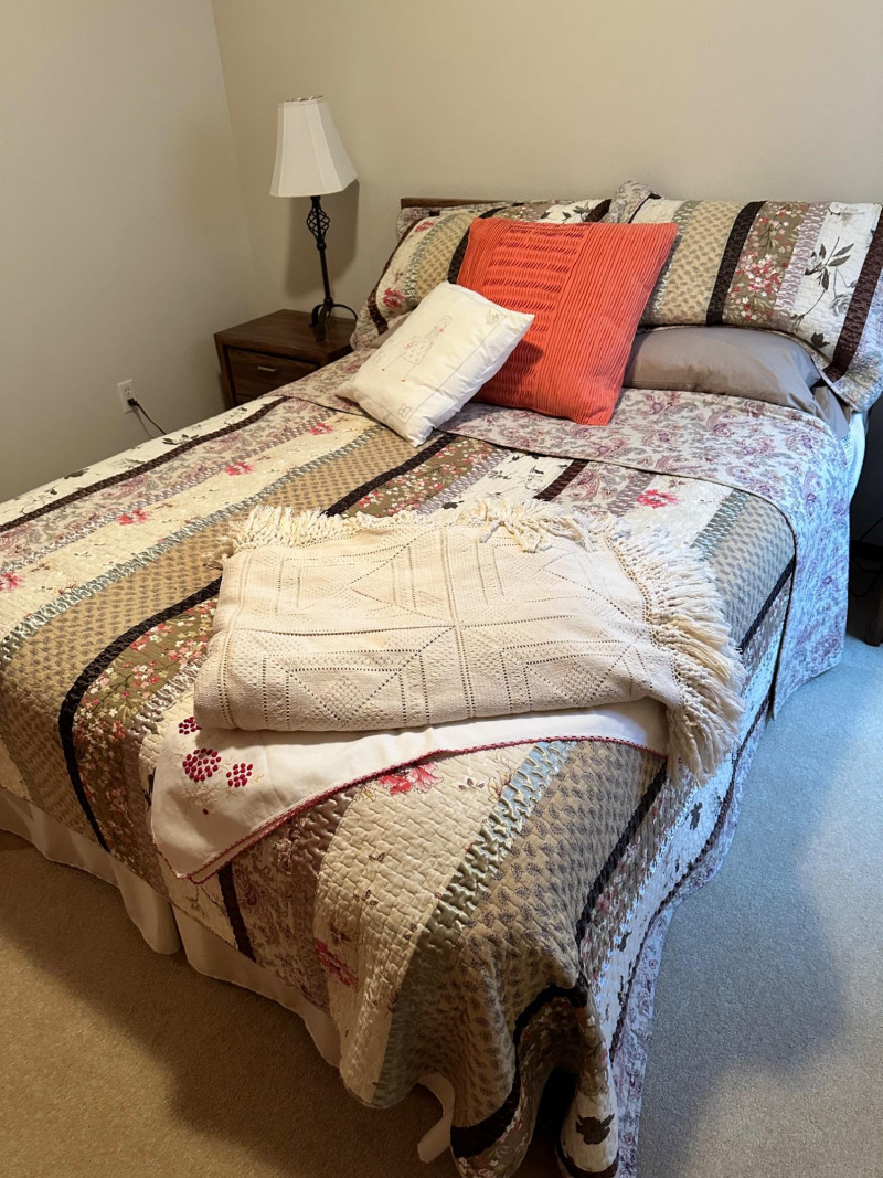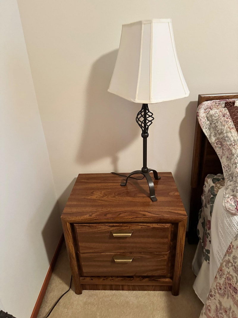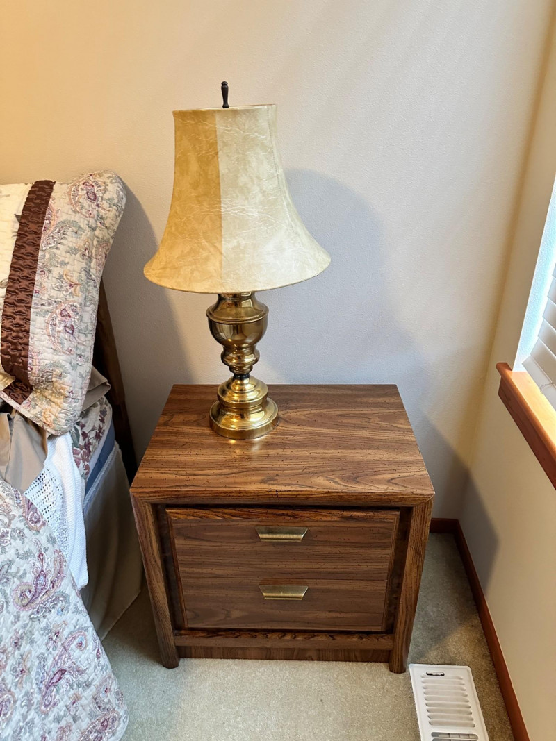 A clean, coordinated bedroom lot featuring a full‑size bed with bedding, two matching nightstands, and two lamps, all from a well‑kept, smoke‑free, pet‑free home. The bed is dressed in a patterned quilt with layered pillows, and the set includes both bedside lamps as shown. Bed measures 22" W × 21" T.