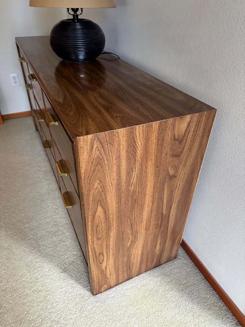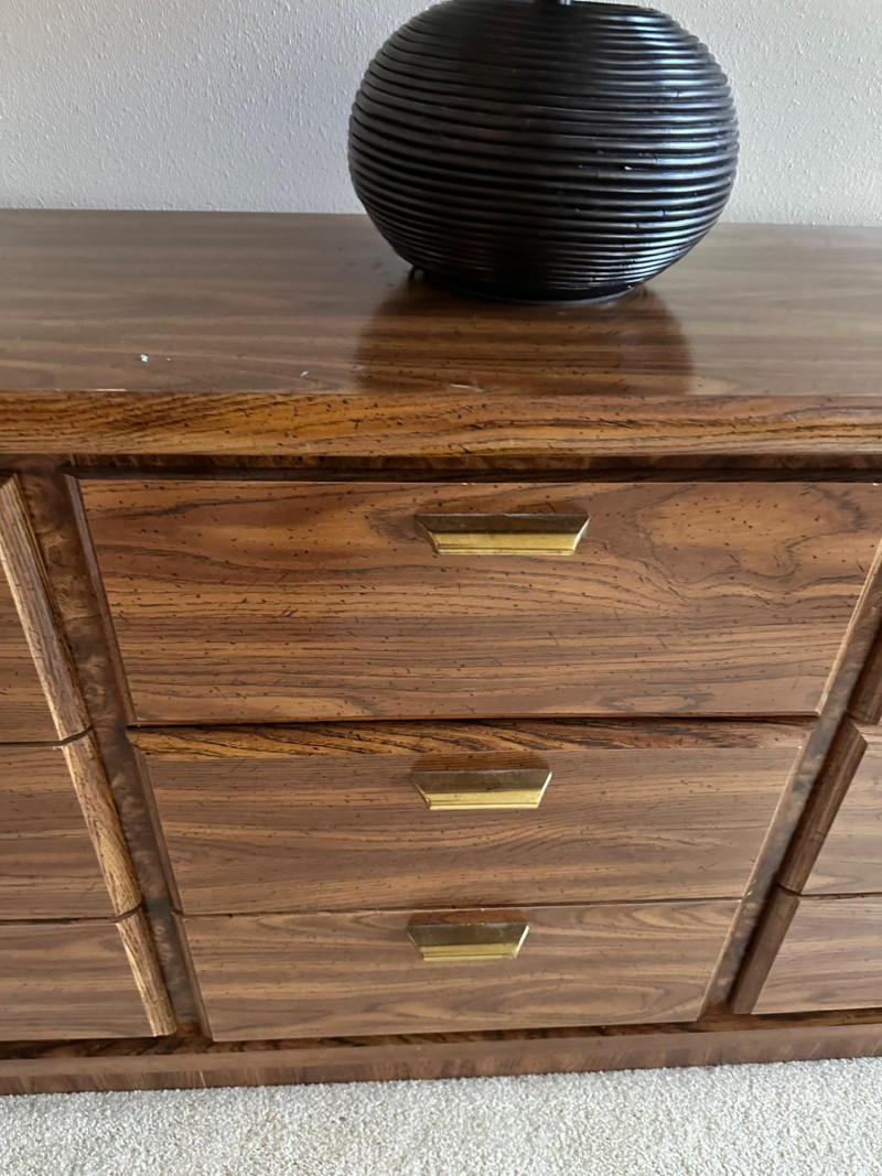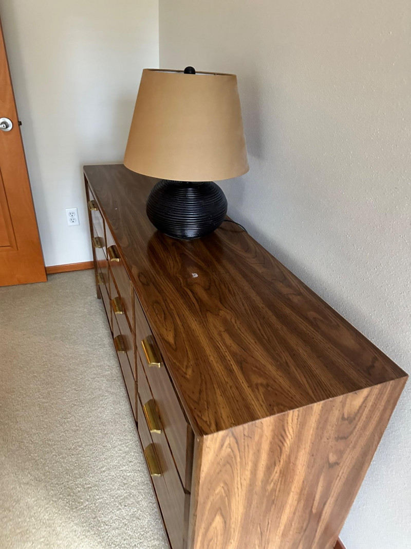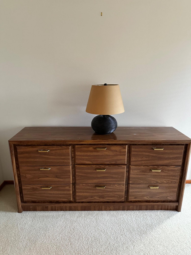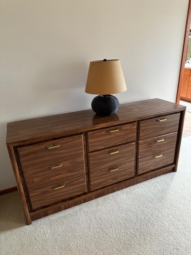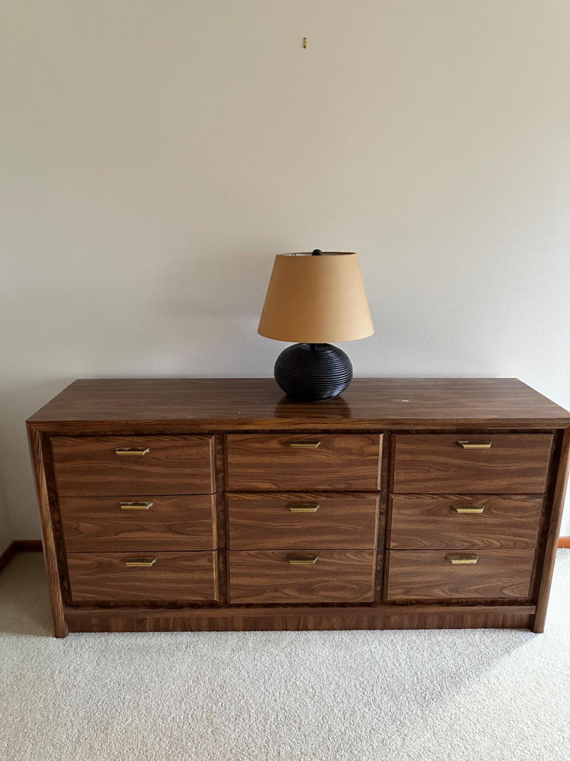 A nine‑drawer dresser paired with a coordinating table lamp, featuring a warm woodlike finish with brass pulls and a classic black‑base lamp topped with a neutral pleated shade Dresser measures- APPRX- 72" W x 20" D x 31T Not sure if this is pressed wood, follows a grain but does appear to be manufactured. Lame included, from base to top of shade- 20"
