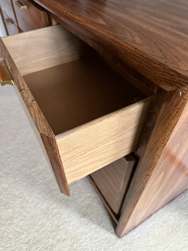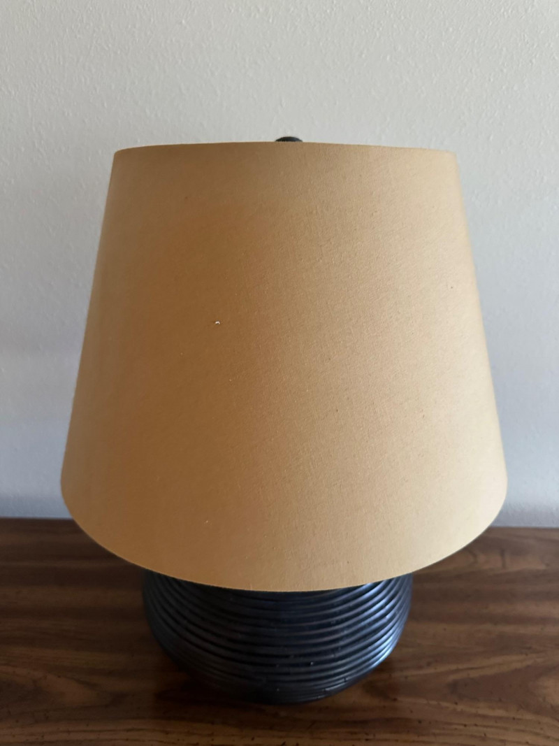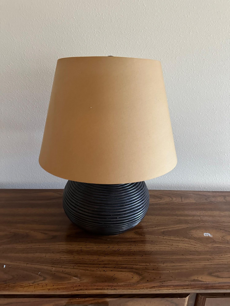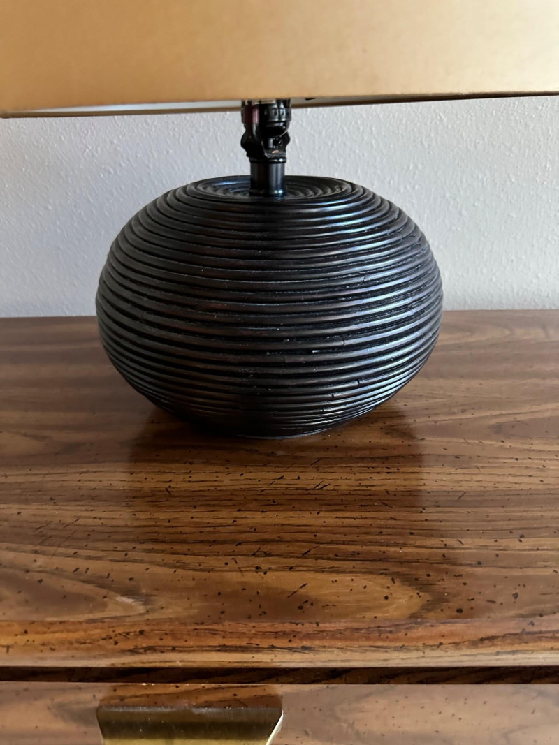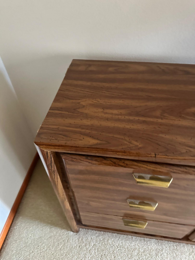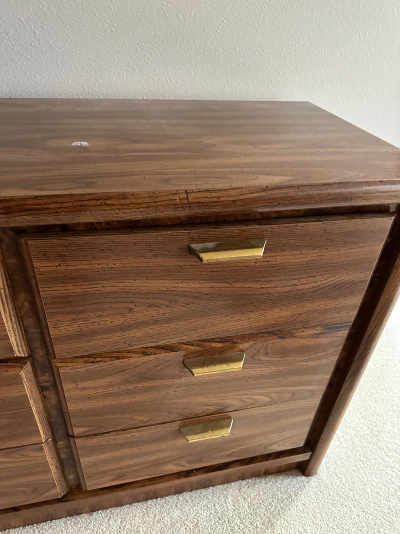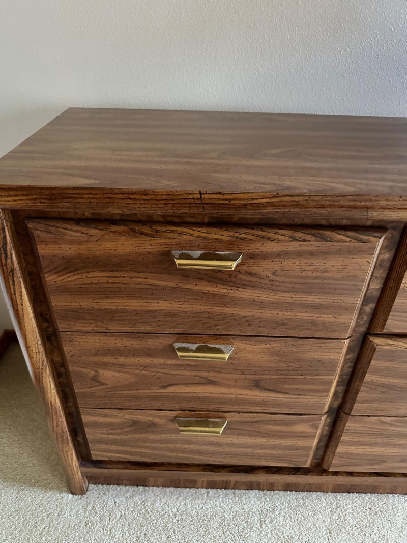 A nine‑drawer dresser paired with a coordinating table lamp, featuring a warm woodlike finish with brass pulls and a classic black‑base lamp topped with a neutral pleated shade Dresser measures- APPRX- 72" W x 20" D x 31T Not sure if this is pressed wood, follows a grain but does appear to be manufactured. Lame included, from base to top of shade- 20"