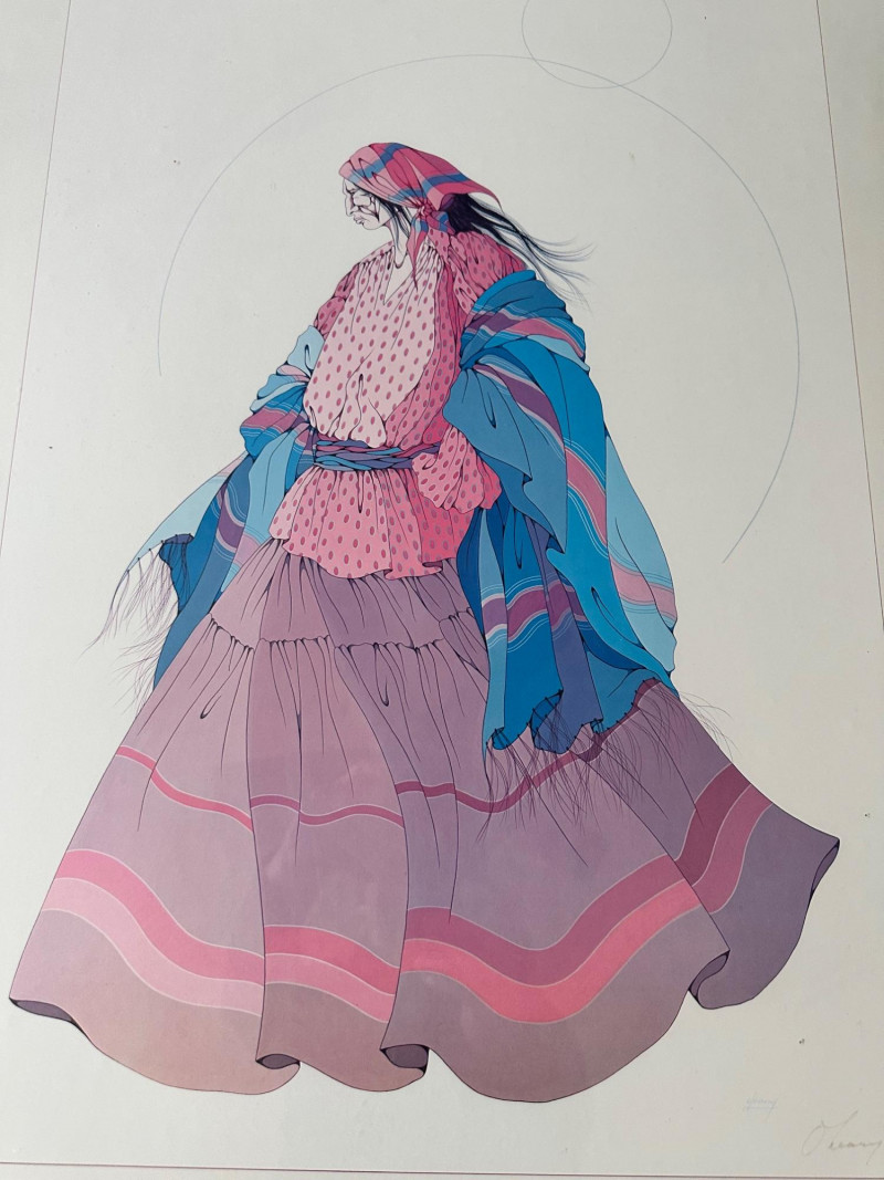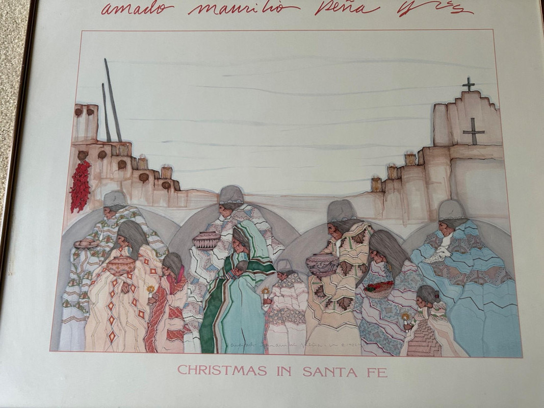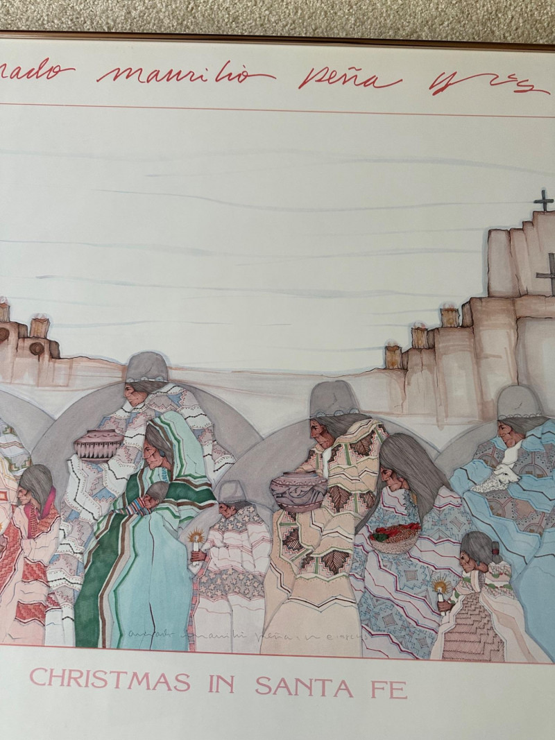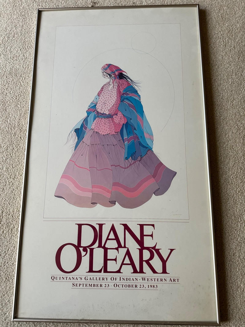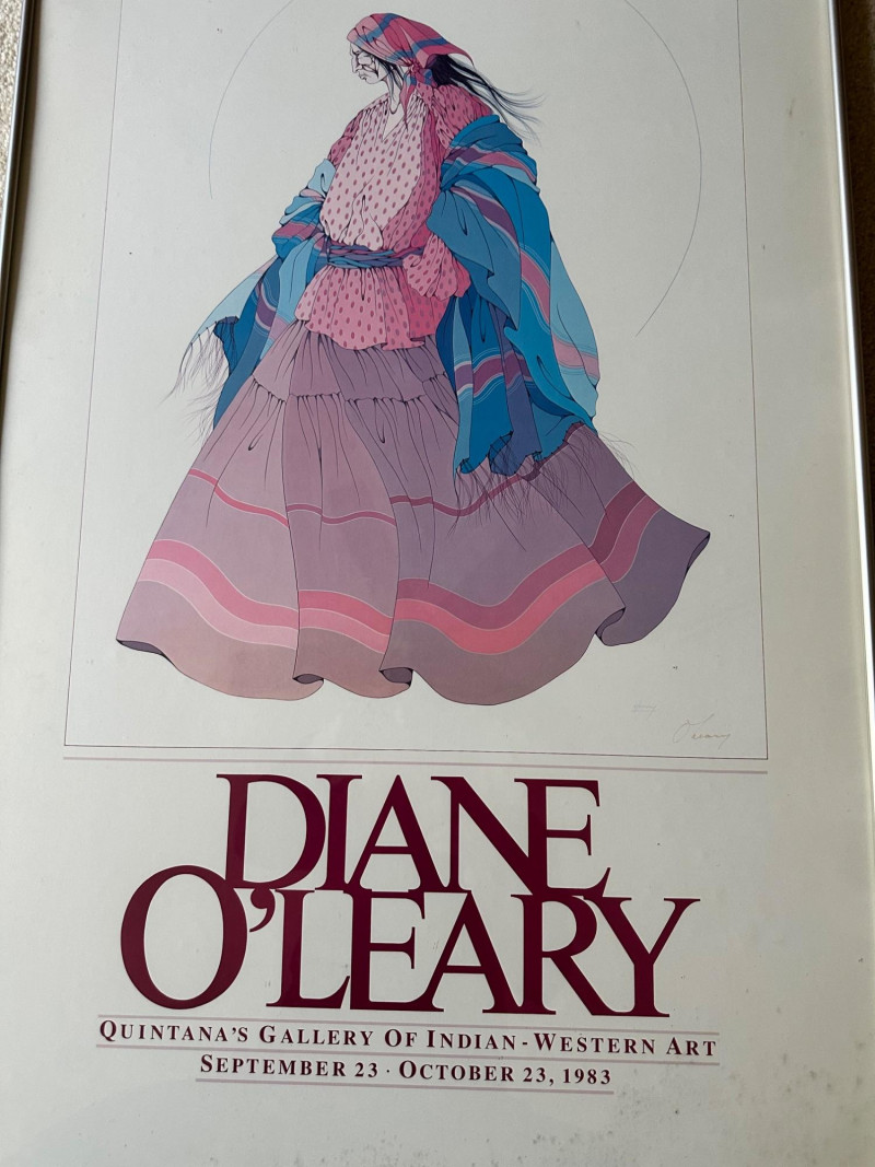 A vibrant Southwestern poster depicting figures in traditional attire gathered before adobe buildings and a mission church, rendered in Peña’s signature bold, graphic style and rich earth‑tone palette. A detailed exhibition poster featuring a woman in flowing, patterned traditional dress, showcasing O’Leary’s refined linework and color, originally produced for her 1983 show at Quintana’s Gallery of Indian‑Western Art.Amado Maurilio Peña Jr. – Christmas in Santa Fe