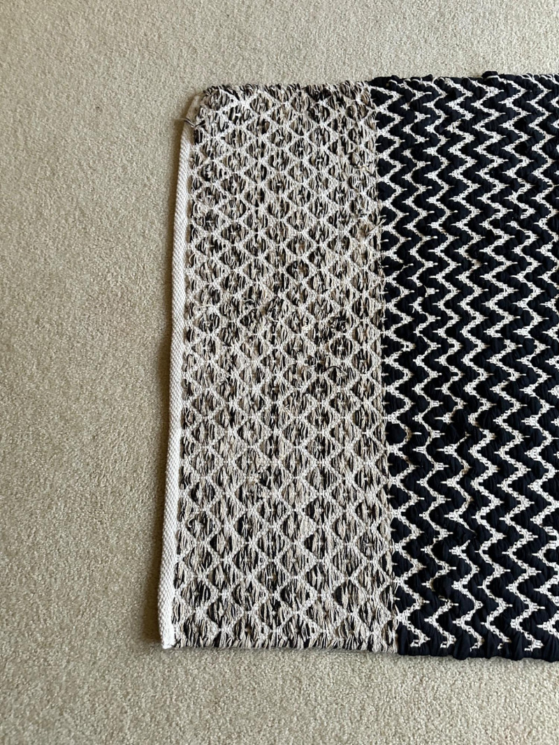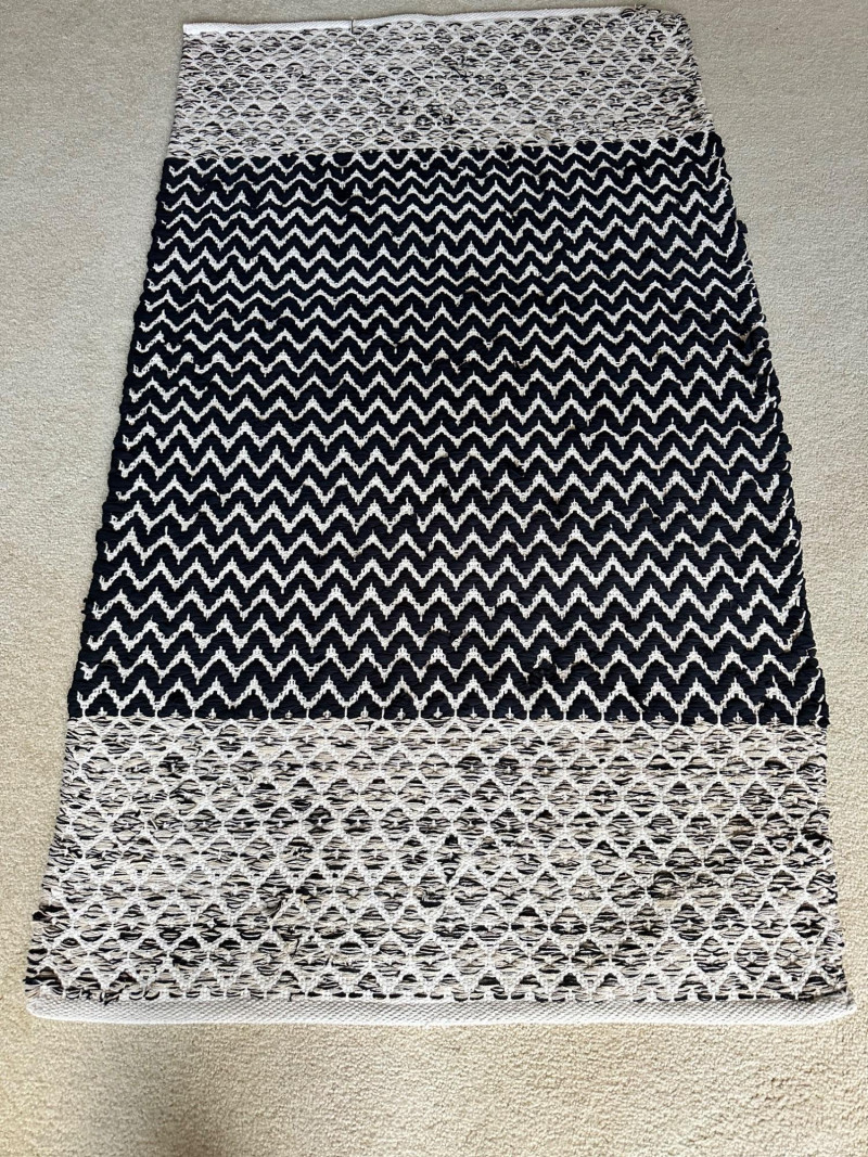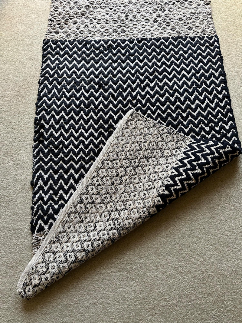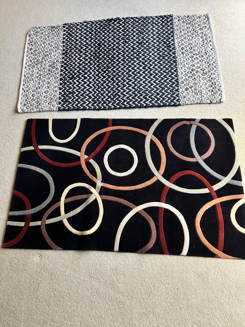 Two contemporary rugs: one in bold black‑and‑white geometric patterns and one in rich multicolor looping motifs. Braided Black- 62.5 L x 36 W Multi-Black- 59 L x 36 W