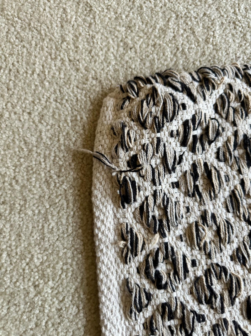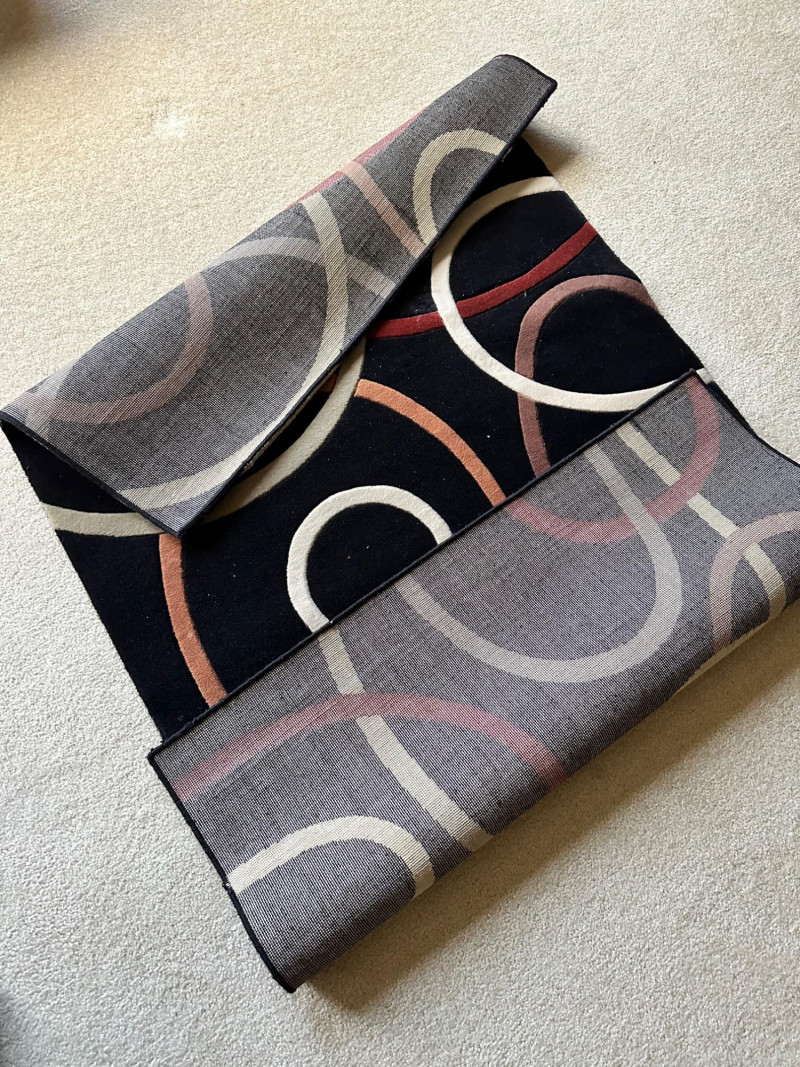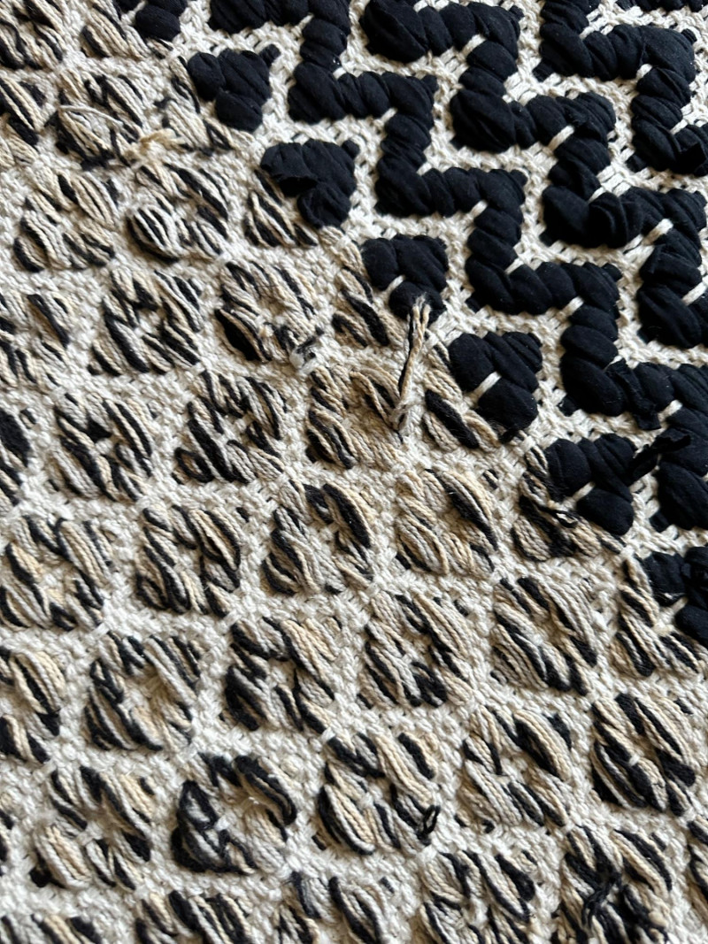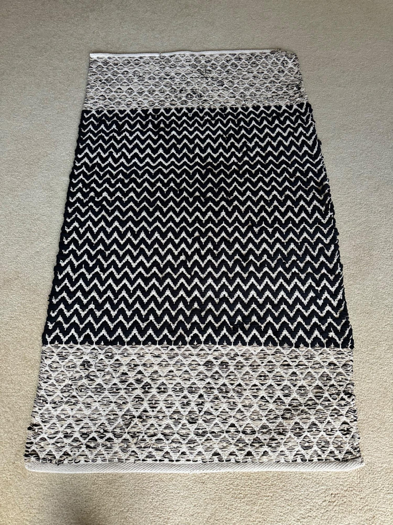 Two contemporary rugs: one in bold black‑and‑white geometric patterns and one in rich multicolor looping motifs. Braided Black- 62.5 L x 36 W Multi-Black- 59 L x 36 W