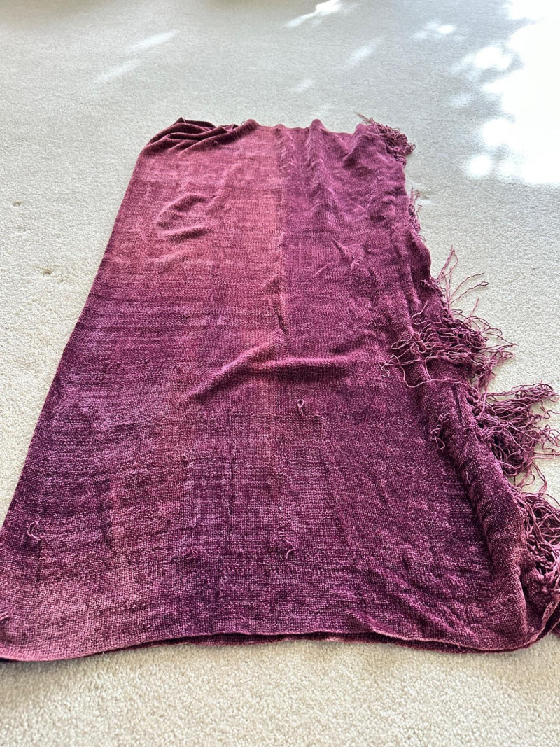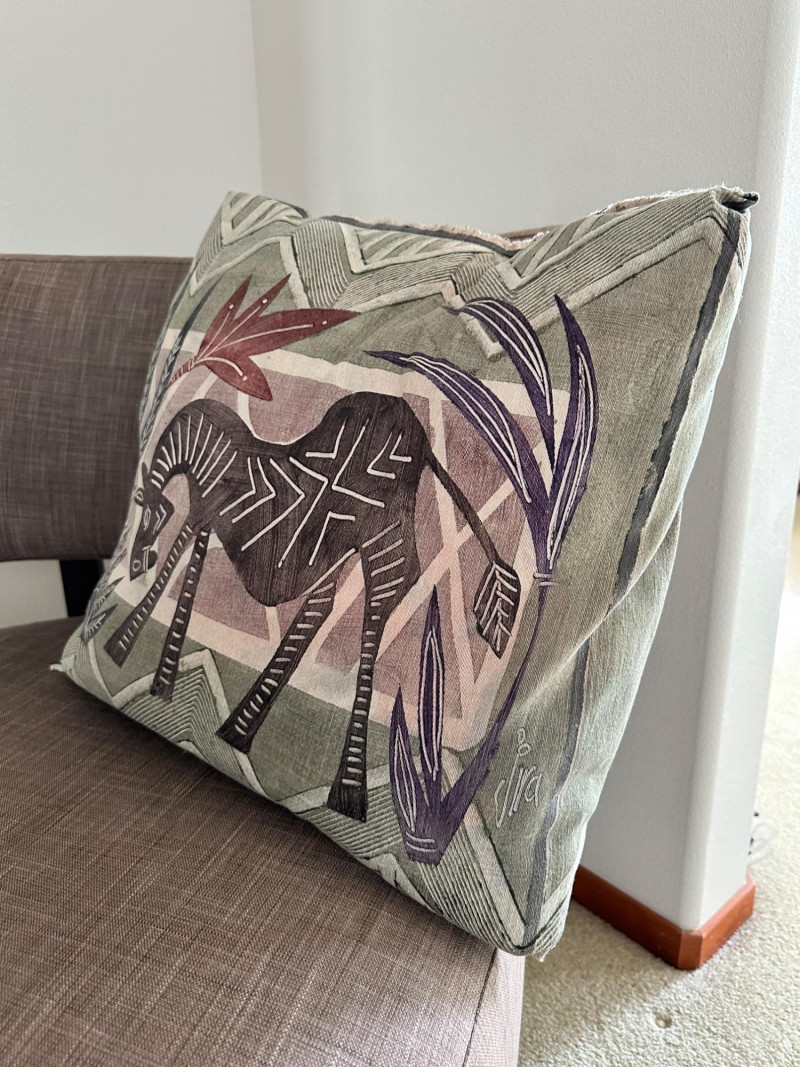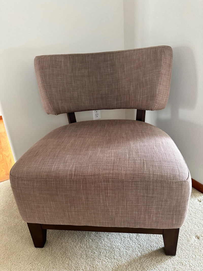 Armless upholstered accent chair in a warm light‑brown fabric with dark wooden legs. Includes a decorative pillow featuring a stylized animal motif and a textured maroon throw draped over the back. A cozy, neutral piece ideal for a bedroom corner, reading nook, or living space.