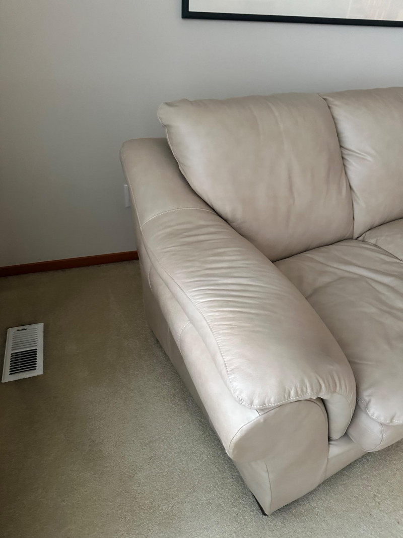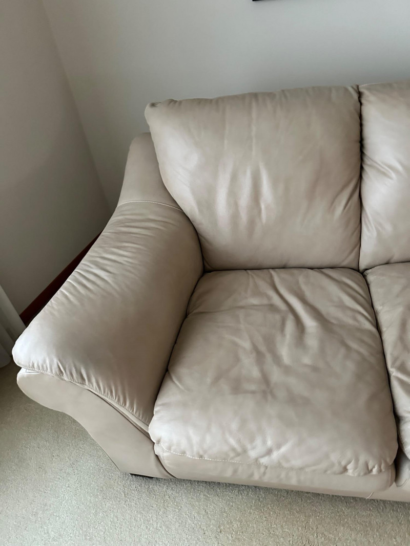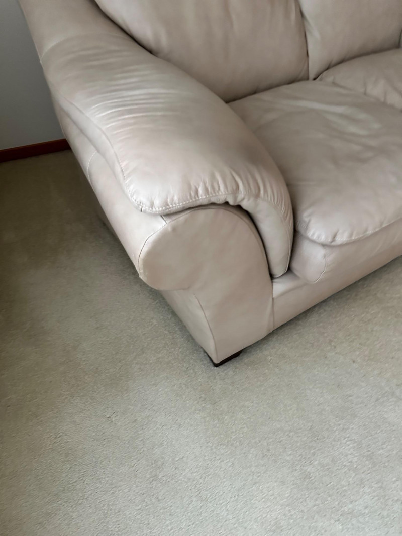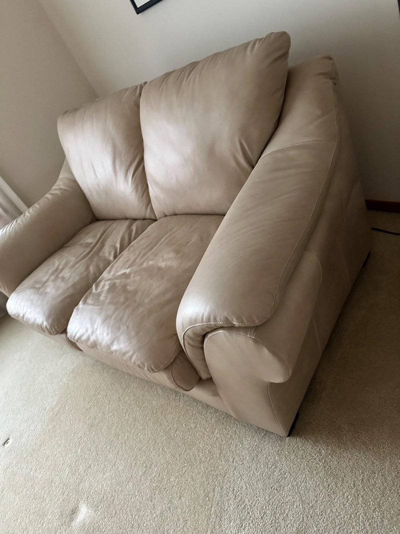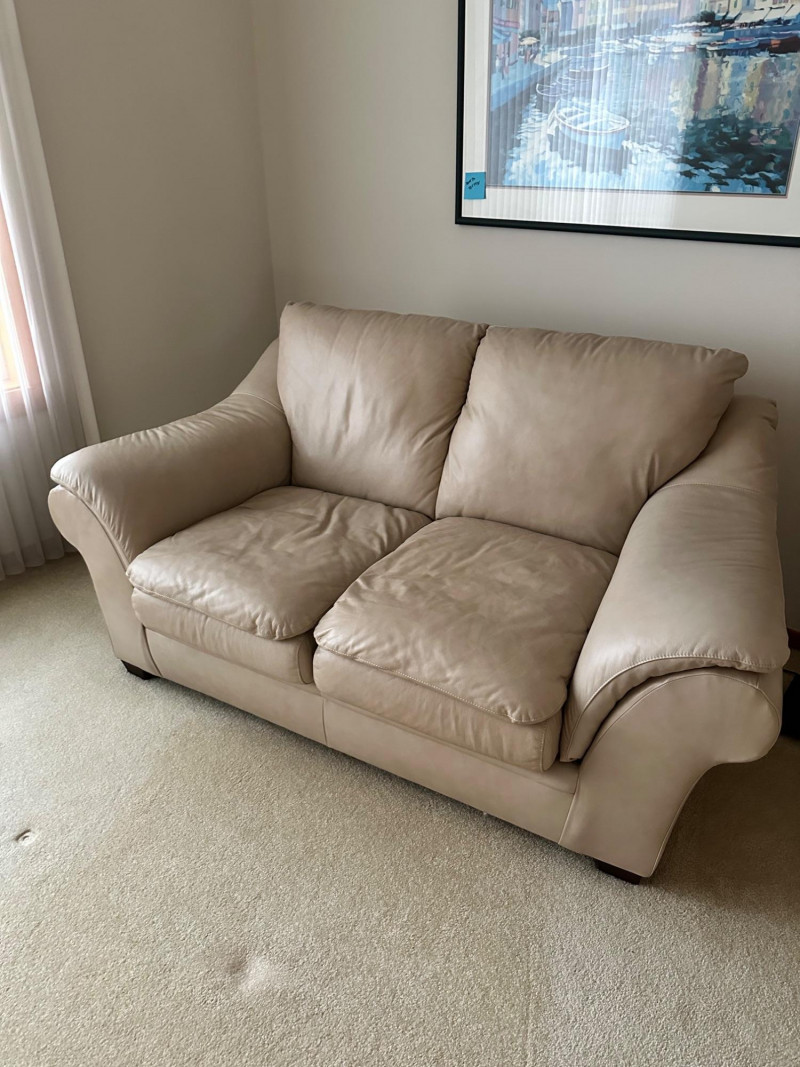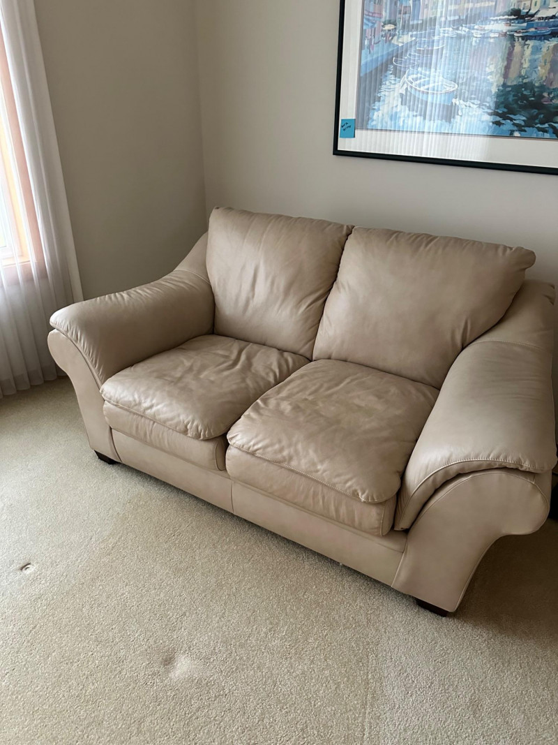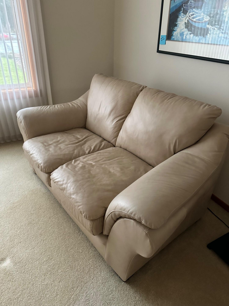 Beige leather loveseat with two seat cushions, two back cushions, and wide padded arms. Clean, neutral, and comfortable—ideal for a living room, den, or reading nook. MATCHES CHAIR AND COUCH PICKED UP AFTER HOUSE SELLS- OWNER USING IT FOR STAGING