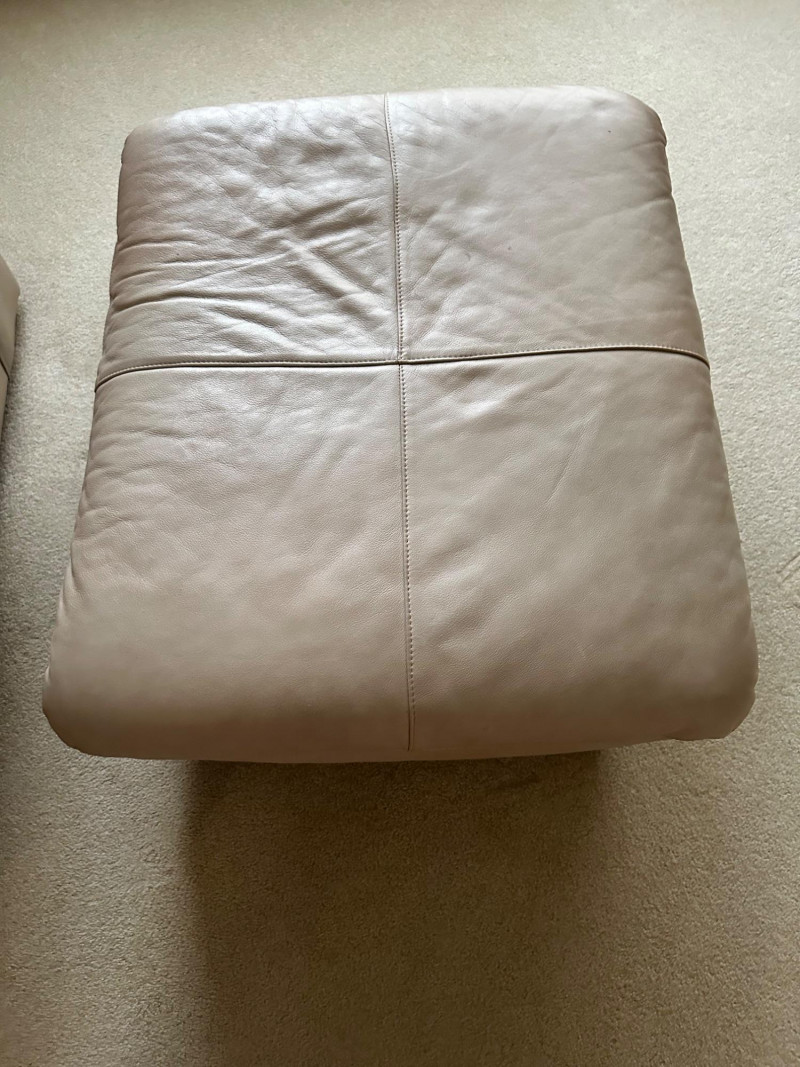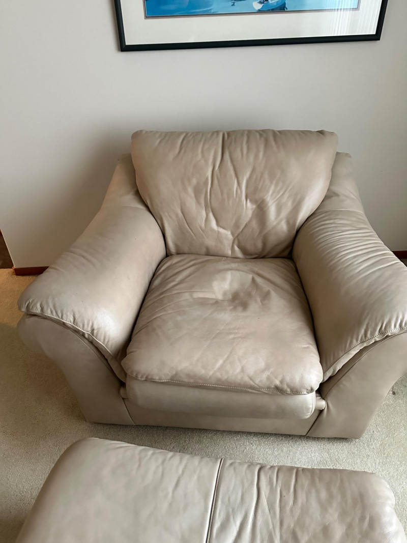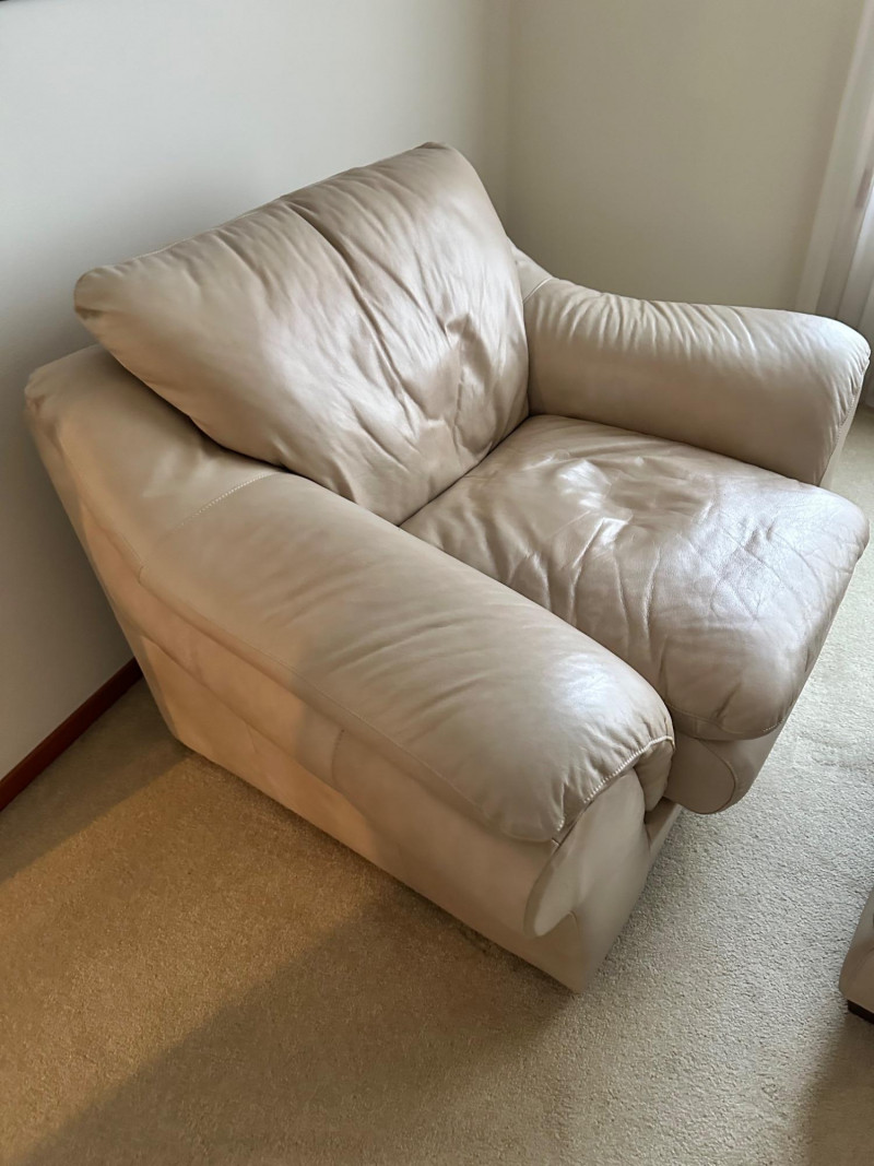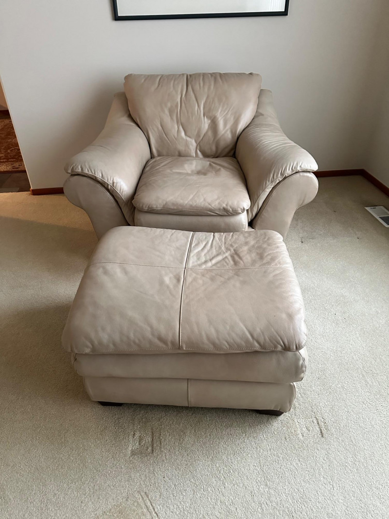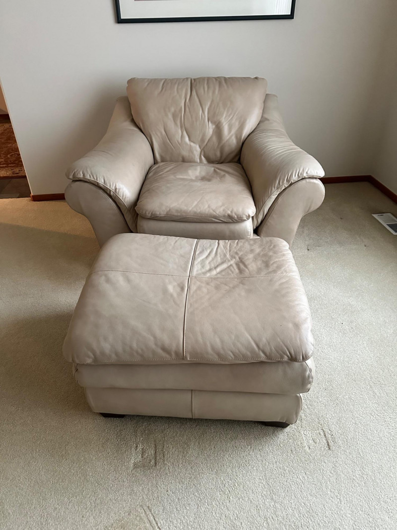 Comfortable beige leather armchair with wide padded arms and plush cushioning, paired with a matching upholstered ottoman. A cozy, neutral set ideal for a reading nook, living room, or den. THIS ITEM WILL BE PICKED UP AFTER THE HOUSE SELLS, SELLER IS USING IT FOR STAGING