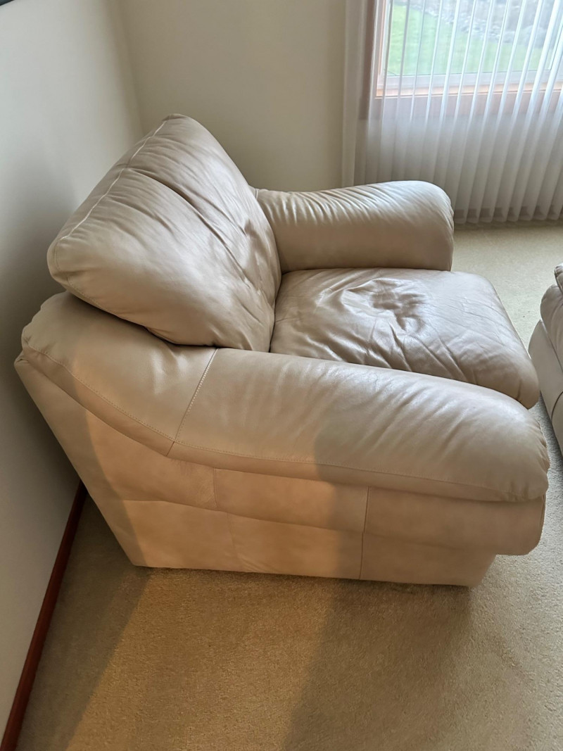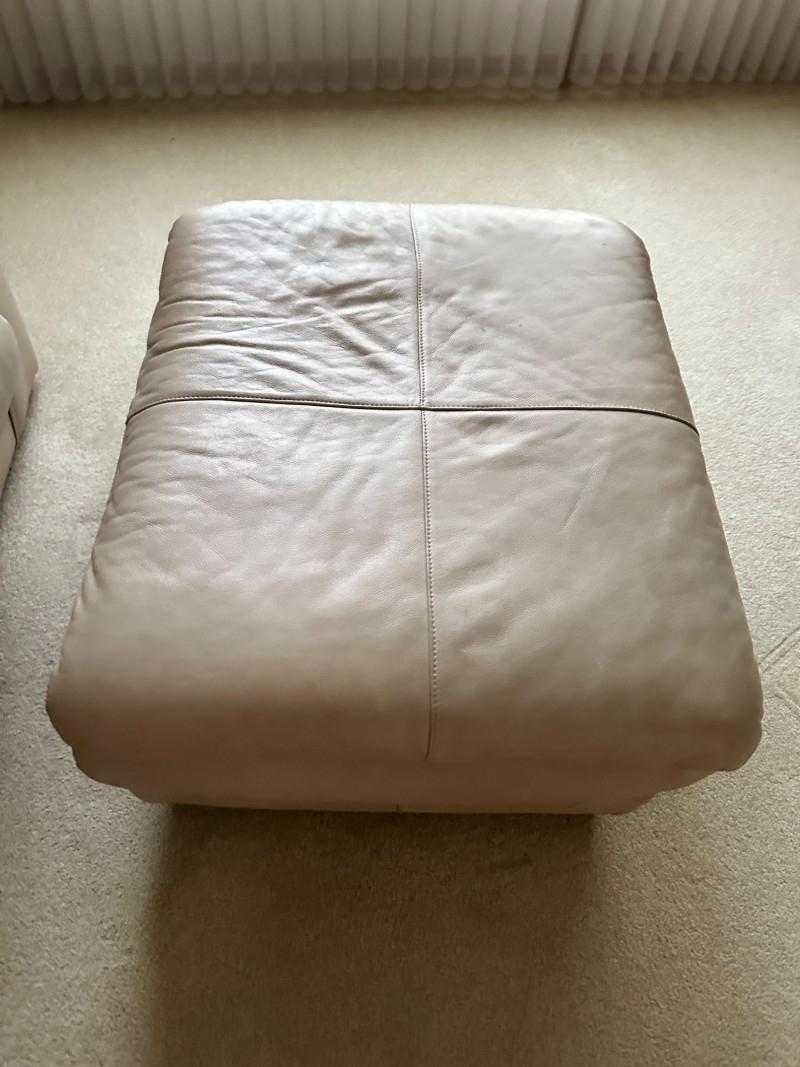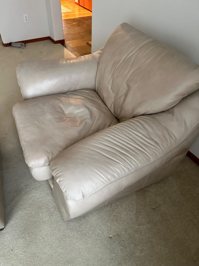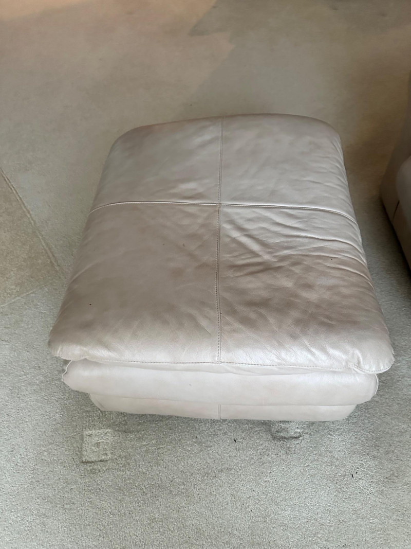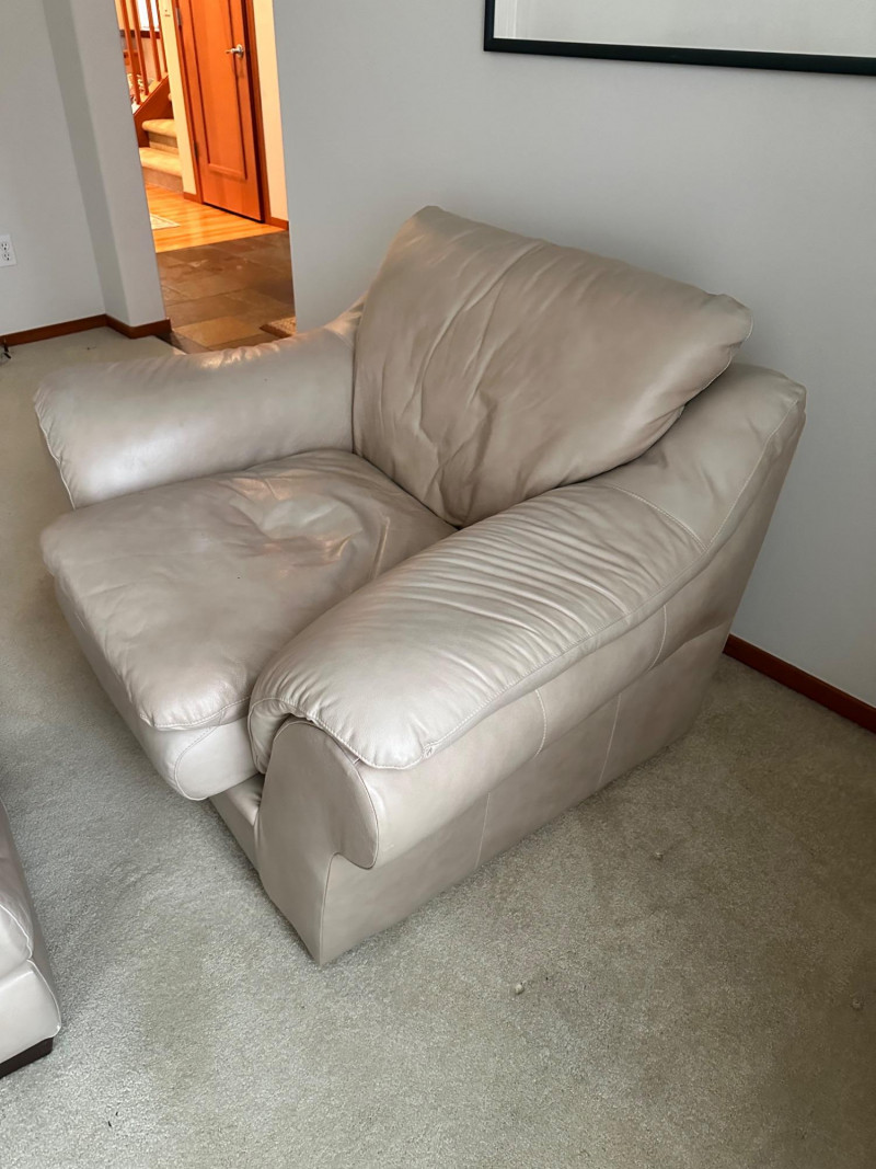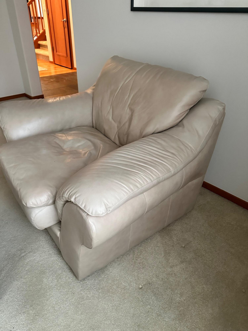 Comfortable beige leather armchair with wide padded arms and plush cushioning, paired with a matching upholstered ottoman. A cozy, neutral set ideal for a reading nook, living room, or den. THIS ITEM WILL BE PICKED UP AFTER THE HOUSE SELLS, SELLER IS USING IT FOR STAGING