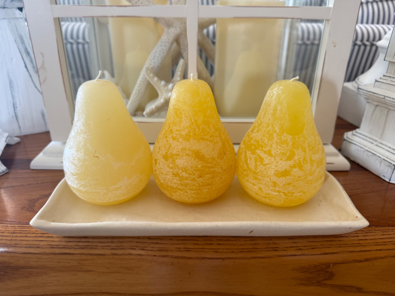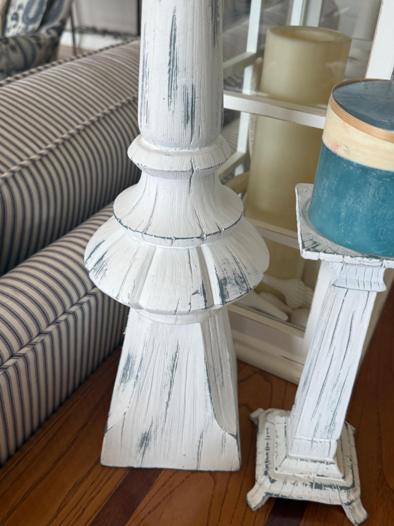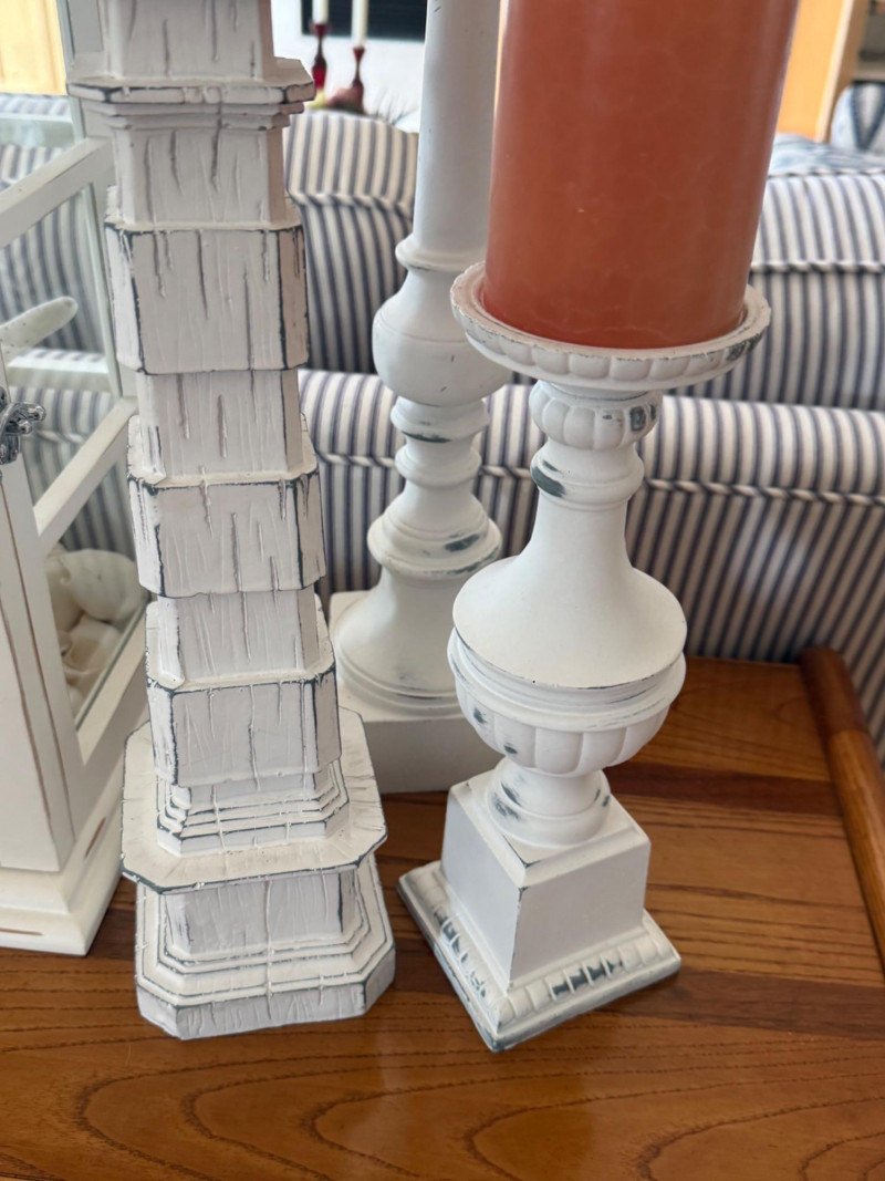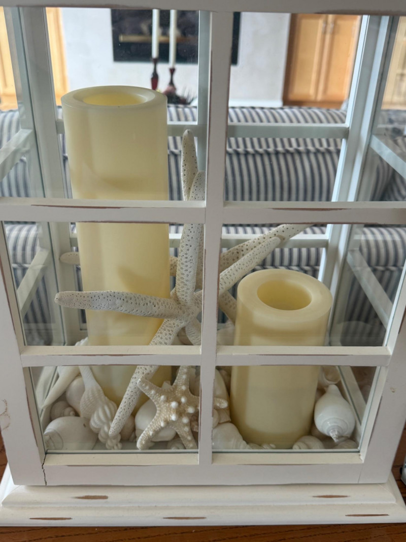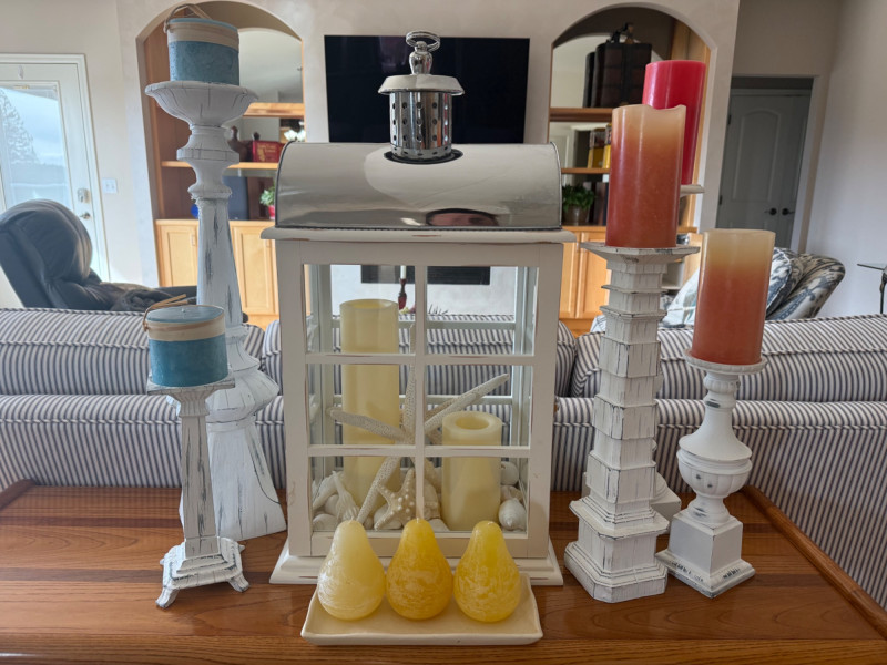 Group includes a Pottery Barn lantern with metal top and glass sides, filled with pillar candles and shell décor. Also includes four distressed white candlestick holders in graduated heights, each with a colored pillar candle. Three pear‑shaped candles are placed on a small tray. Comes with candles and shell decor. Lantern is 26” h x 9.25” d x 14” w. Candlesticks are 10.5”-24” tall.