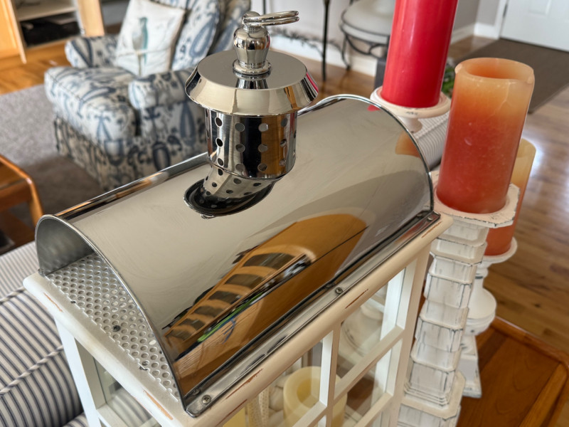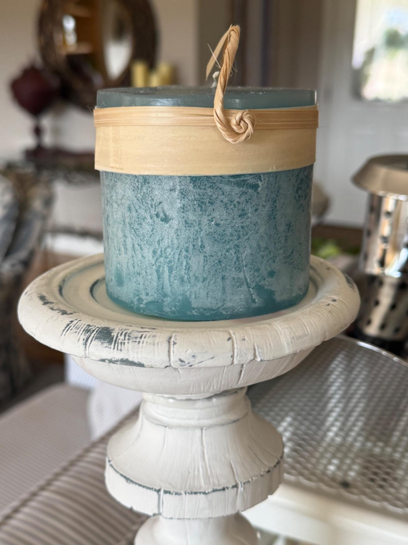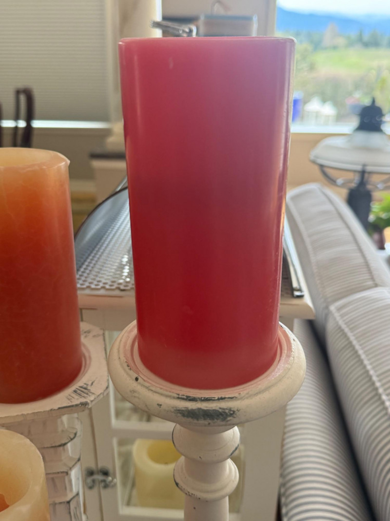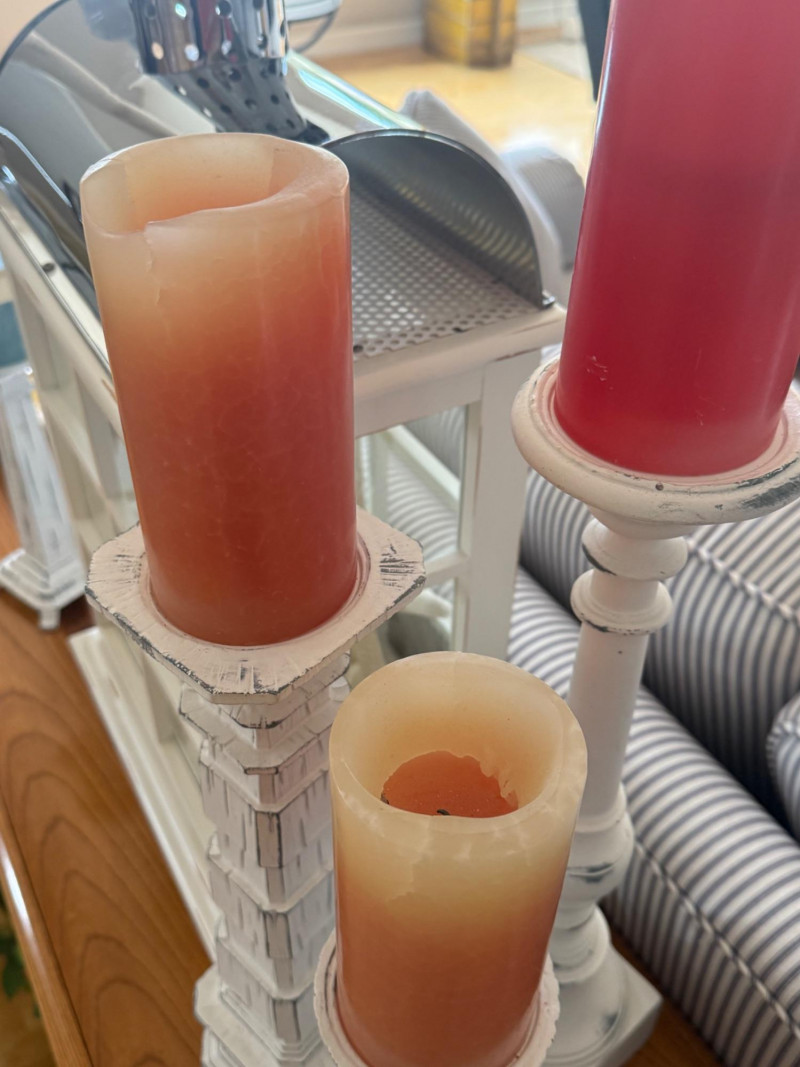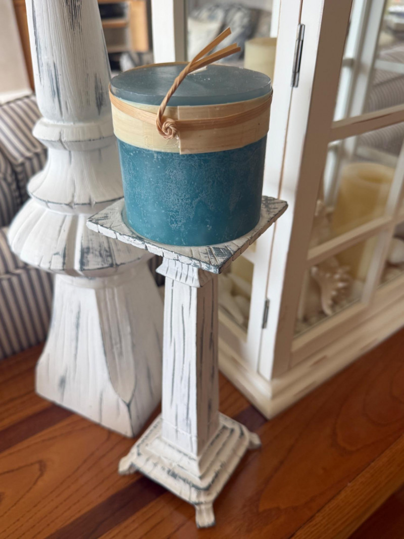 Group includes a Pottery Barn lantern with metal top and glass sides, filled with pillar candles and shell décor. Also includes four distressed white candlestick holders in graduated heights, each with a colored pillar candle. Three pear‑shaped candles are placed on a small tray. Comes with candles and shell decor. Lantern is 26” h x 9.25” d x 14” w. Candlesticks are 10.5”-24” tall.