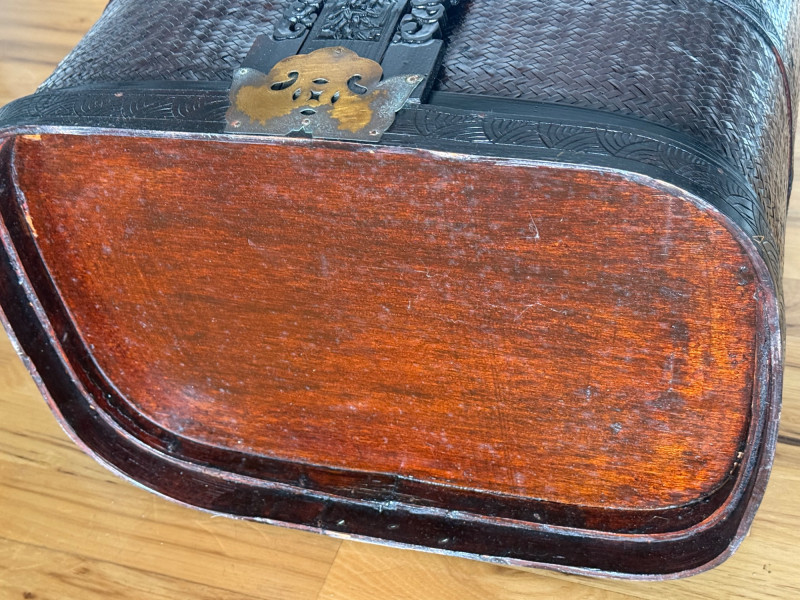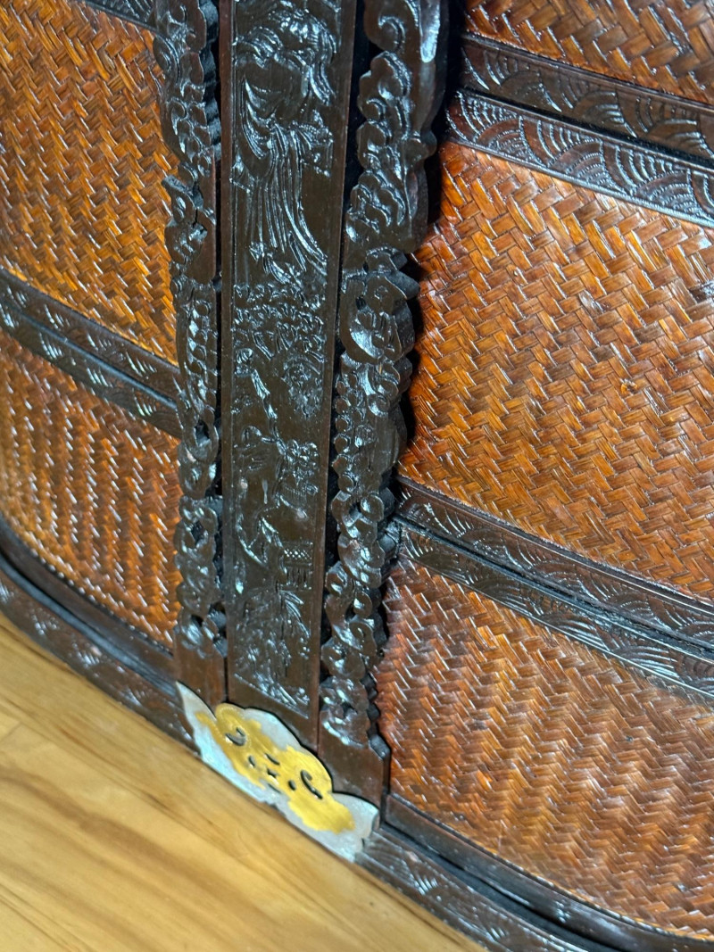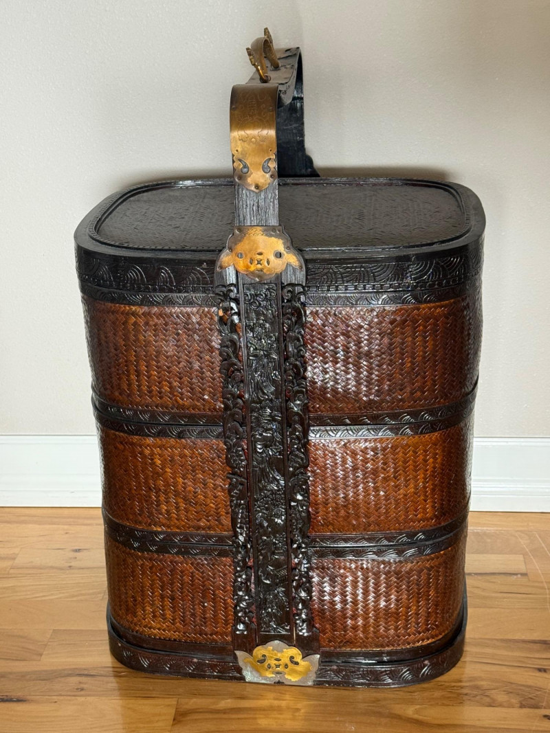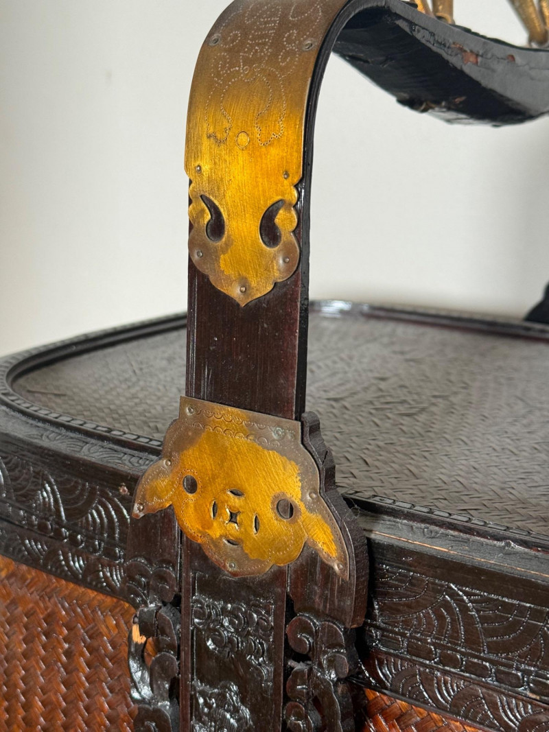 A large, traditional Asian woven storage basket featuring finely woven bamboo or rattan panels set into a dark wood frame. The piece is decorated with carved floral and symbolic motifs and reinforced with ornate brass or bronze fittings around the top, middle, and base. It includes a hinged wooden handle with metal embellishments, typical of baskets used historically for wedding gifts, ceremonial offerings, or household storage.