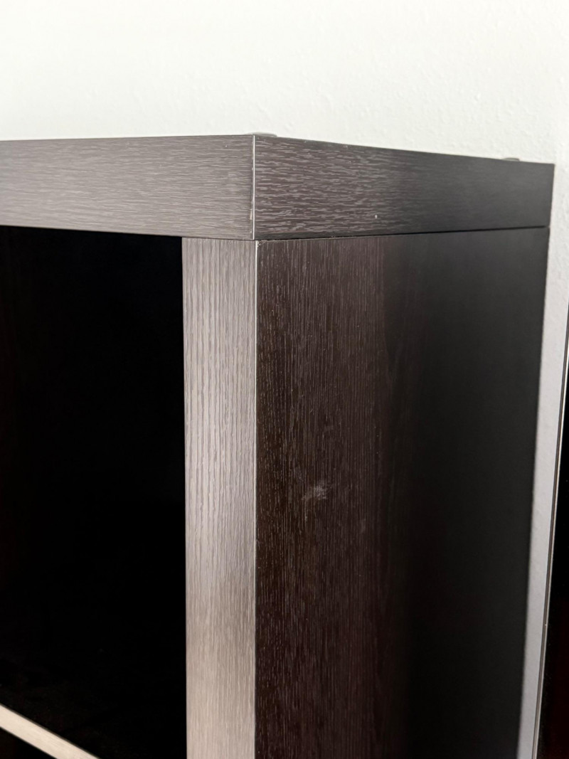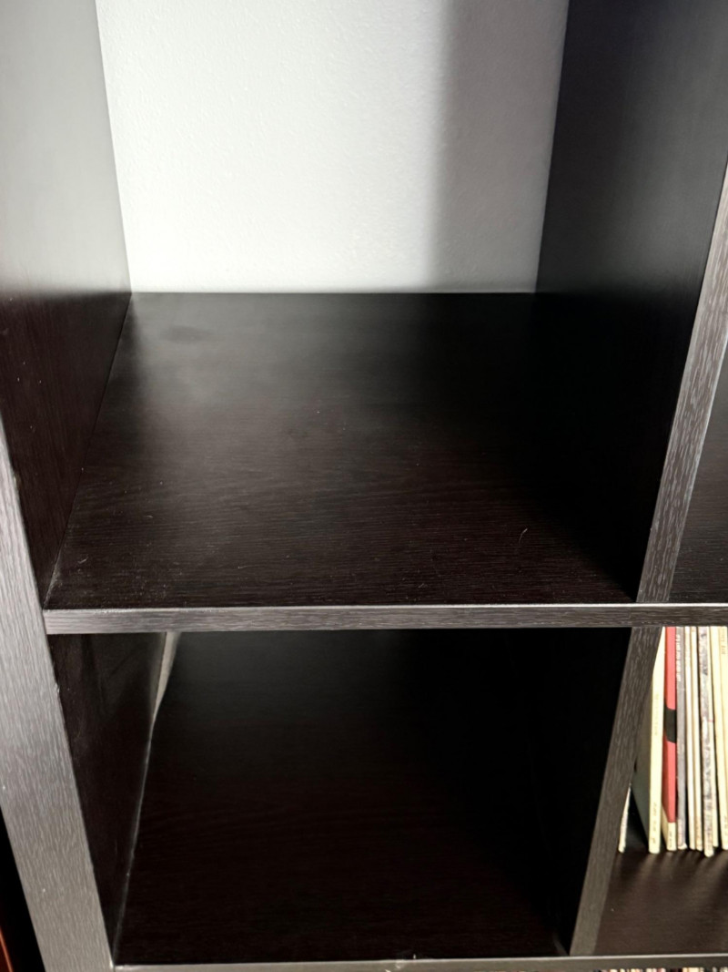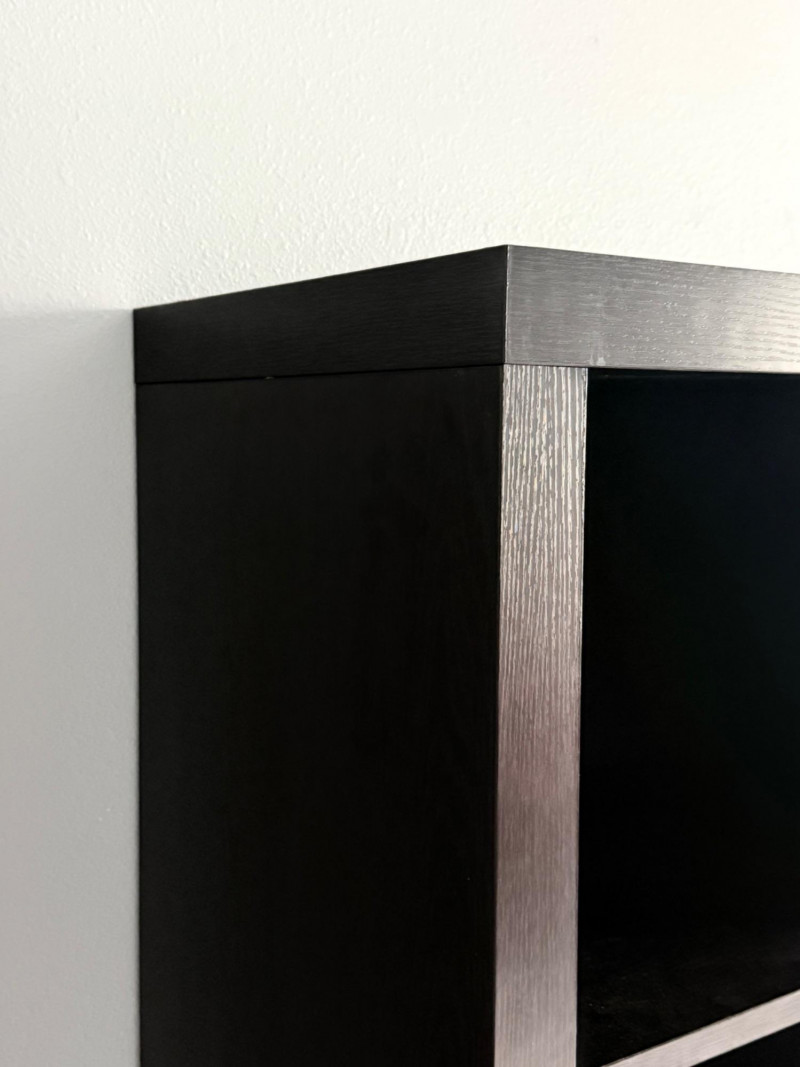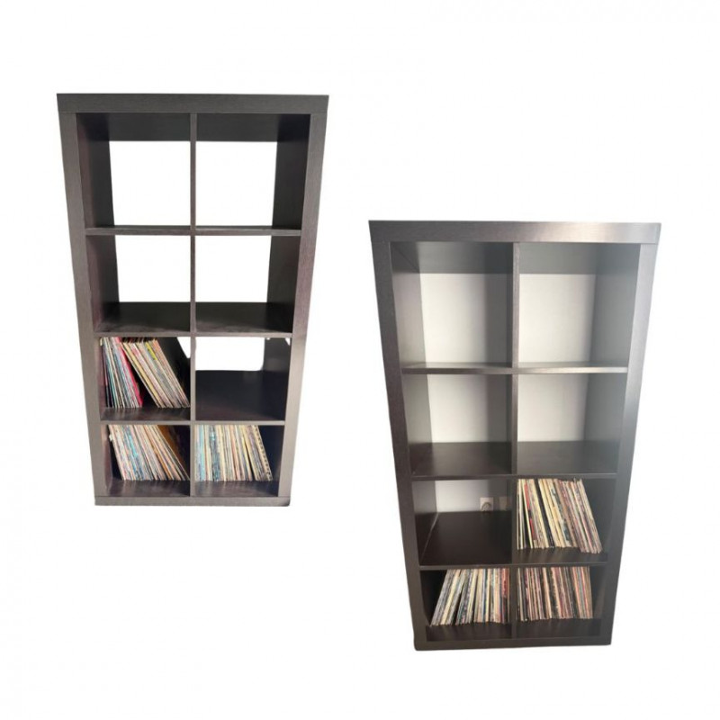 Pair of matching black composite‑wood cubicle shelves, each with eight square compartments arranged in a 2×4 grid. Both units have a flat top surface and open‑front cubbies suitable for storage or display. Light wear consistent with normal household use.