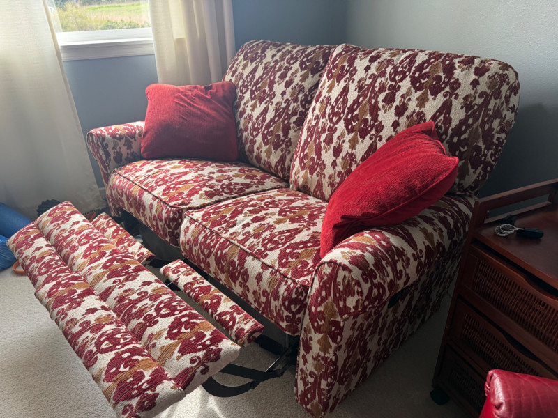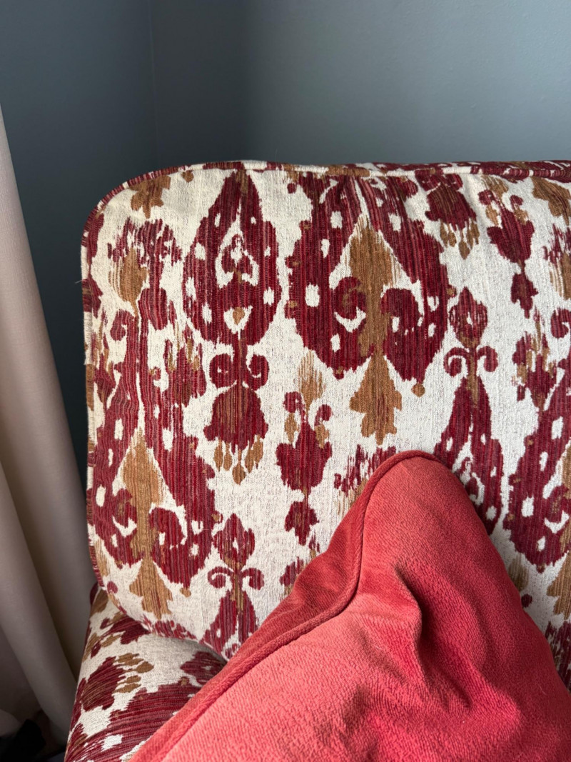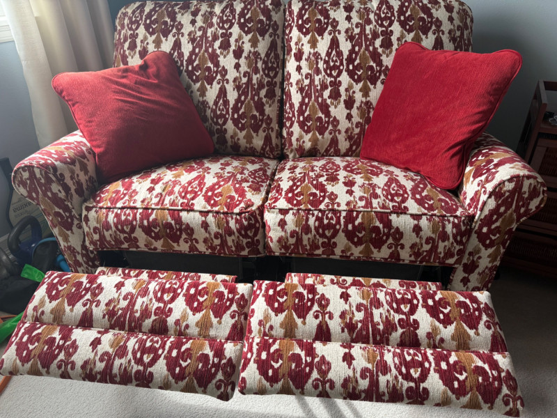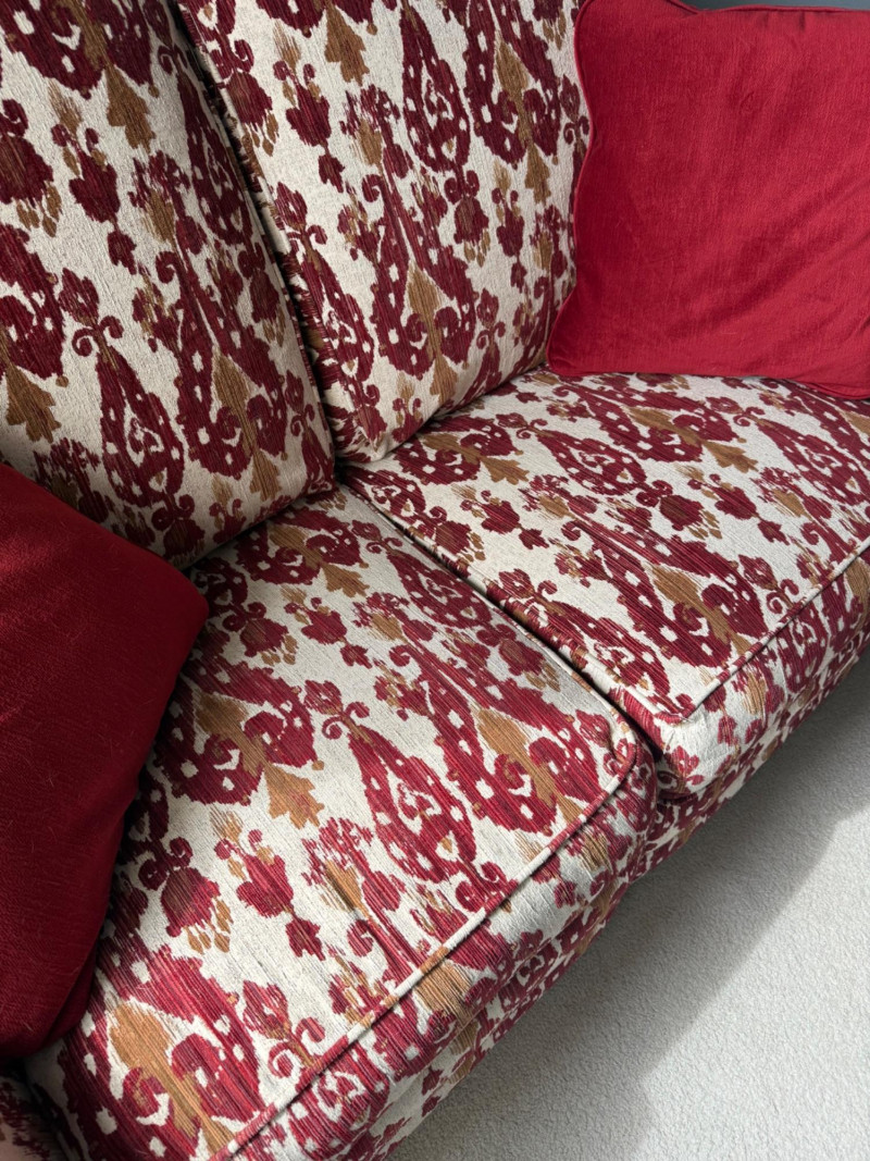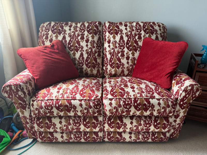 A small upholstered loveseat with a red and beige patterned fabric. It has two seat cushions and two back cushions, all in matching upholstery. The piece includes two solid red throw pillows for contrast. Compact in size, it fits well in smaller living rooms, bedrooms, or reading nooks. Seat height is 18”. In good condition.